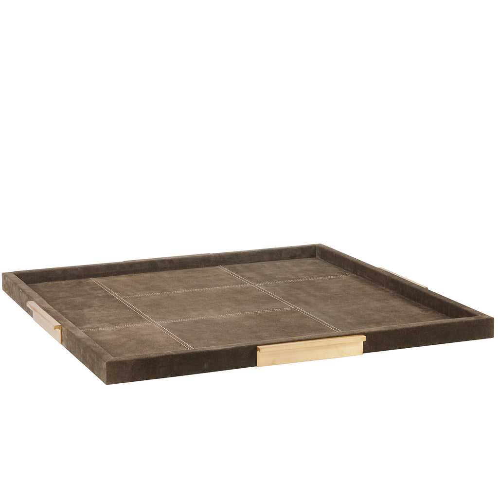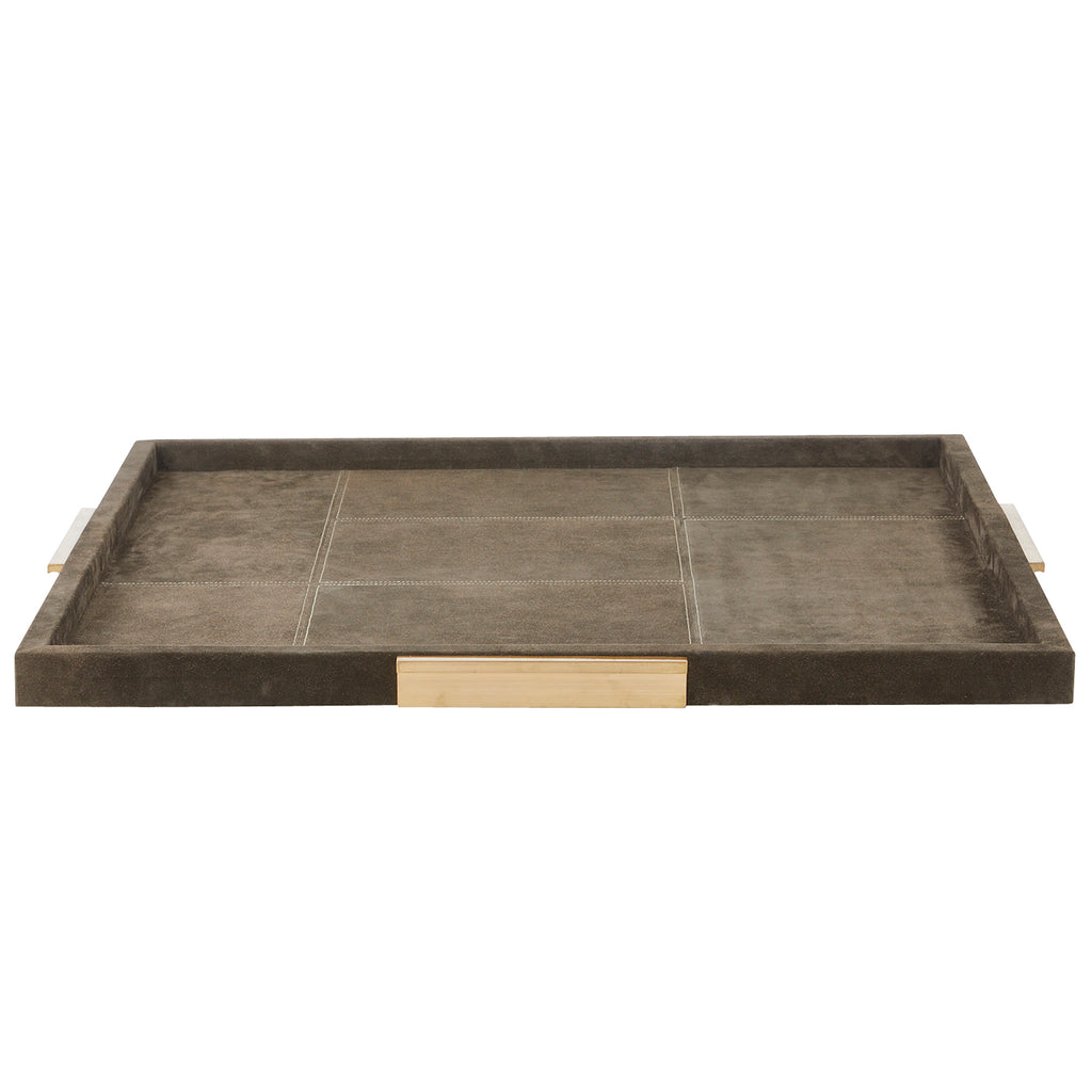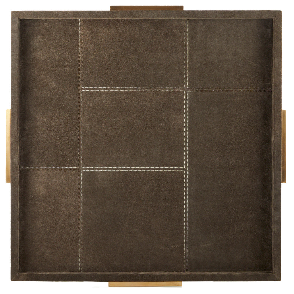 Adorned with asymmetric patchwork stitching, an oversized tray of moss-gray suede makes an impactful addition to any surface. Finished with four antique brass steel handles for easy mobility. Finish will vary.