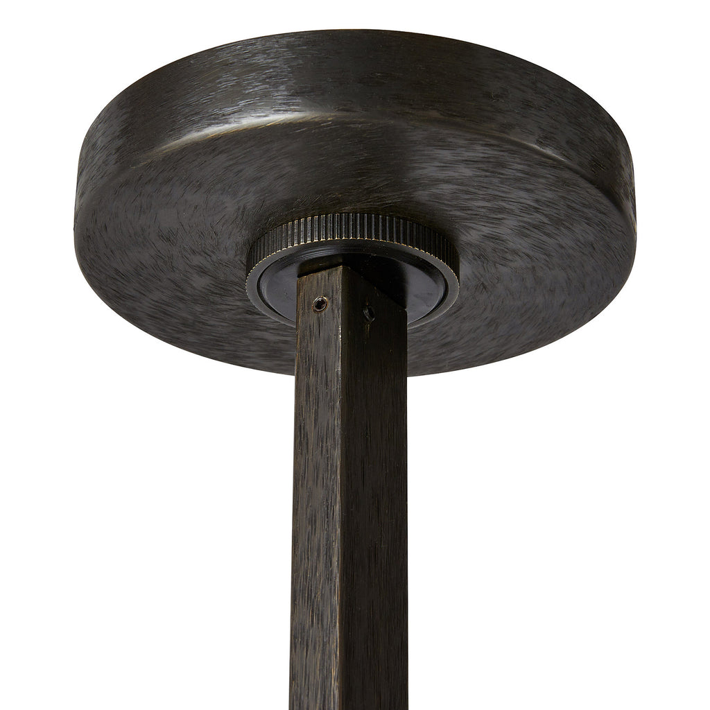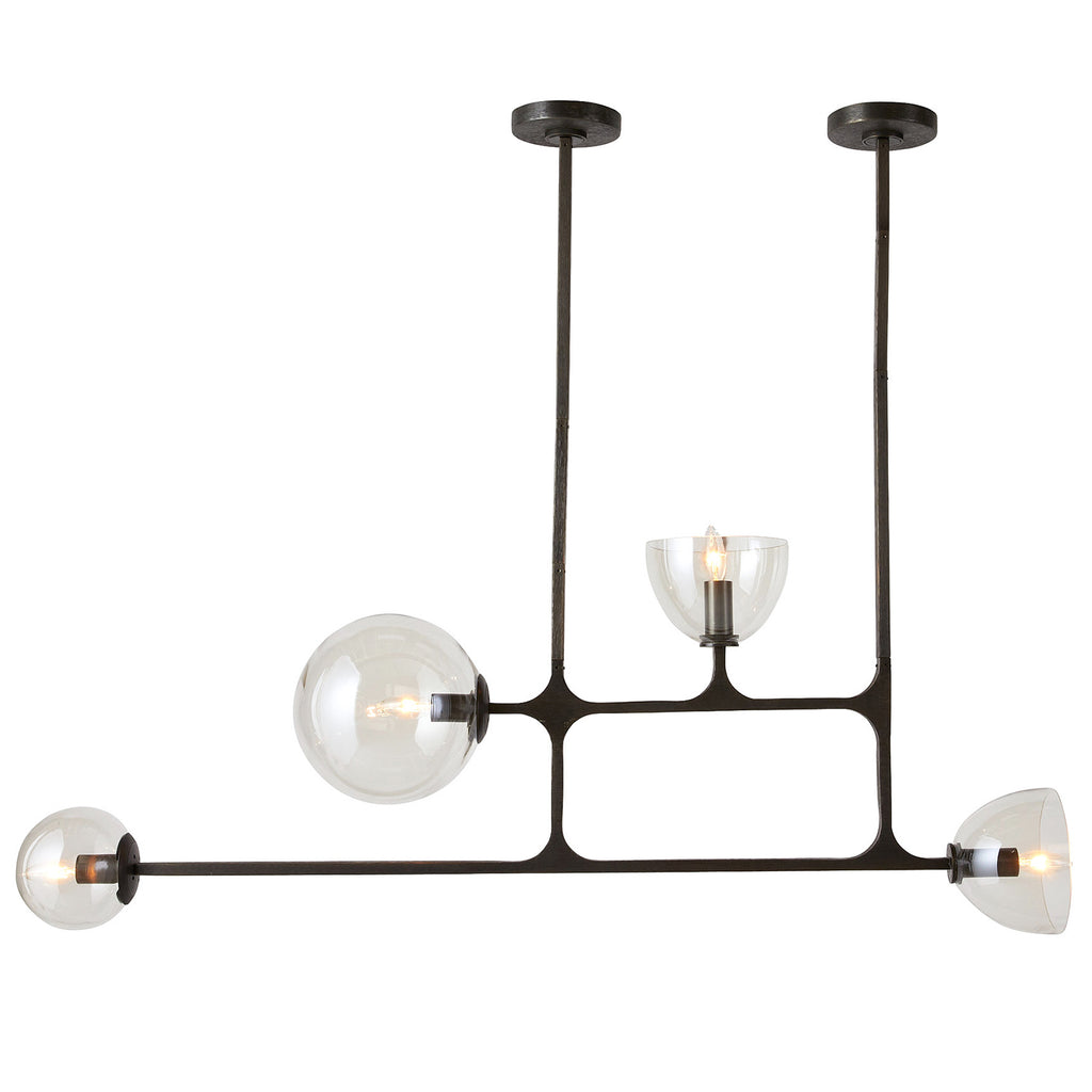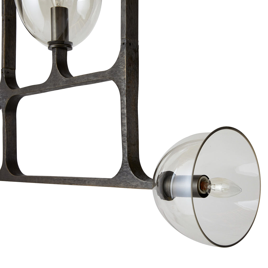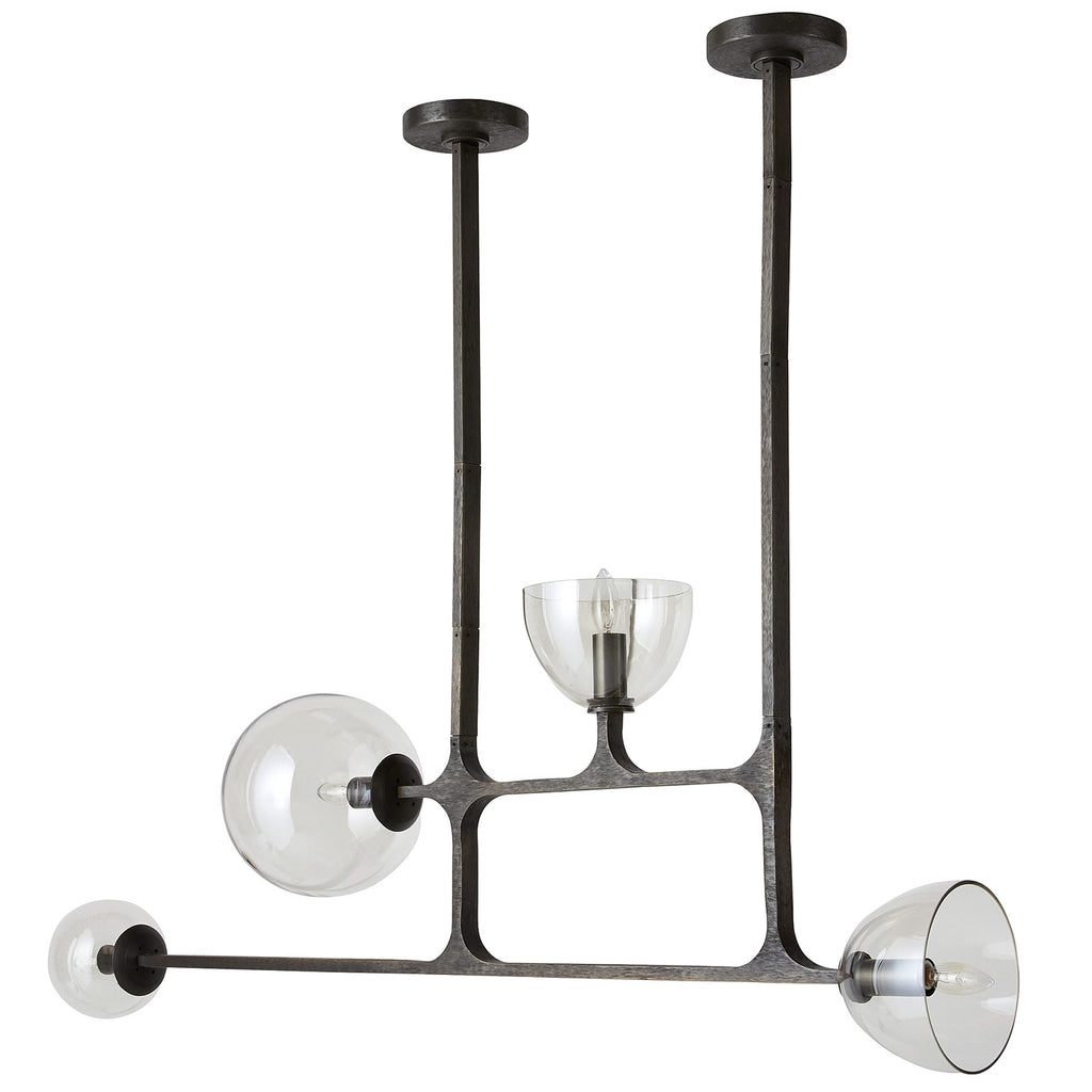 Smoke glass globes and shades make a playful mix on a sculptural chandelier. Two globes and two shades are elegantly displayed on an l-shaped support of chattered english bronze iron. Interlocking into an artistic form, this linear style was designed to illuminate longer surfaces. Finish will vary.