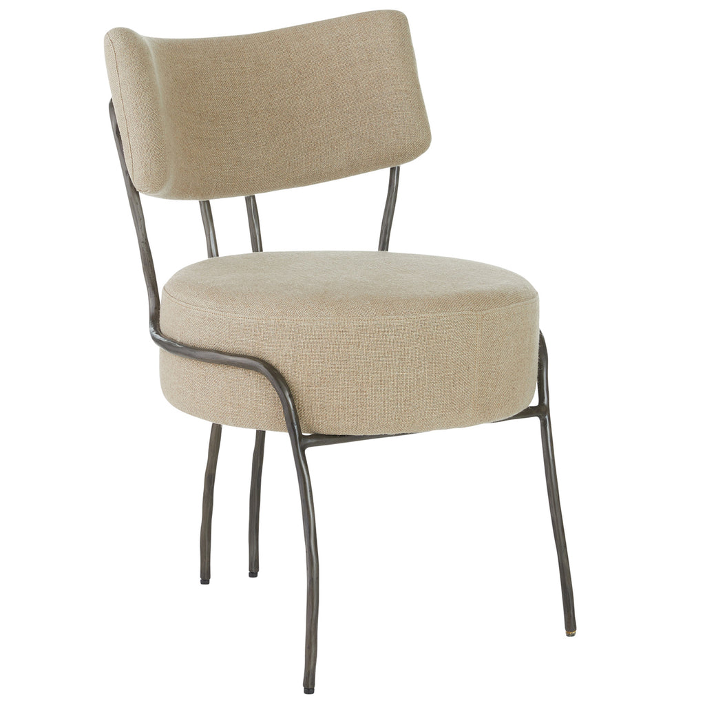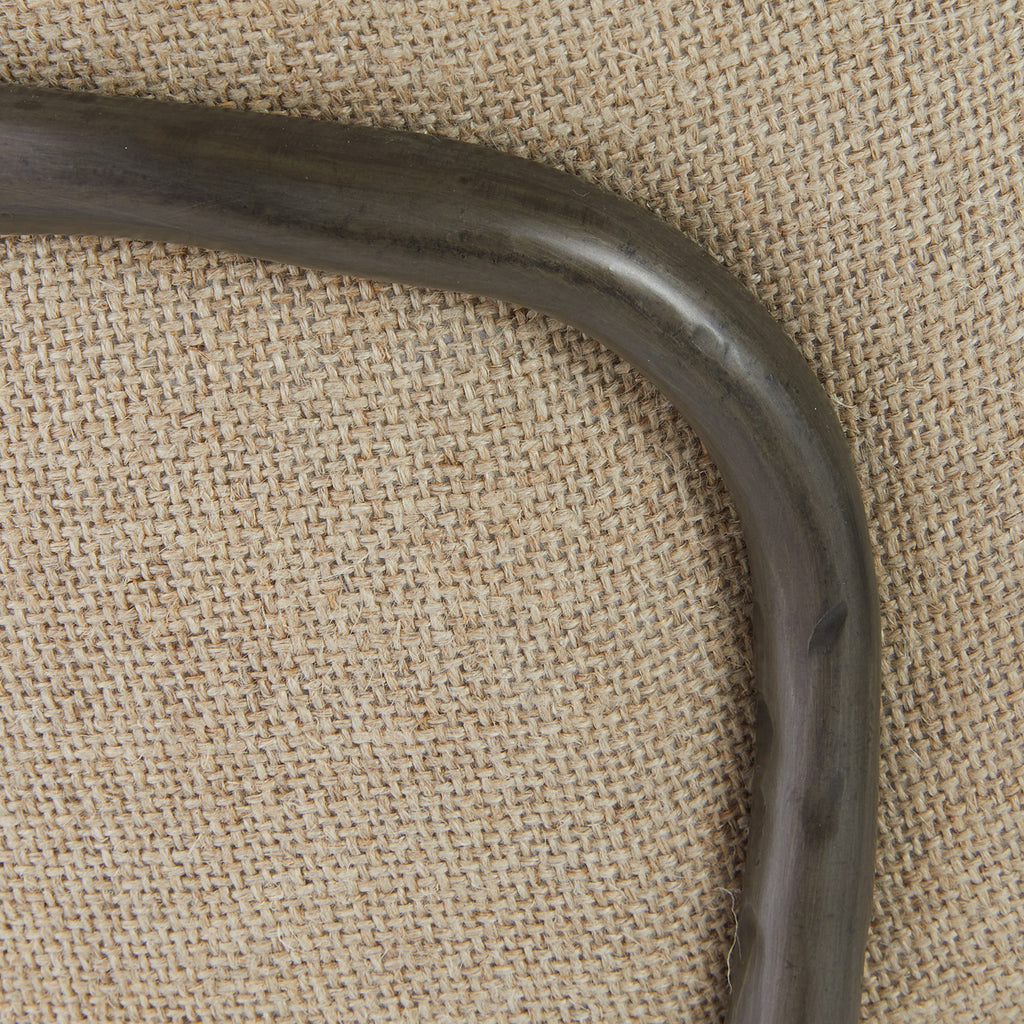 Flowing lines and textural details elevate an armless chair of natural iron and oatmeal linen. The Arteriors Enid Chair’s airy organic form is juxtaposed with a barrel seat and curved backrest, all in a soothing palette to please the eye. A stylish back clasp detail with added handles allows you to float this style at any point in a room. Finish will vary.