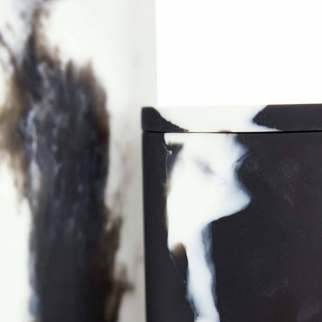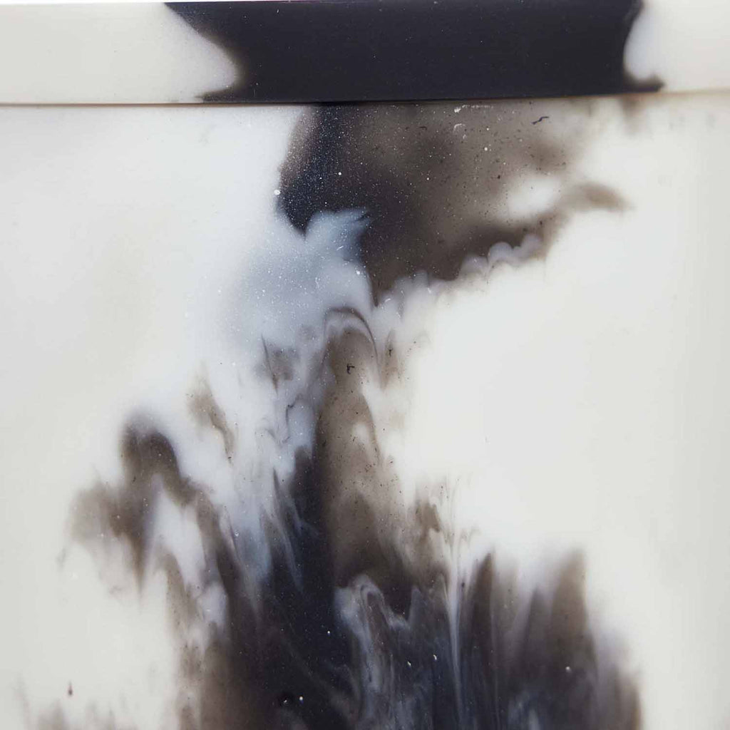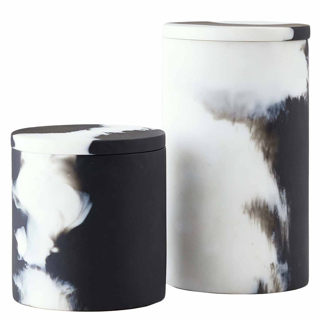 The Arteriors Hollie containers explore the concept of yin and yang by reversing color. A high-contrast combination of black and white sweep the resin vessels, each with its own distinct pattern. The pair of round containers is sure to stun in any space. Finish will vary.