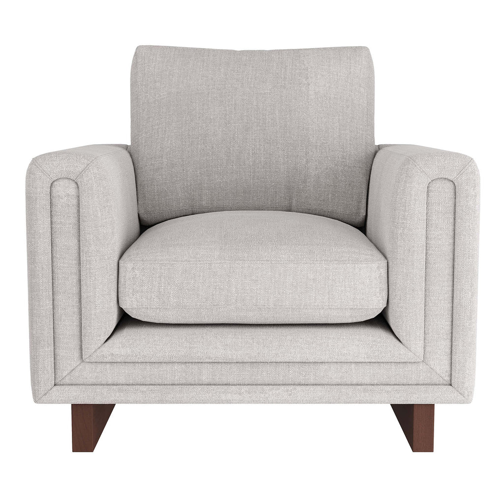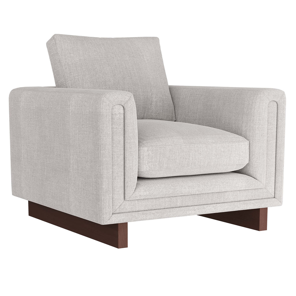 Modern and timeless, an extension of the Arteriors Lovell sofa offers a new take on the tuxedo silhouette. The focal point of this chair's design is its wrap-around, cushioned arms, which add a sophisticated detail. Fully upholstered, the handsome frame rests on exposed wooden sled legs in a dark walnut finish. Tailored, yet comfortable, with fiber-down cushions and generous proportions. Finish will vary.