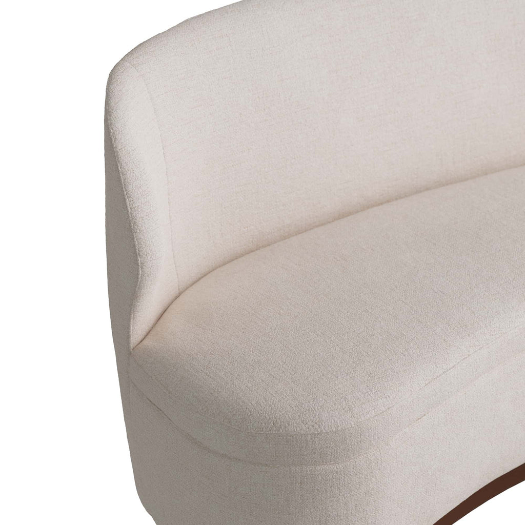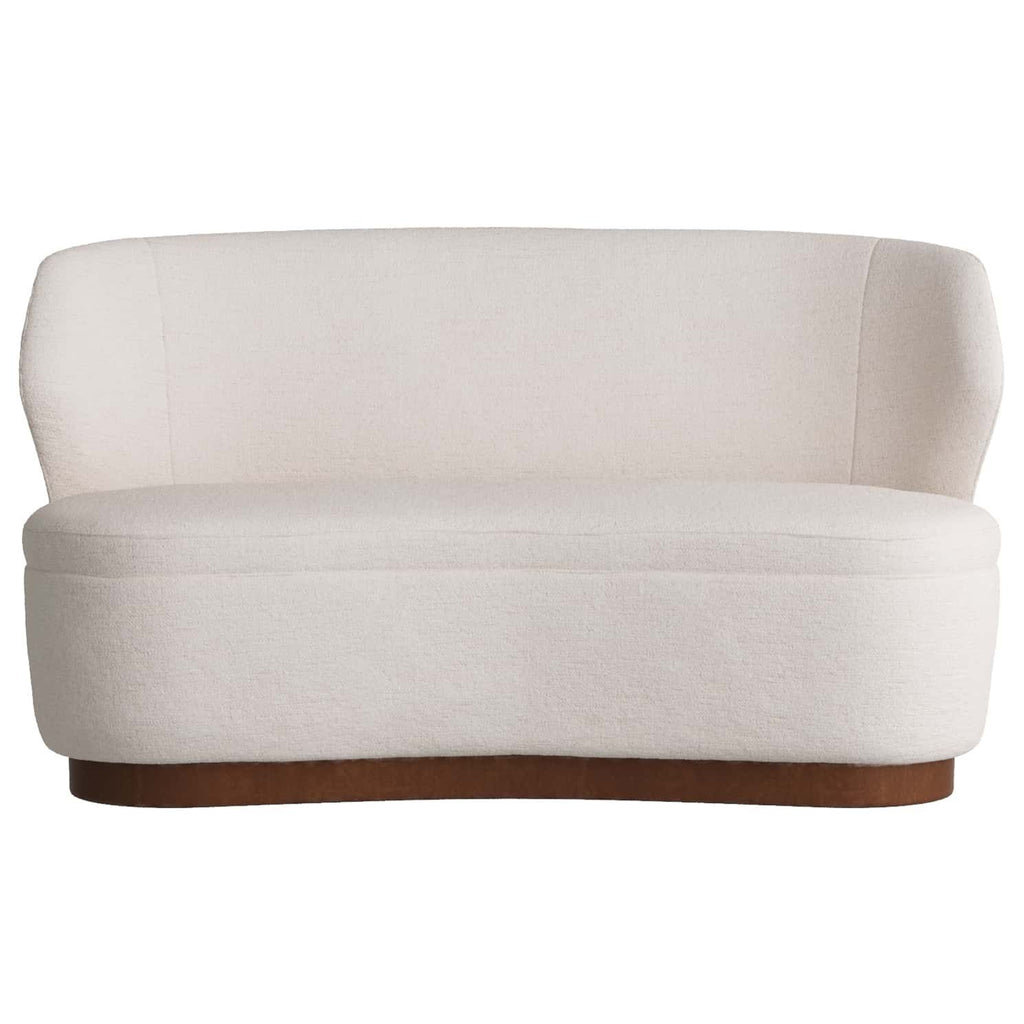 The curvaceous Arteriors Pasadena settee takes its influence from hollywood regency design, but gets a modern refresh with winged lines, cloud boucle upholstery, and a dark walnut plinth—a perfect union of past and present. The angular loveseat’s small-scale and low profile make it a striking choice for both lounging and dining.