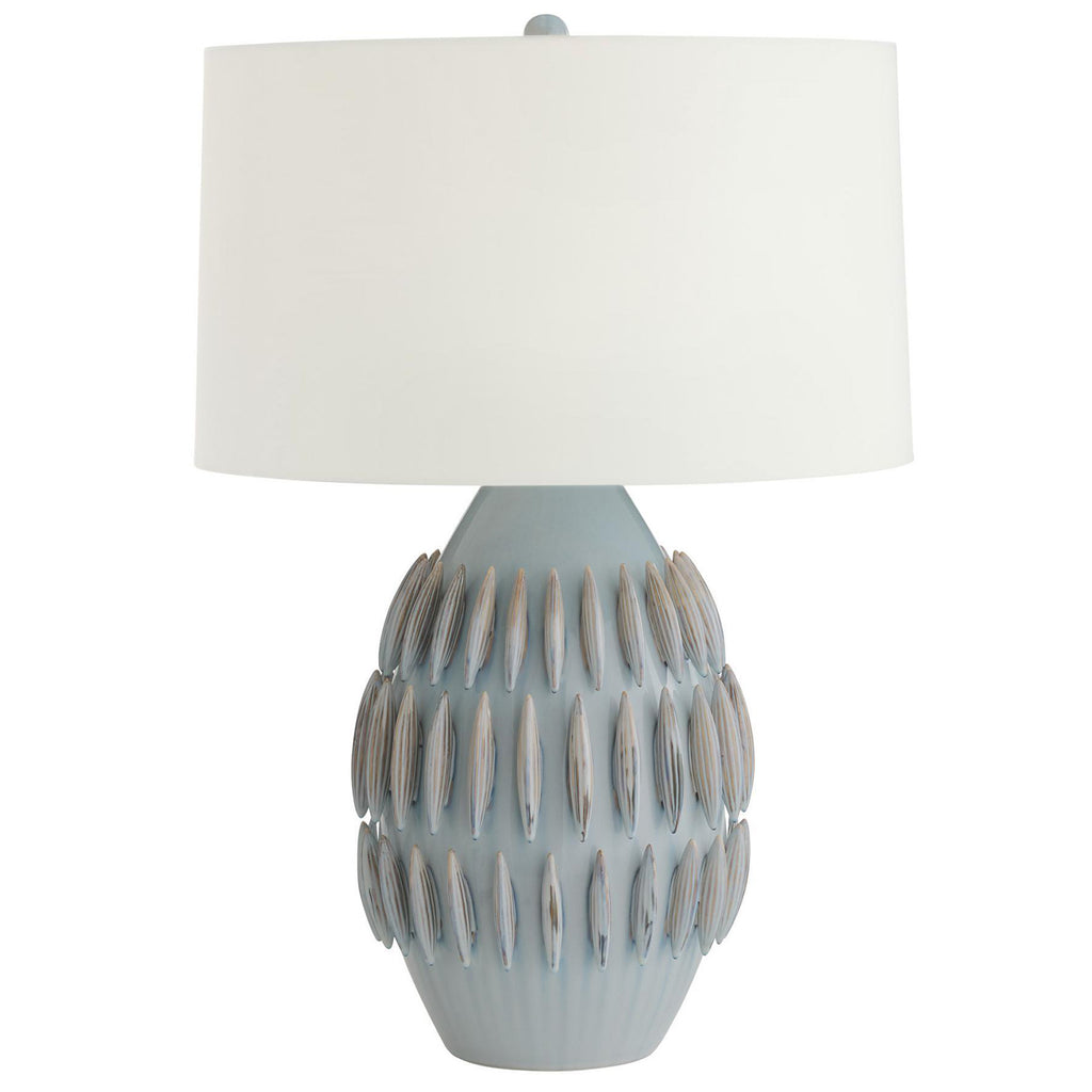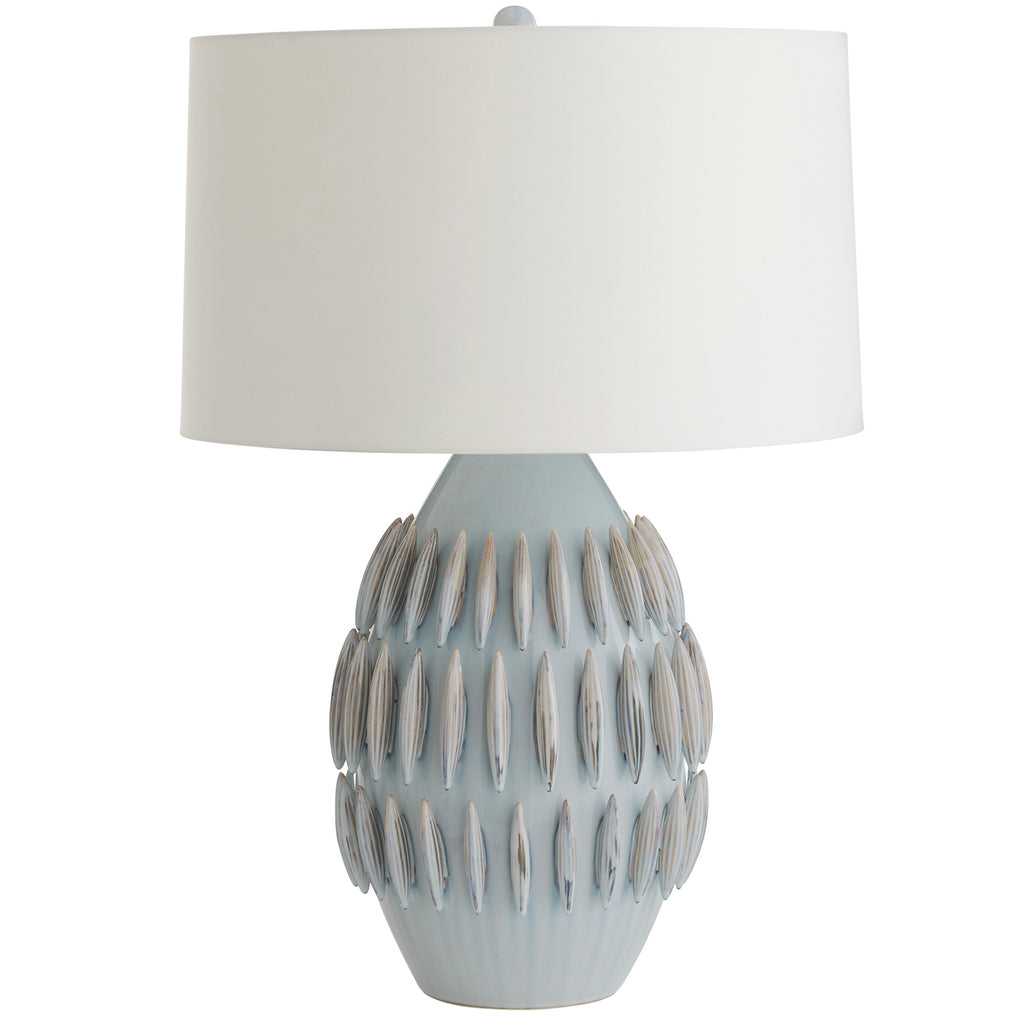 Arteriors Home lighting embodies the perfect balance of form and function, creating an ambiance that is both captivating and inviting. From classic designs to contemporary styles, each Arteriors Home table lamp is carefully crafted with attention to detail and showcases our passion for artistic expression. With botanic, seed-pod inspiration, the Arteriors Pawnee lamp is created in porcelain, with hand-applied clay embellishments, and finished in laurel reactive glaze. The texture-rich table lamp is detailed with an antique brass finial and an ash microfiber drum shade lined in off-white cotton. Finish will vary.