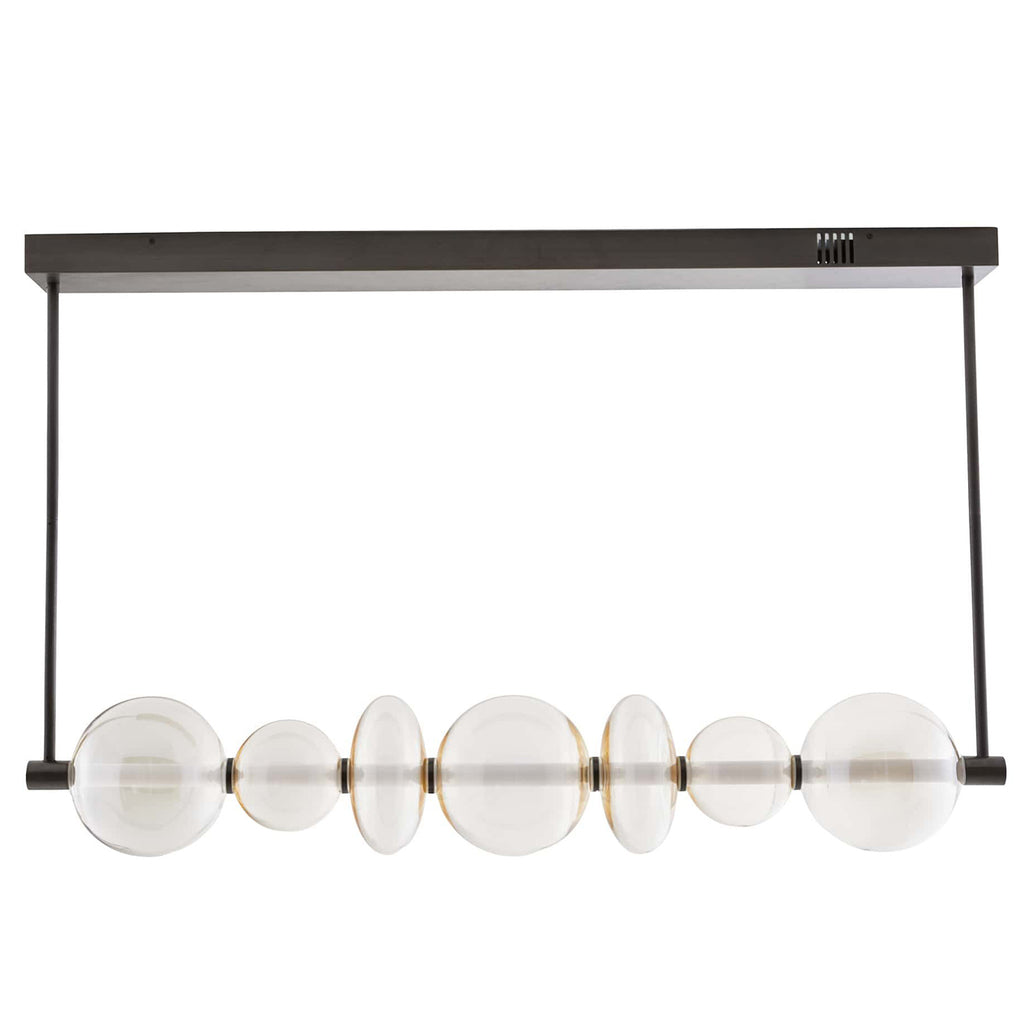 Arteriors Home lighting embodies the perfect balance of form and function, creating an ambiance that is both captivating and inviting. With an emphasis on superior craftsmanship, Arteriors ensures that their chandeliers not only illuminate the room but also make a statement. The Arteriors Raphael chandelier strikes a refined balance between organic and contemporary design. Totemic shapes of champagne and smoke glass are strung like beads along a white acrylic diffuser and anchored to a linear framework constructed of english bronze iron. Integrated LED. Finish will vary.