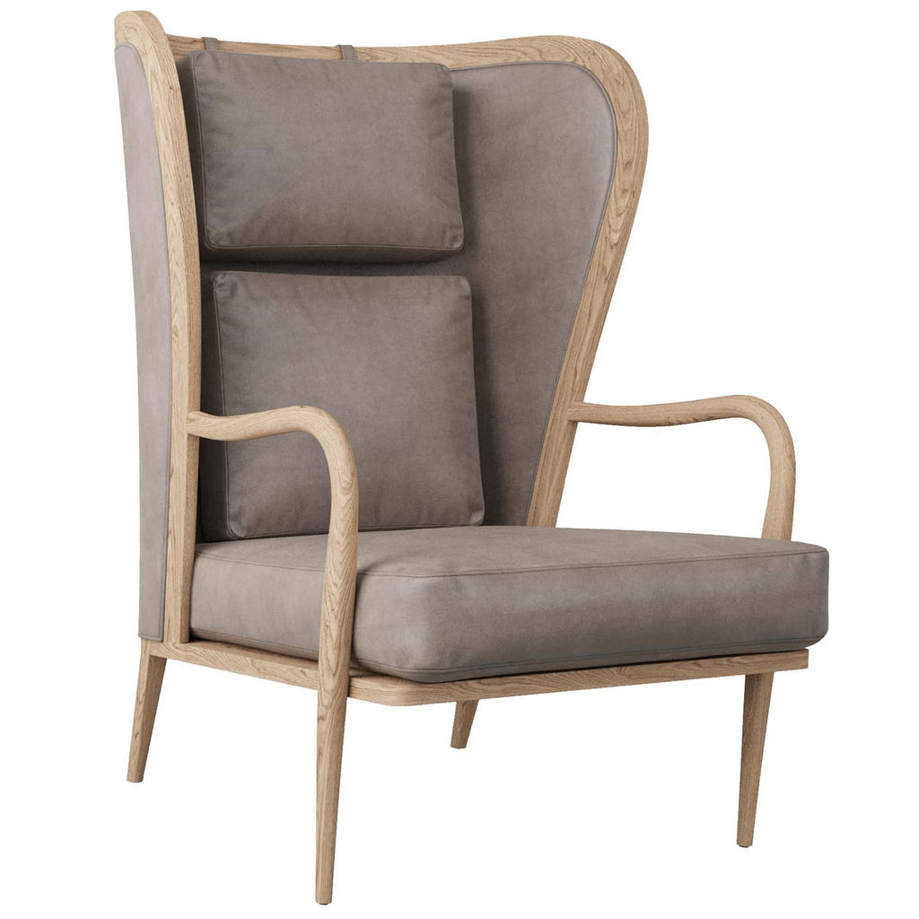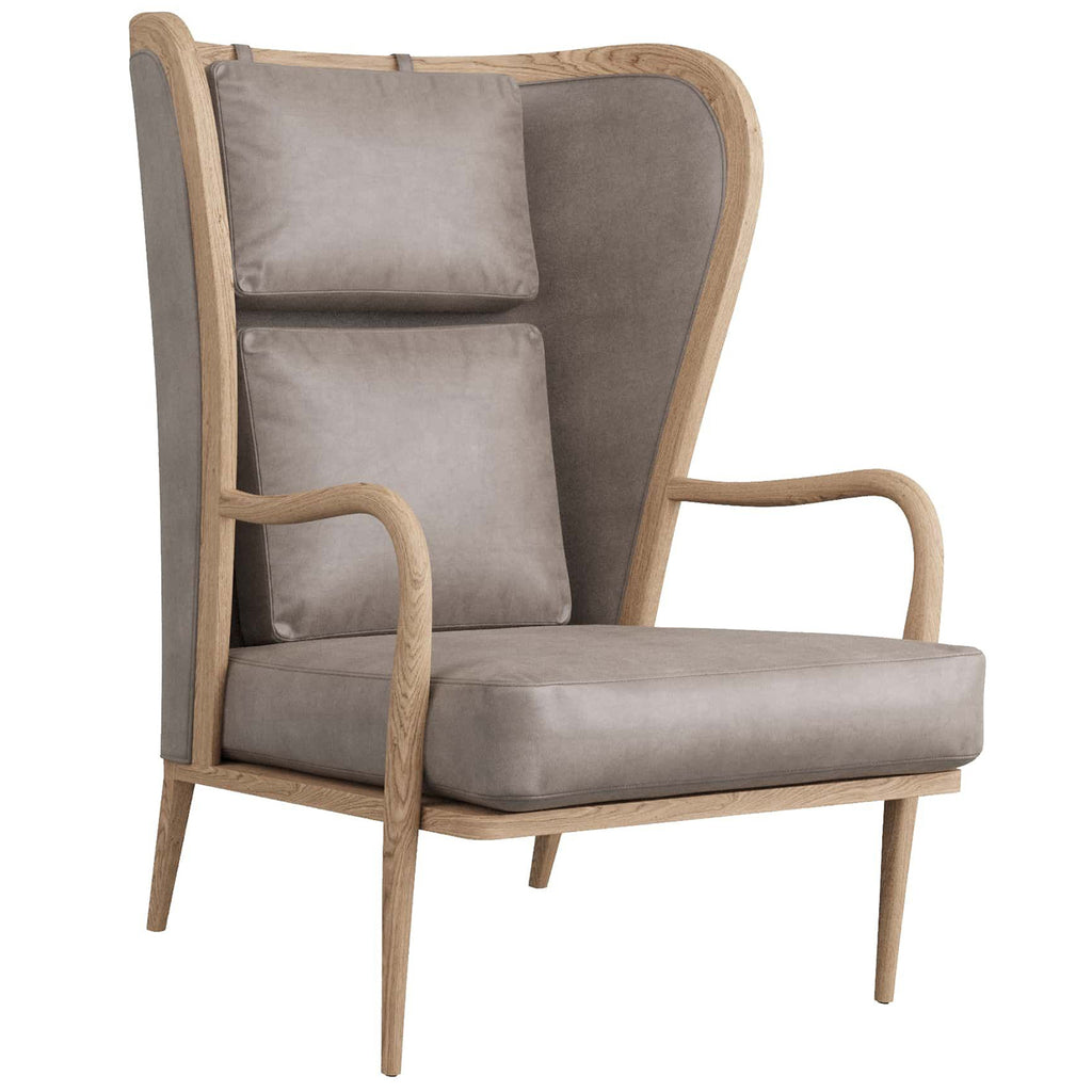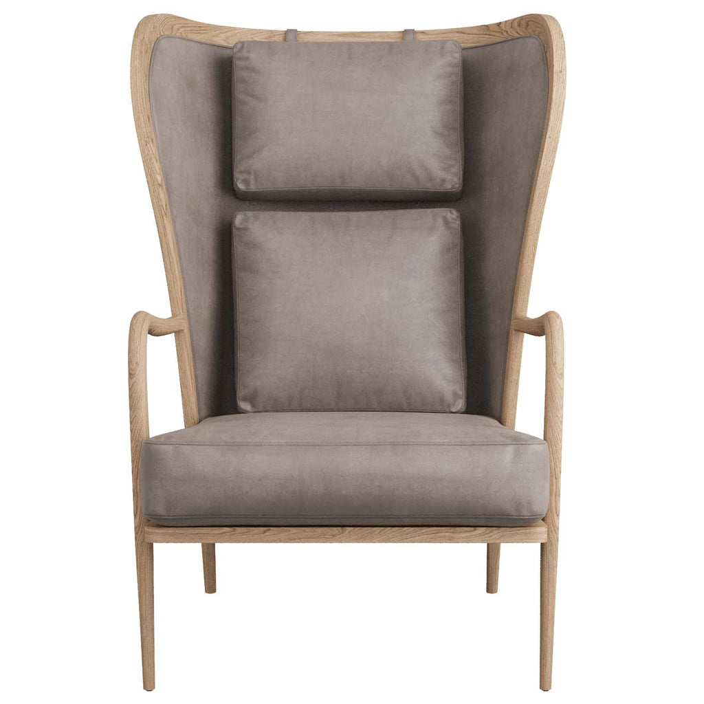 The classic wingback style is reimagined in carbon leather upholstery and smoke oak wood detail. This modernized version is rendered in broad, yet graceful, proportions, making a statement as a single chair or doubly impactful as a pair. Leather will vary.