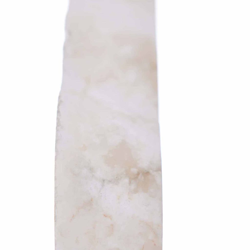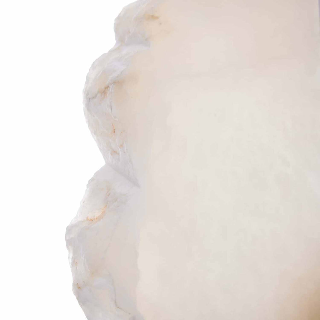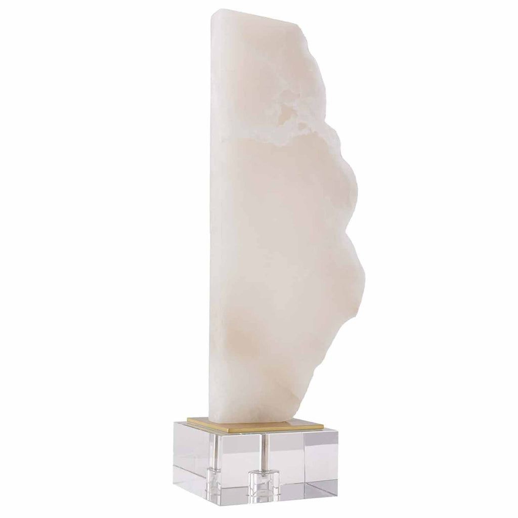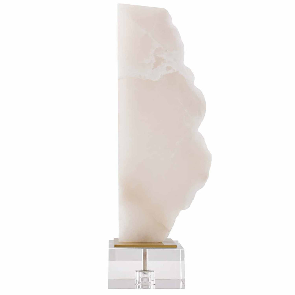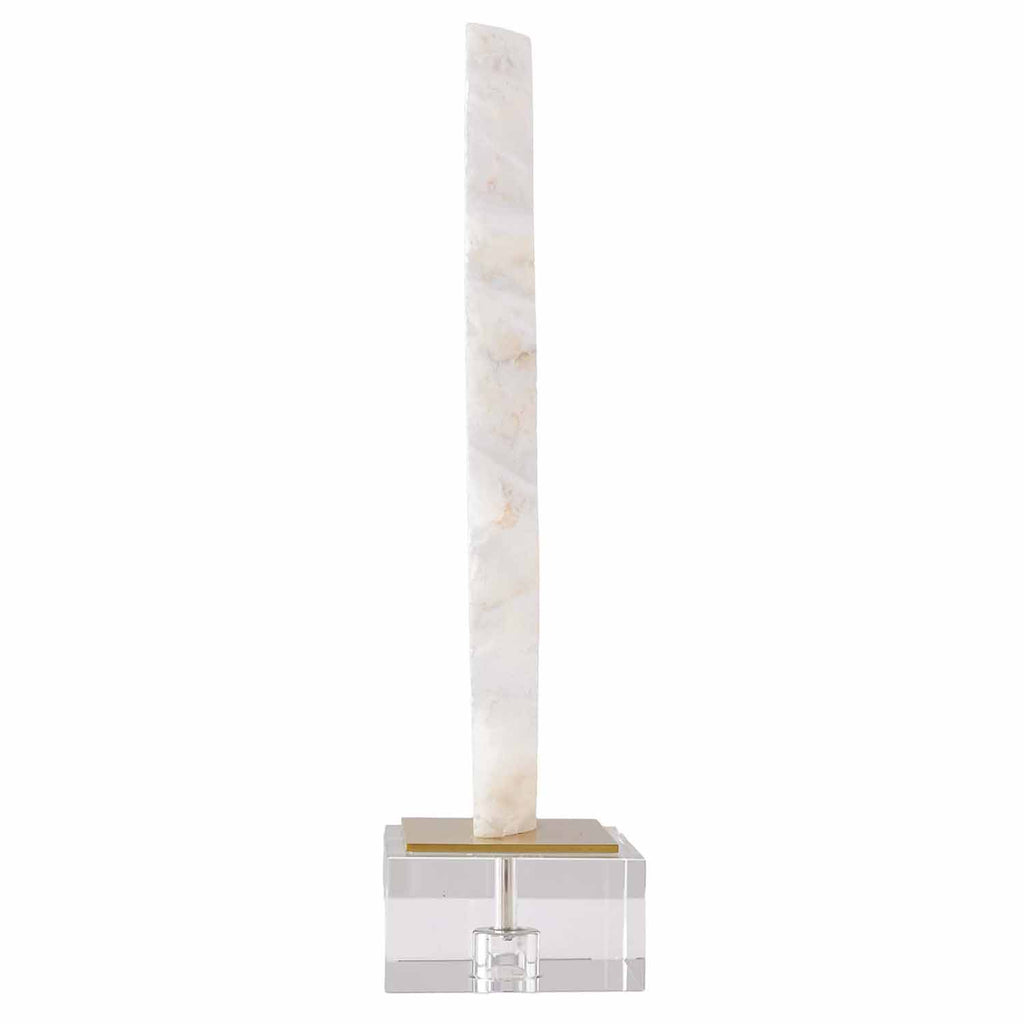 Drawing inspiration from 20th century modernism, the Arteriors Taos sculpture is chiseled from white alabaster to reveal a craggy, raw edge on one side and a smooth, vertical plane on the other. A antique brass steel plate tops the translucent crystal base. Finish will vary.