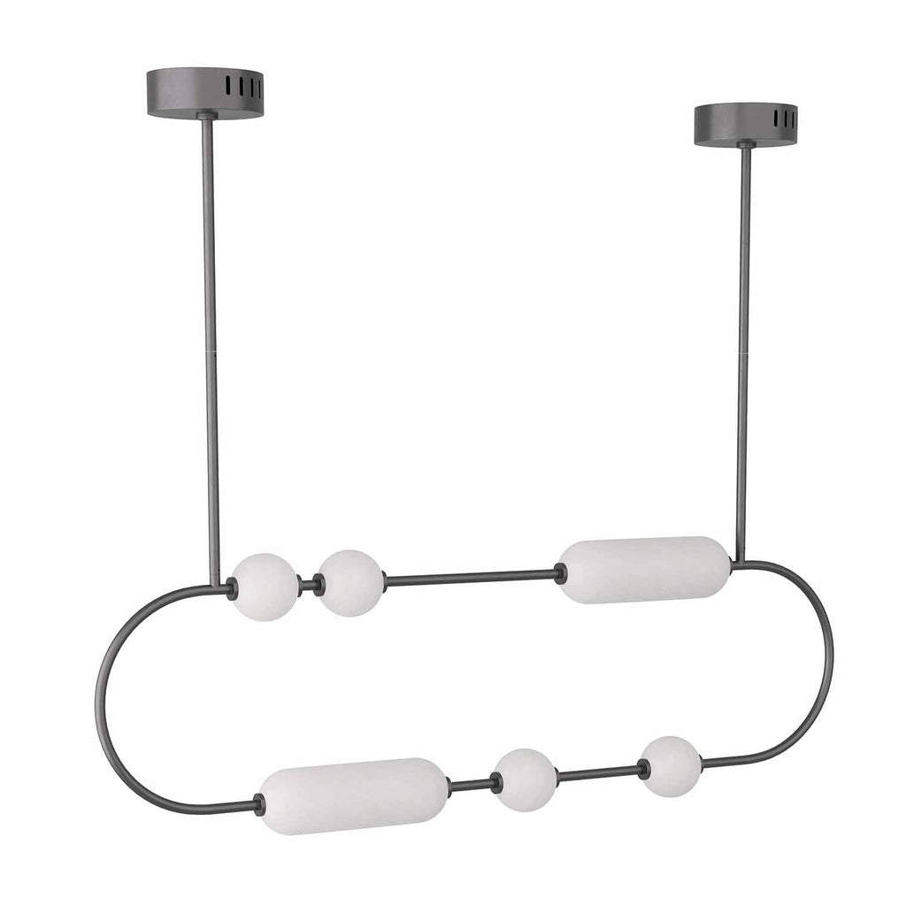 Arteriors Home lighting embodies the perfect balance of form and function, creating an ambiance that is both captivating and inviting. With an emphasis on superior craftsmanship, Arteriors ensures that their chandeliers not only illuminate the room but also make a statement. Playful yet refined, the Arteriors Tenzin chandelier is reminiscent of beads strung along a chord. The imaginative accent is forged with english bronze iron in a linear, capsule silhouette with orbs and tubular shapes of opal swirl glass encircling the frame. The integrated led light is fitted with a dual pipe suspension. Finish will vary. Damp-rated, although limited covered outdoor conditions may affect finish.