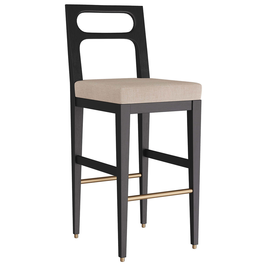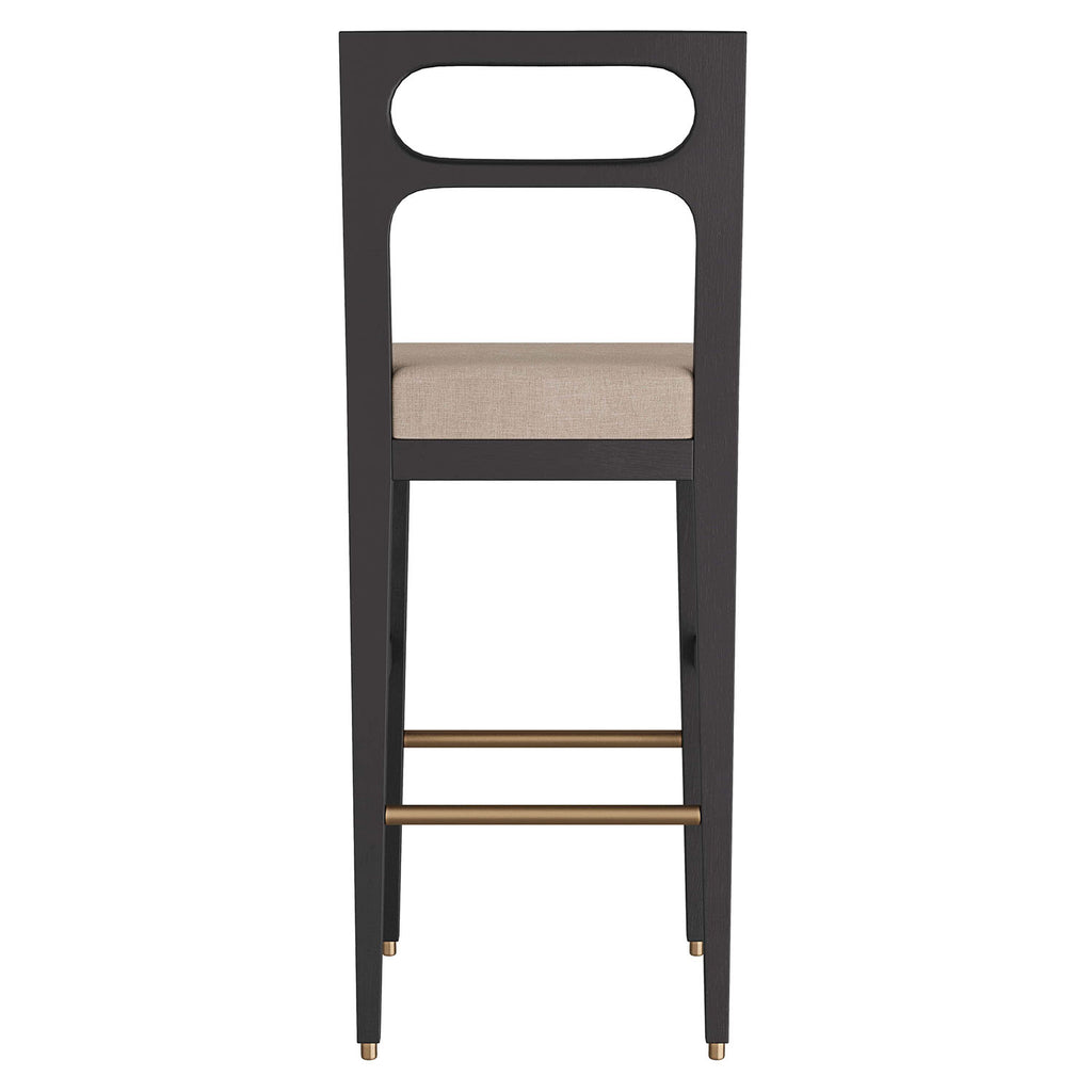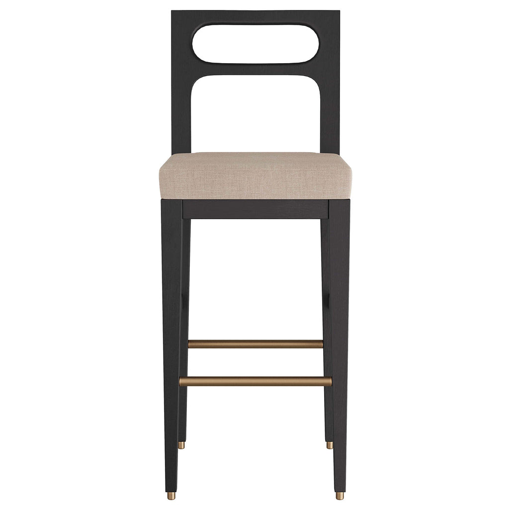 Inspired by midcentury, italian, ladder-back chair construction, our Arteriors Thaden bar stool is reimagined with thoughtful details and soft, modern curves. The simple, yet elegant, chair is crafted in ebony mango wood, with tapered legs, and with a natural linen seat. Recessed sabots and a stretcher in antique brass complete the piece. Finish will vary.