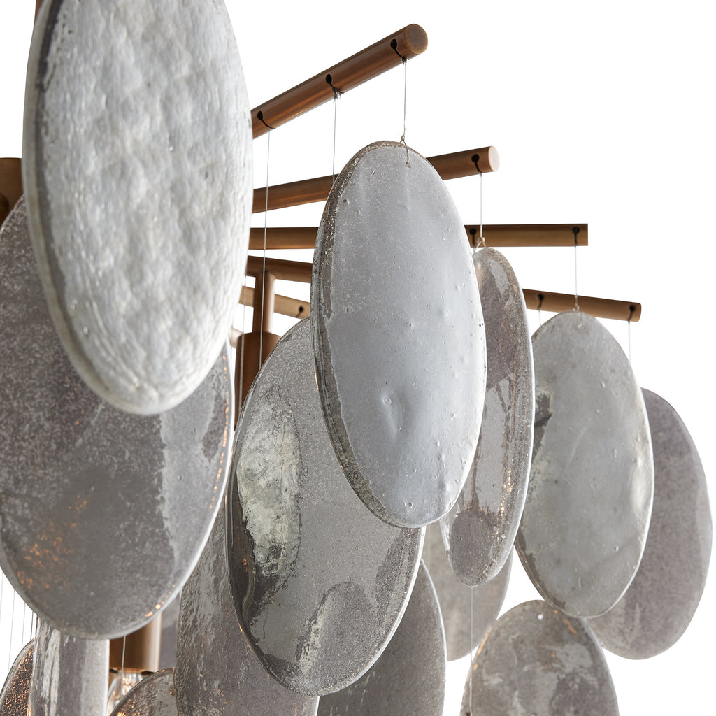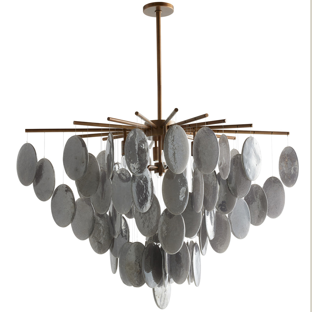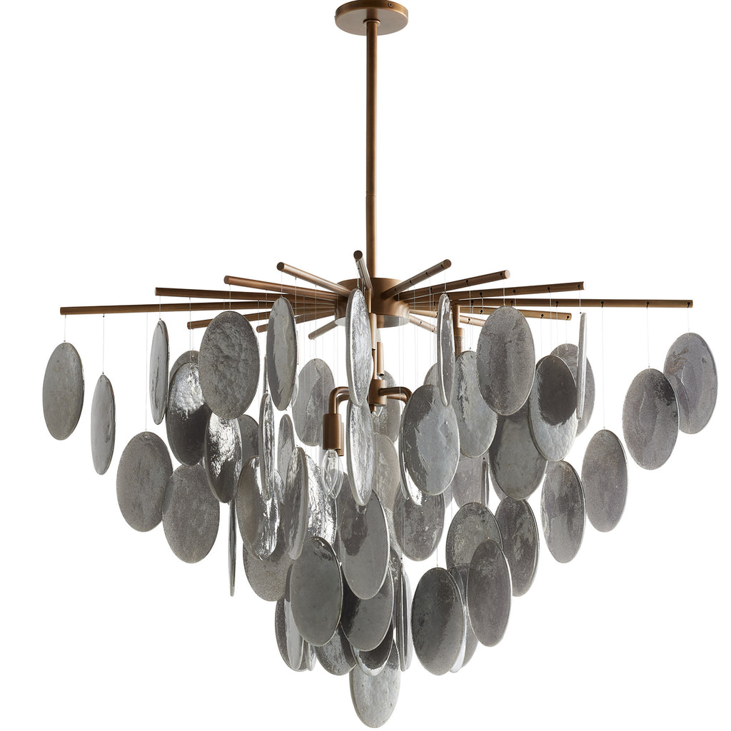This eight-light chandelier is slightly whimsical. Smoke luster glass discs bring a modern feel to this stunning wind chime design. An antique brass iron frame anchors the piece while adding a hint of industrialism. Finish will vary. Shown with a clear tubular bulb.