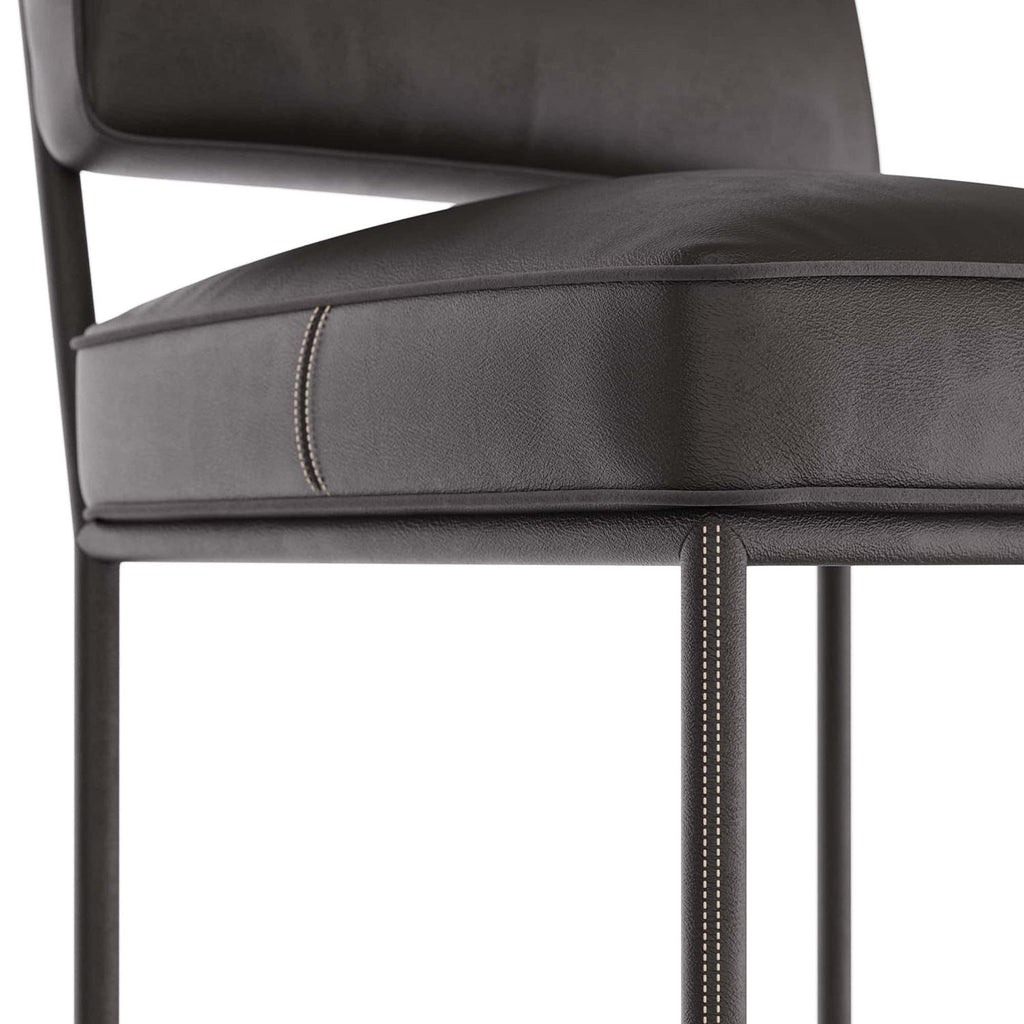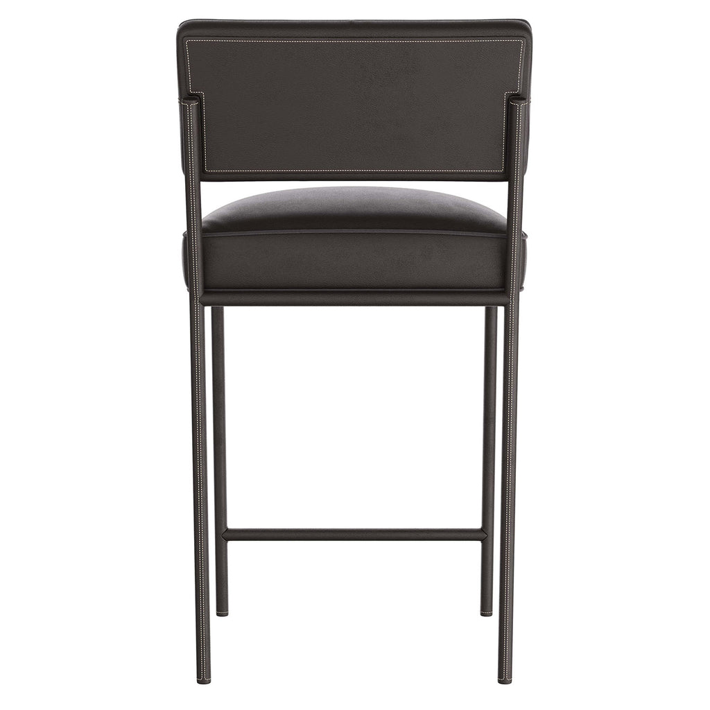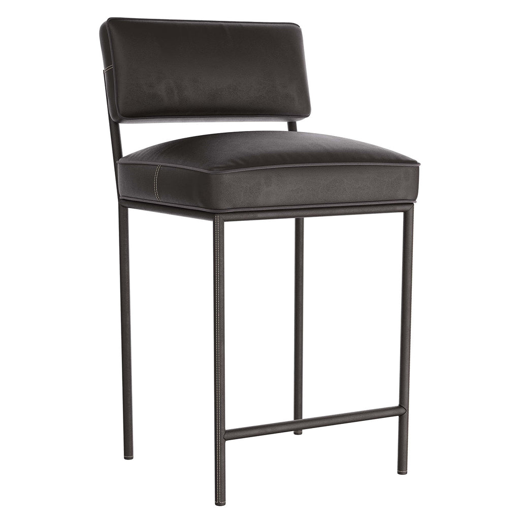 Our fully upholstered Arteriors Topanga stool pulls up to any counter with ease and elegance. The sleek chair is created with a graphite leather frame, seat, and back, with graphite coordinating suede piping detail. Finish will vary.