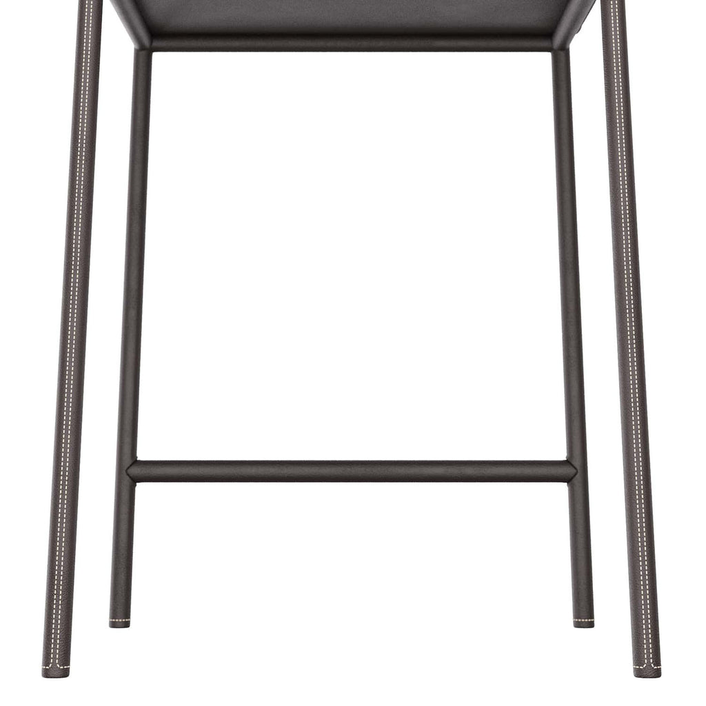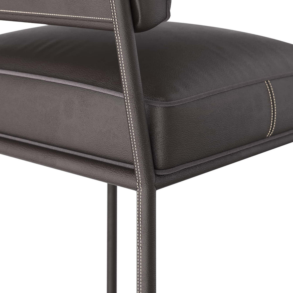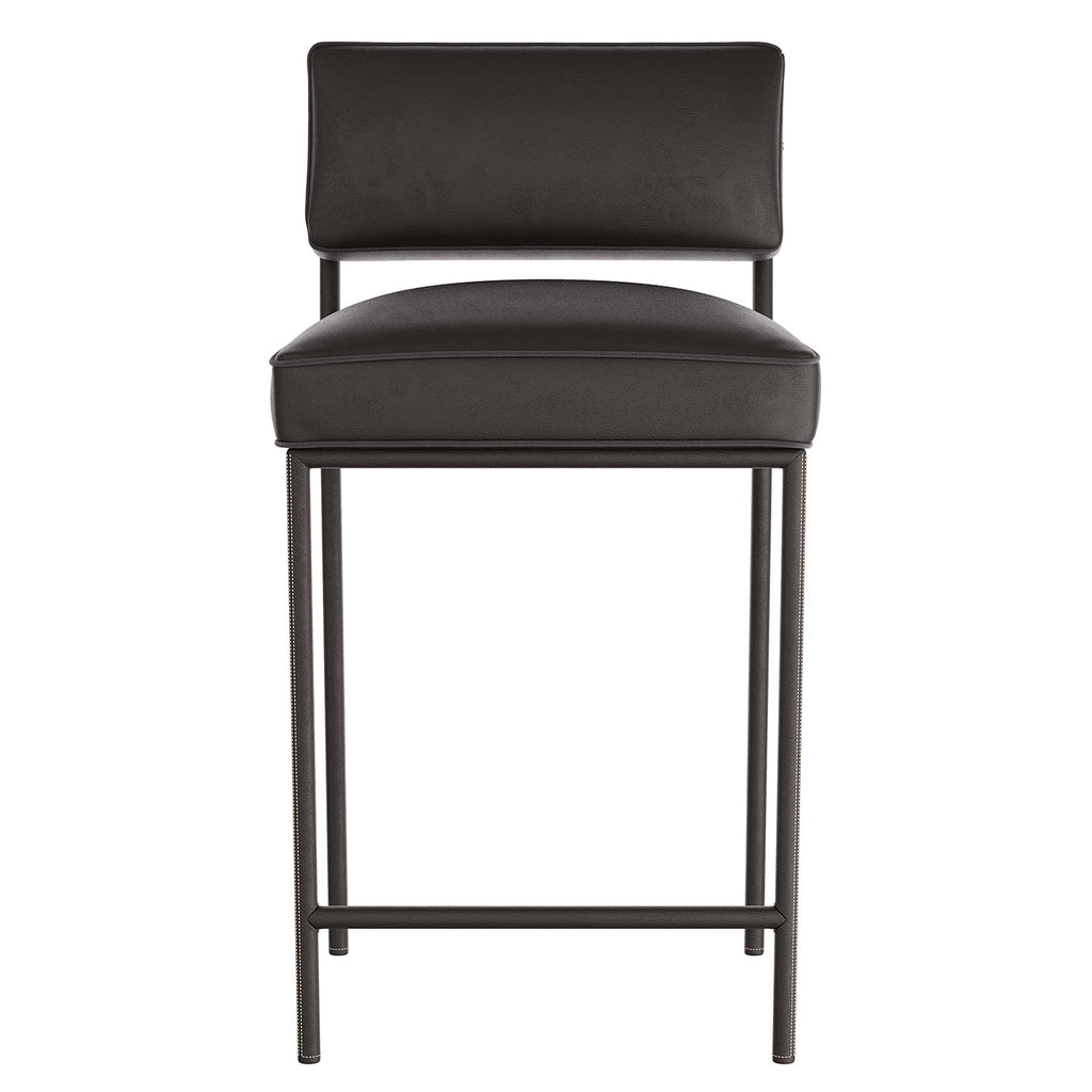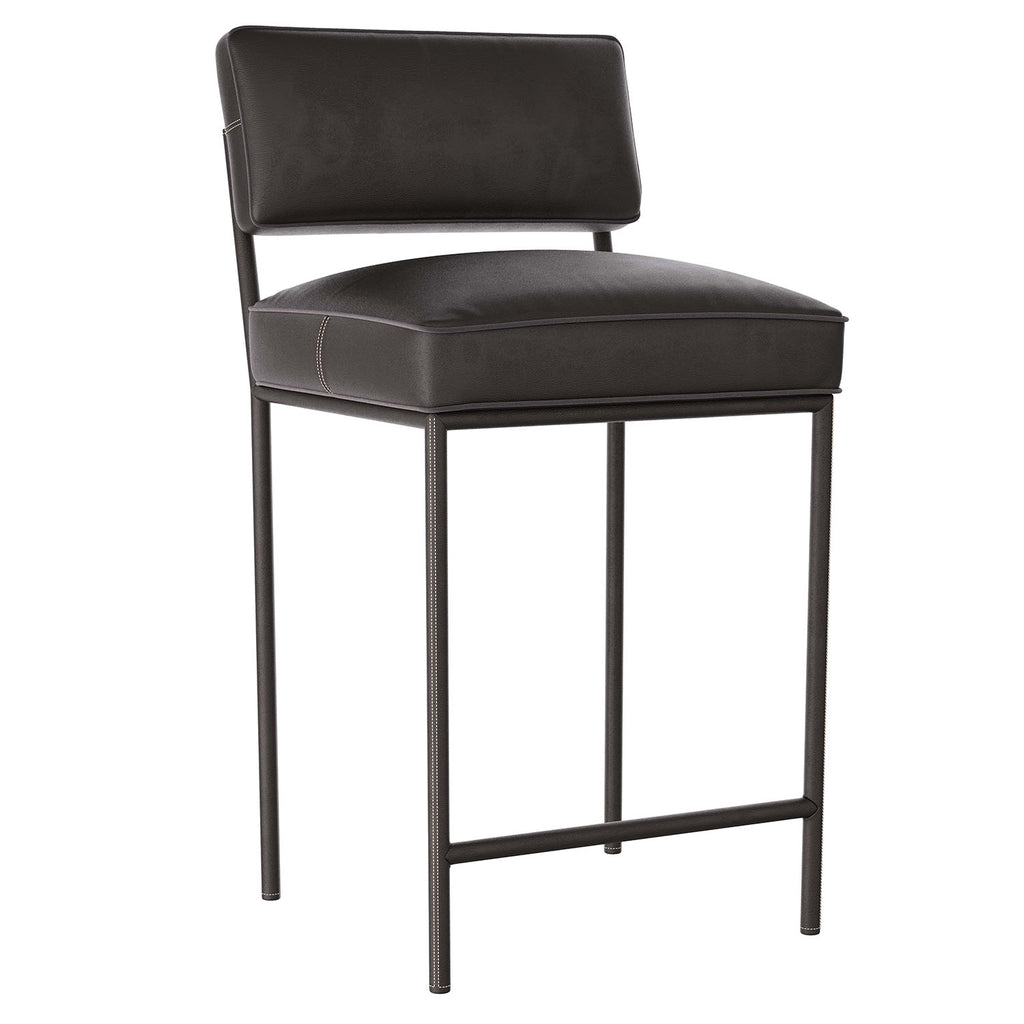 Our fully upholstered Arteriors Topanga stool pulls up to any counter with ease and elegance. The sleek chair is created with a graphite leather frame, seat, and back, with graphite coordinating suede piping detail. Finish will vary.
