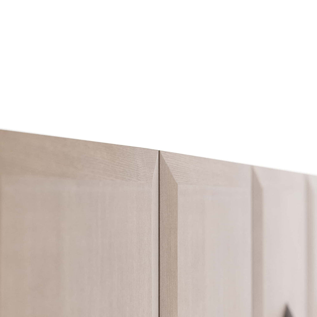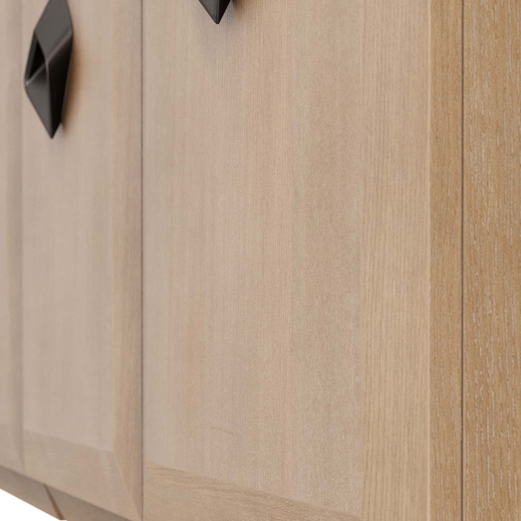 Designed with a nod to midcentury style, our four-door Arteriors Torresdale credenza serves as elegant storage. The piece is constructed in sepia oak veneer, with chamfered cabinet panels that create depth and dimension. Diamond-shaped, jewelry-inspired hardware in a bronzed iron finish ornamented the credenza. The cabinet rests on a chamfered plinth base. Finish will vary.