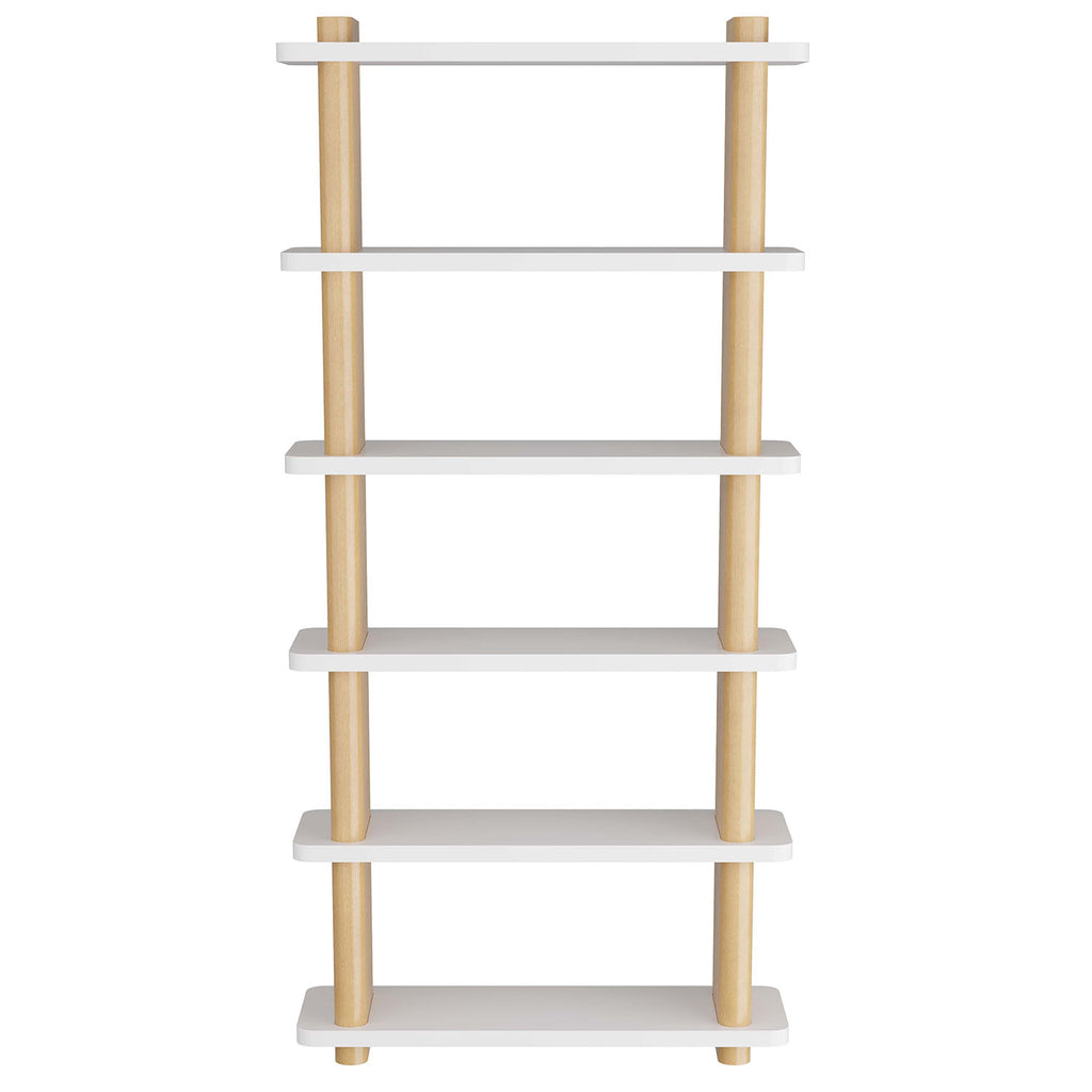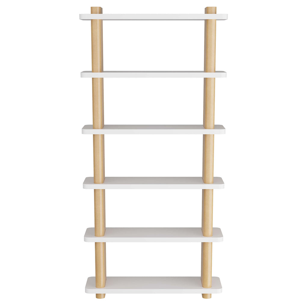Imaginative design and tonal beauty come together in our Arteriors Triton bookshelf. The six-shelf unit is crafted with capsule-shaped, matte white lacquer shelves that appear to pierce through the two rounded, vertical, oyster oak veneer sides. Finish will vary.