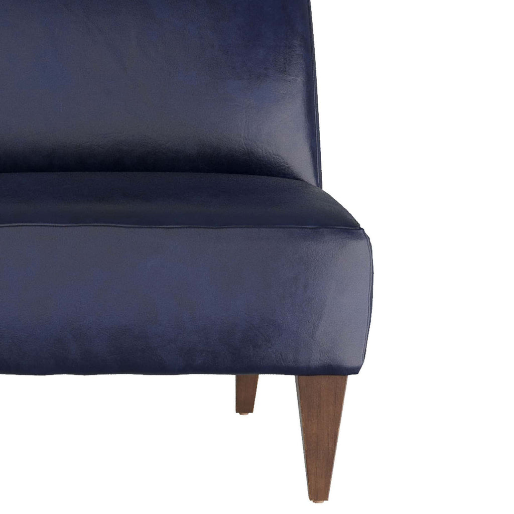 Sleek and stylish, the Arteriors Trudell is designed with a full seat and back cushion in ink leather, with a gently reclined back. The slipper chair is constructed with uniquely angled, dark walnut legs with antique brass accents made of iron, emphasizing the angled seat and create a striking profile from any direction. Finish will vary.