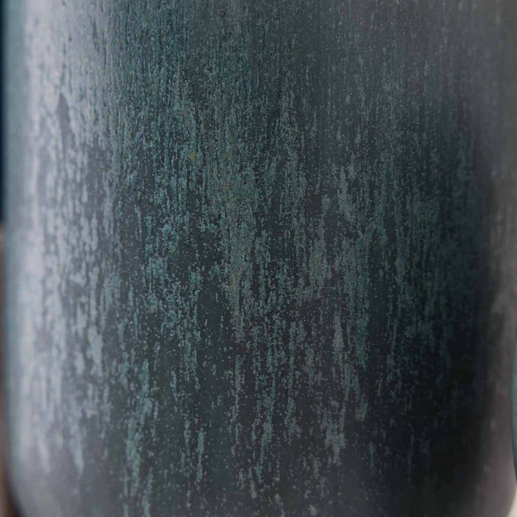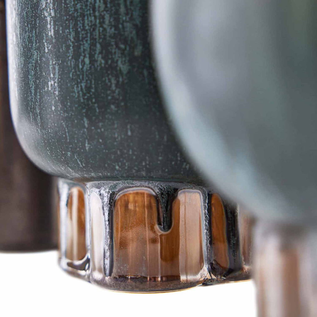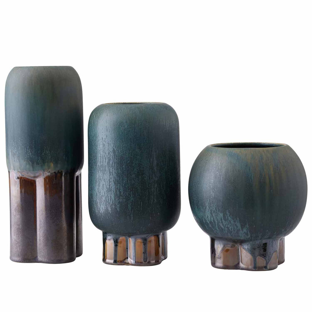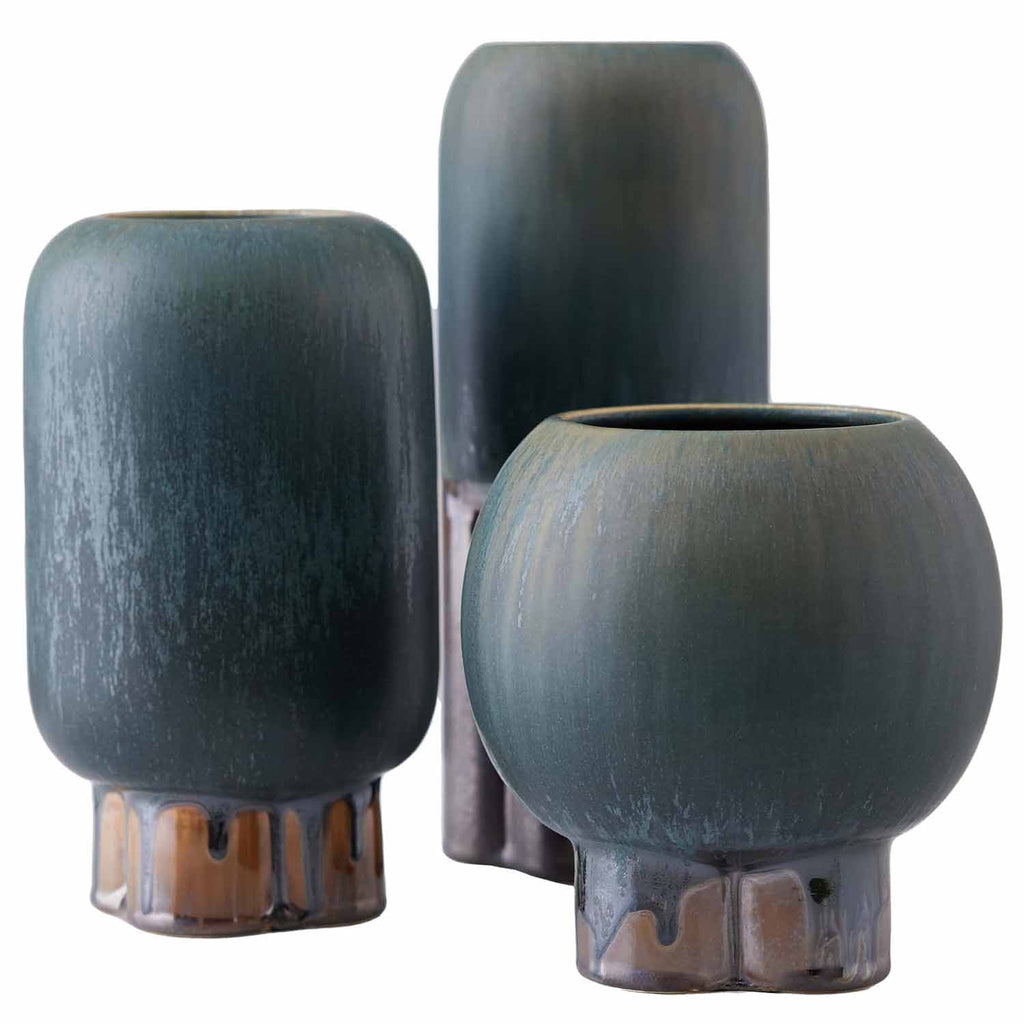 Our trio of Tutwell vases are crafted from reactive glaze ceramic in three different shapes and sizes. The organic pod- and capsule-shaped vases, in a neutral forest reactive glaze, are designed with fantasy-inspired feet as a base finished in antique brass. Finish and dripping will vary.
