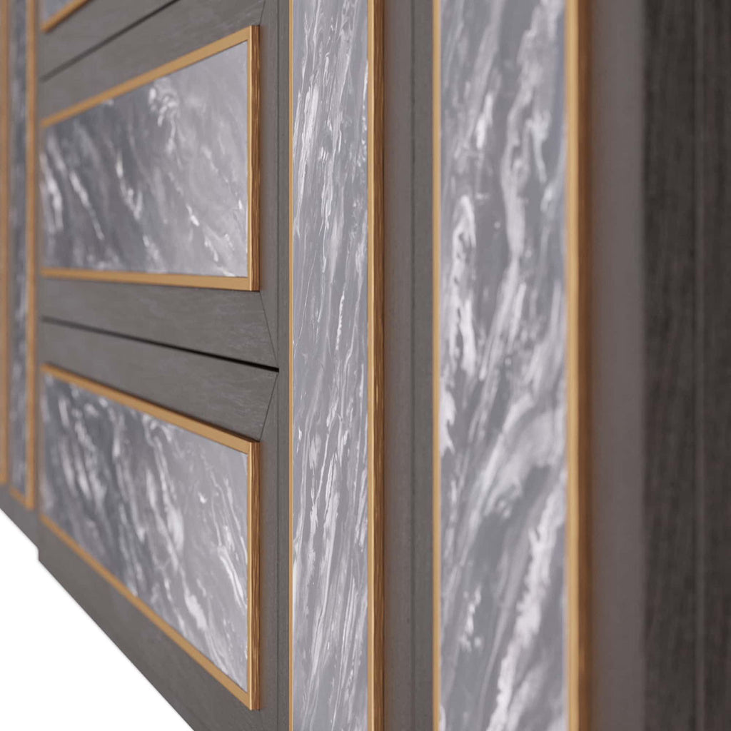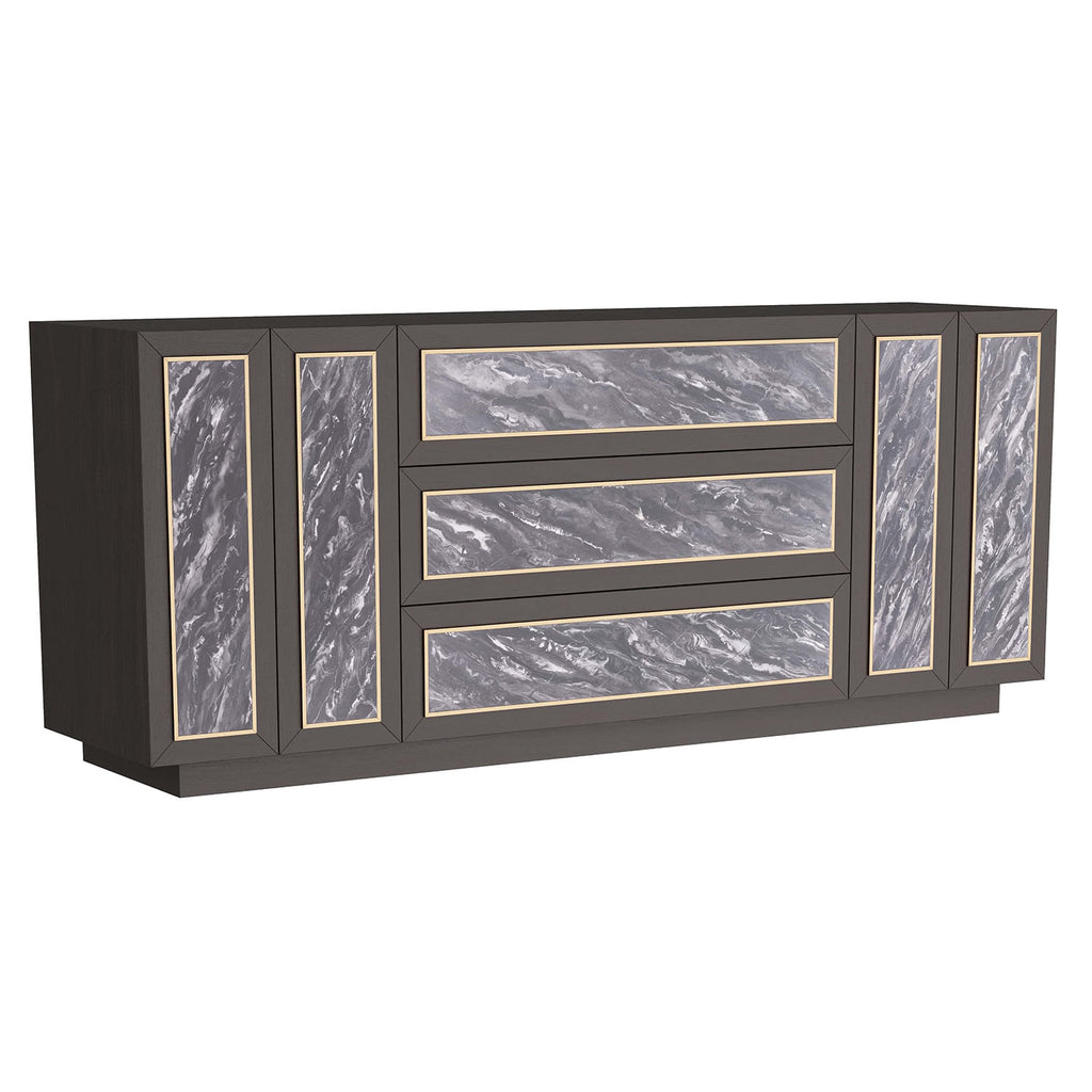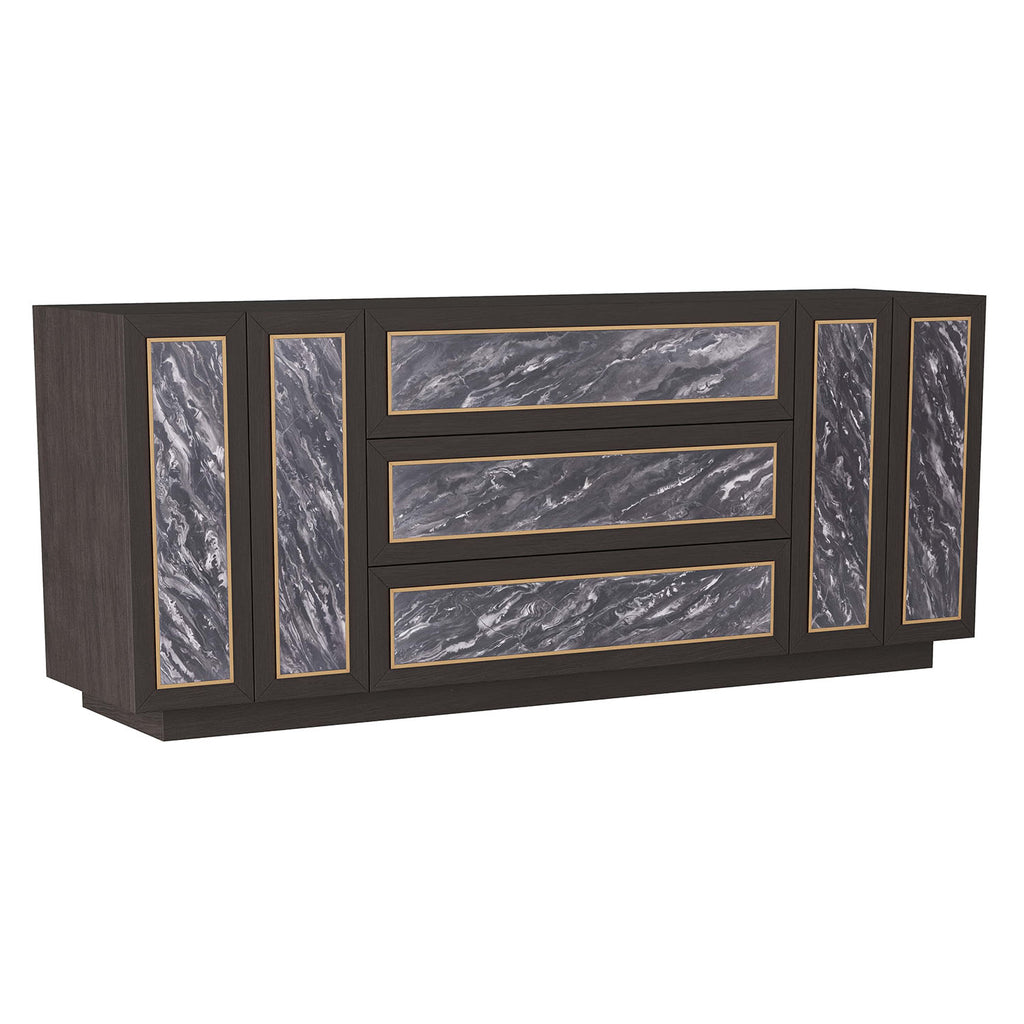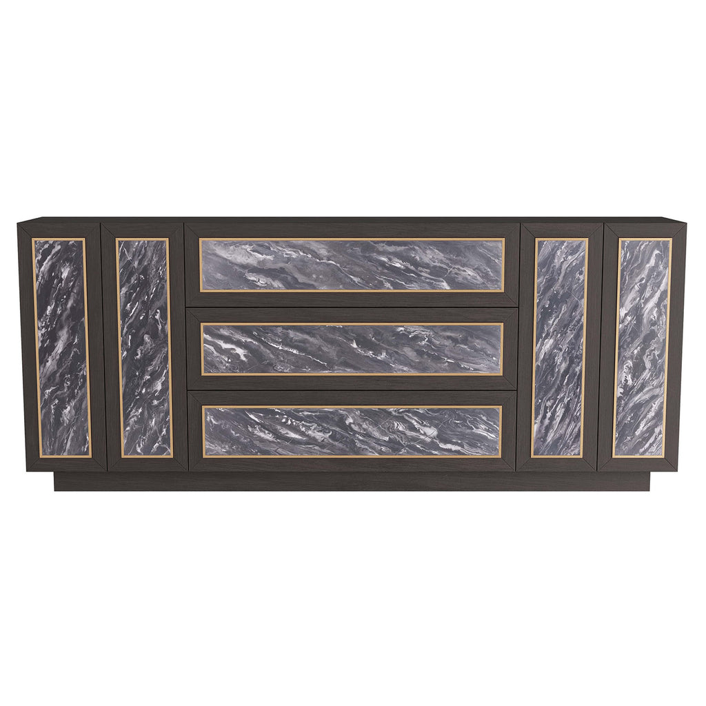 Effortlessly balancing vintage character with fresh, contemporary styling, the Arteriors Vernier credenza bears all the markings of a true classic. The two-door, three-drawer cabinet is constructed in a rich combination of materials and details, with panels that nod to midcentury furniture design. Ebony oak veneer encases the piece, and hand-applied resin in a gray faux marble creates the façade for each drawer and cabinet door. Vintage brass forms a reveal around each faux-marble inlay for an added element of elegance. The credenza is fitted with shelves and touch-latch drawers and sits on an oak plinth. Finishes will vary.