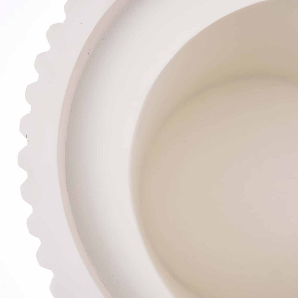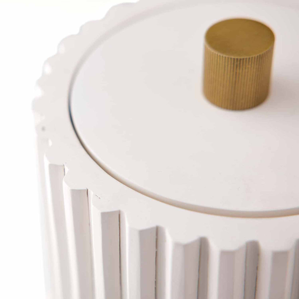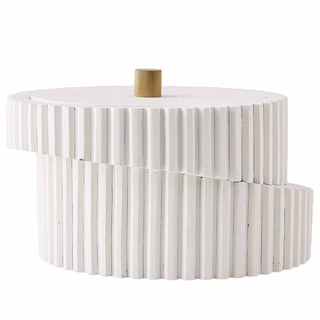 The Arteriors Whittaker’s grooved design, created in stacked, offset discs, offers an industrial nod reminiscent of machine gears. The contemporary cache features a contrasting, notched round knob in an antique brass finish. Carved in ivory resin, the accent is as versatile as it is style packed.