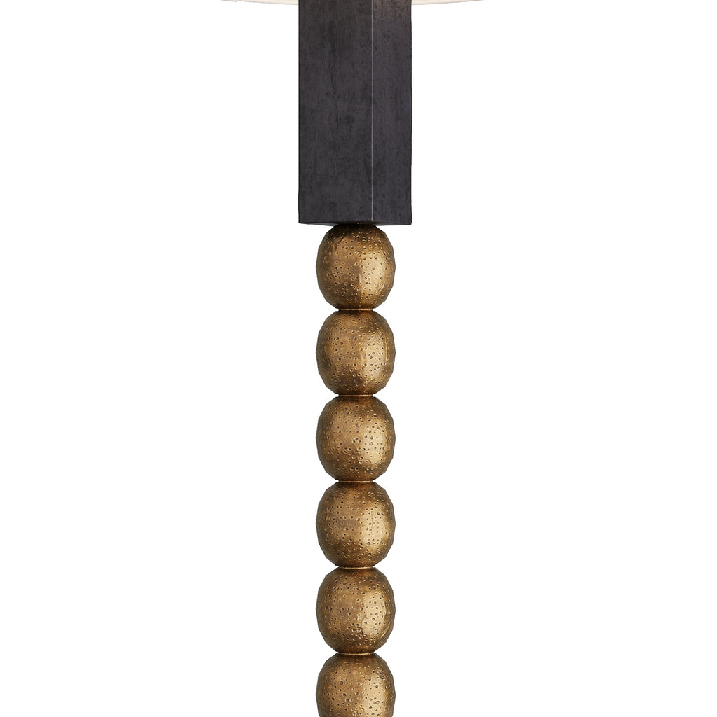 Texture on texture elevates the modern Arteriors Yonah Floor Lamp. Blocks of ebonized mango wood border a totem of antique brass spheres. Bringing the best of the natural and modern worlds together, its sculptural form is finished with a drum shade of white linen. Clear silver cord and three-way rotary switch. Finish will vary.