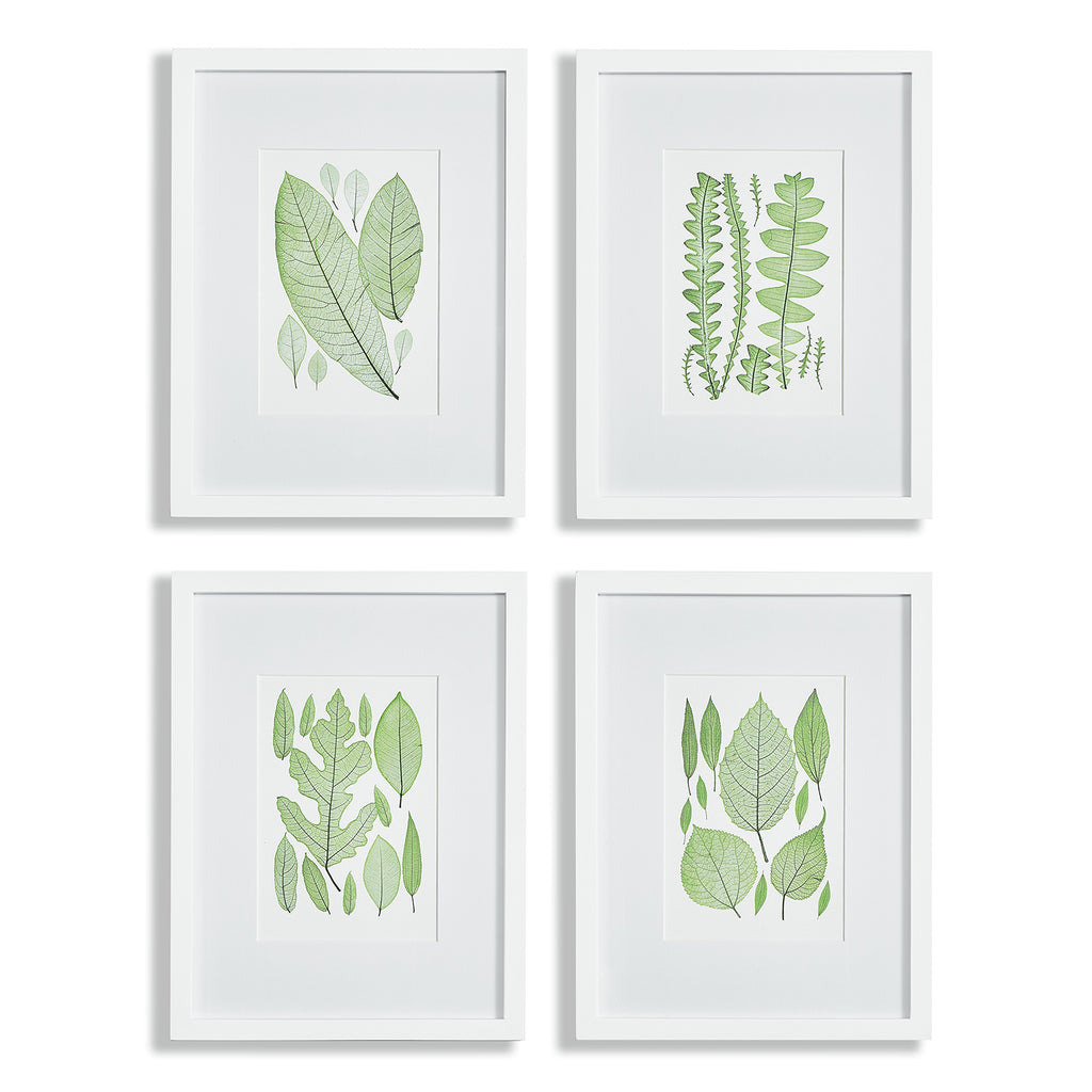 In a woodcut-like composition, this set of four prints add a vibrant pop of green. Finished off with a crisp white mat and simple frame, they make a charming set for powder room or study.