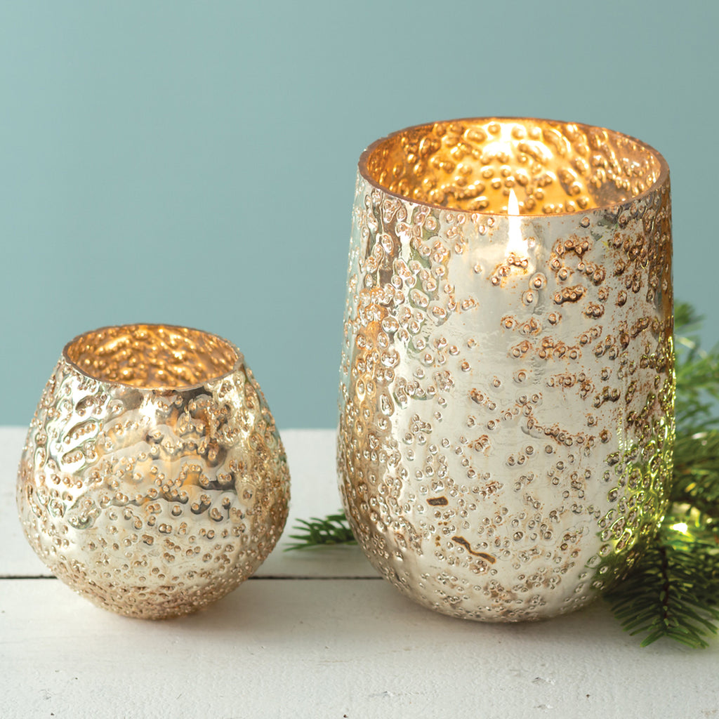 This shimmering votive holder is a great way to add some sparkle into your home! It has lots of texture on its outside on gold mercury glass, making it distinctively unique.