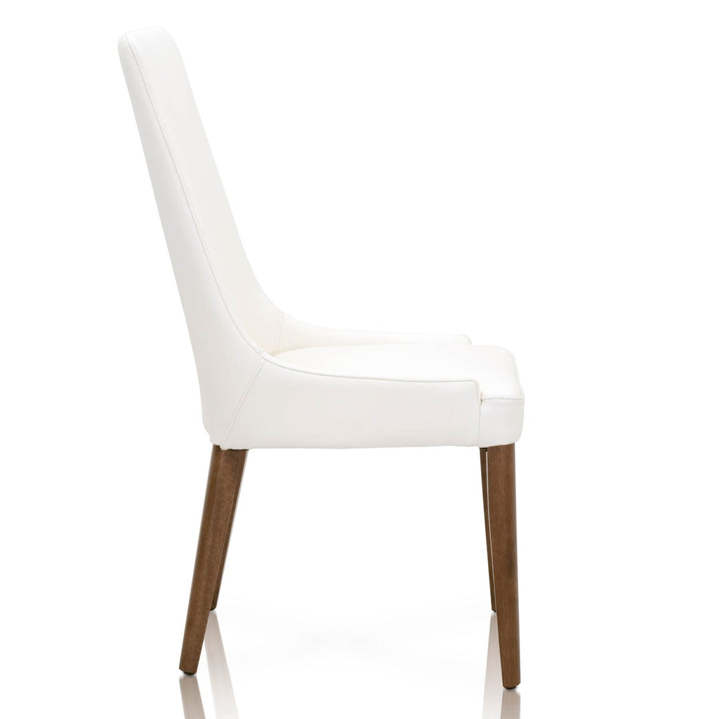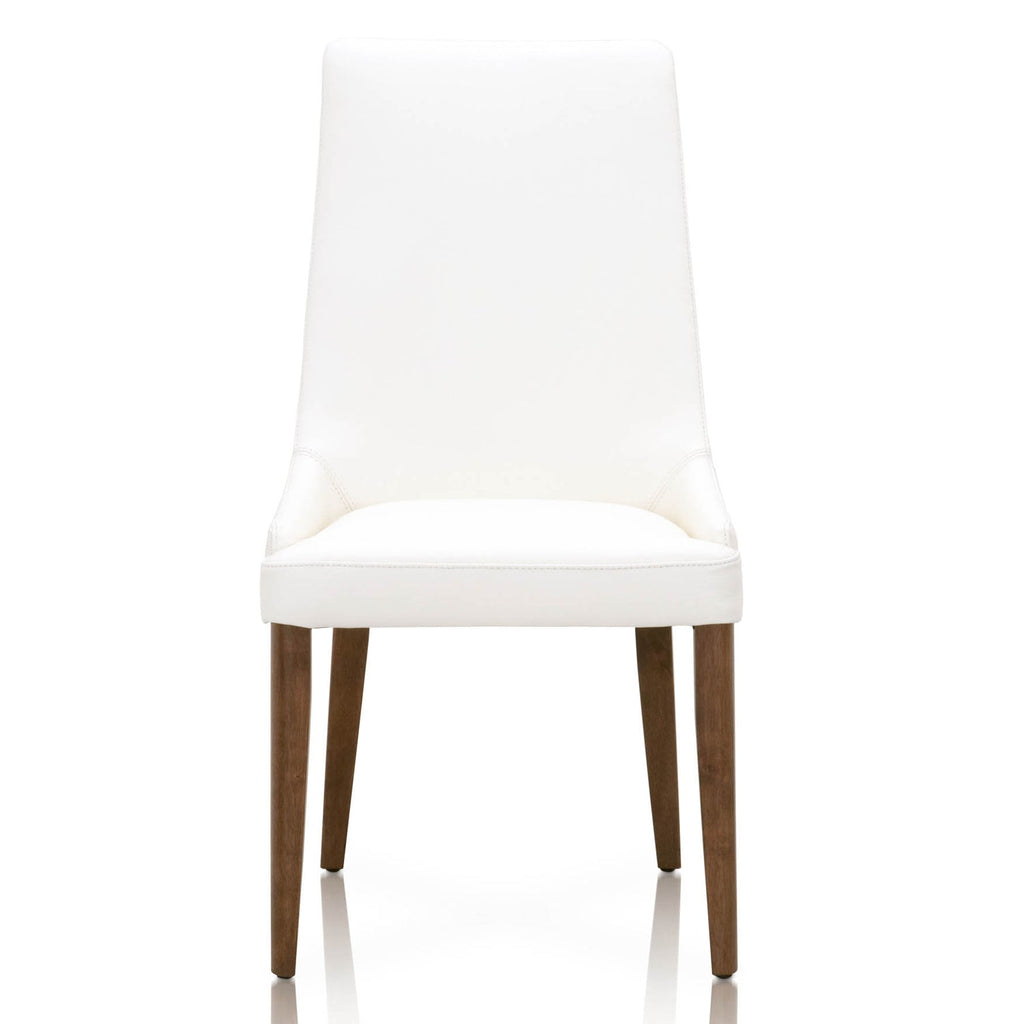 The Aurora dining chairs combine class and elegance that can easily work in a transitional or modern dining area or breakfast nook. Made with beautiful top grain leather and rich walnut legs, these chairs provide great comfort and durability. The sides of the seat are slightly raised to seamlessly flow into the gently curved backrest, and detailed stitching can be found along the back and sides. If you're looking for an open and inviting dining area, then these stylish side chairs will be the perfect addition.