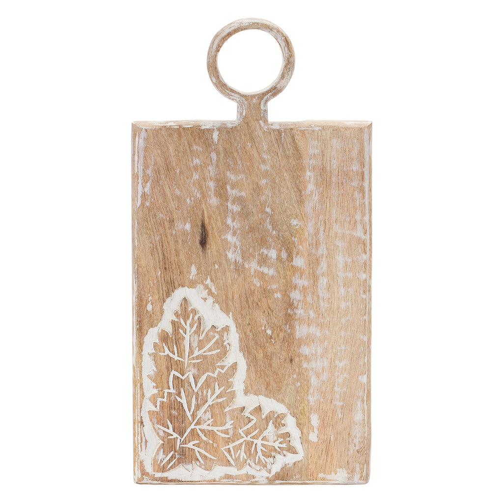 Make your home more festive this season with this set of Autumn Mango Wood Cutting Boards! Crafted with quality mango wood, these rustic yet traditional decorations feature natural beige wood tones with a modern carved leaf design. The white-washed finish is the perfect finishing touch. Add some fun to your home's fall decor and bring a touch of cheer to any space with these charming cutting boards!