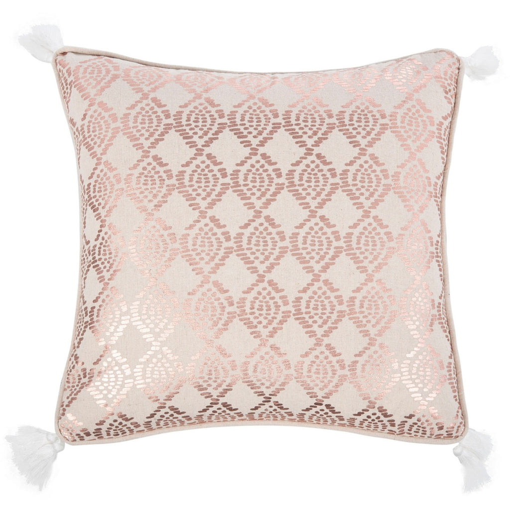 Decedent and glamourous, this accent pillow reflects the power of good taste and refined sensibilities. Fit for a contemporary aristocrat, its shimmering rose gold fabric features a subtle sheen and a glorious classic pattern that transforms any home into a majestic castle. Its sweet tassels give it a playful touch.