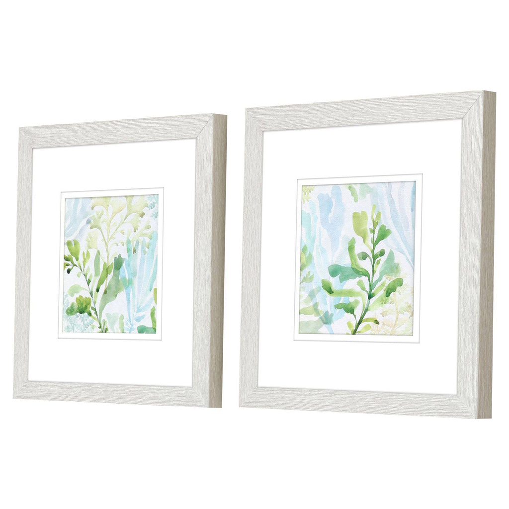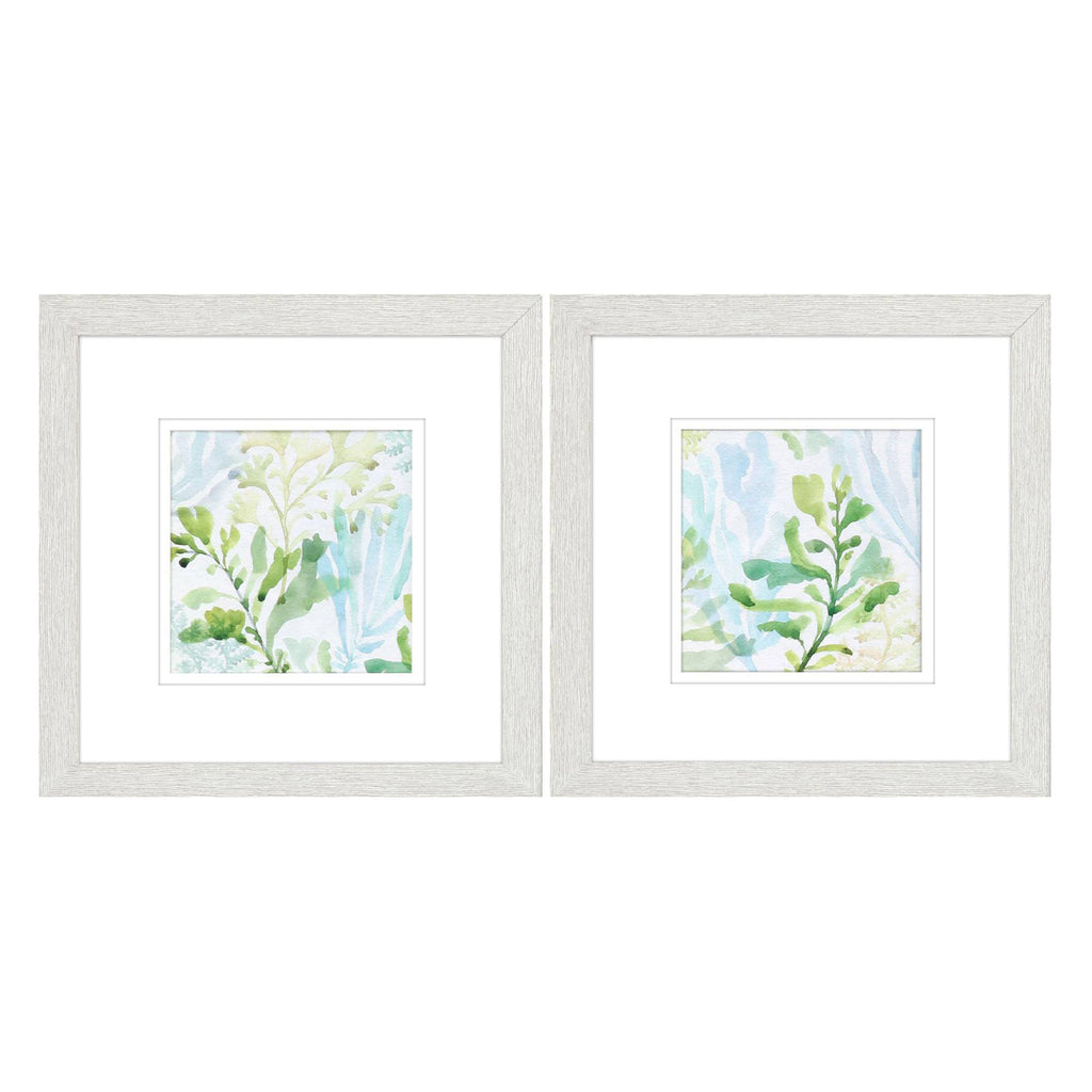 A set of two seaweed coastal images that are accentuated with double matting. These pieces are framed under glass with a white wash frame.