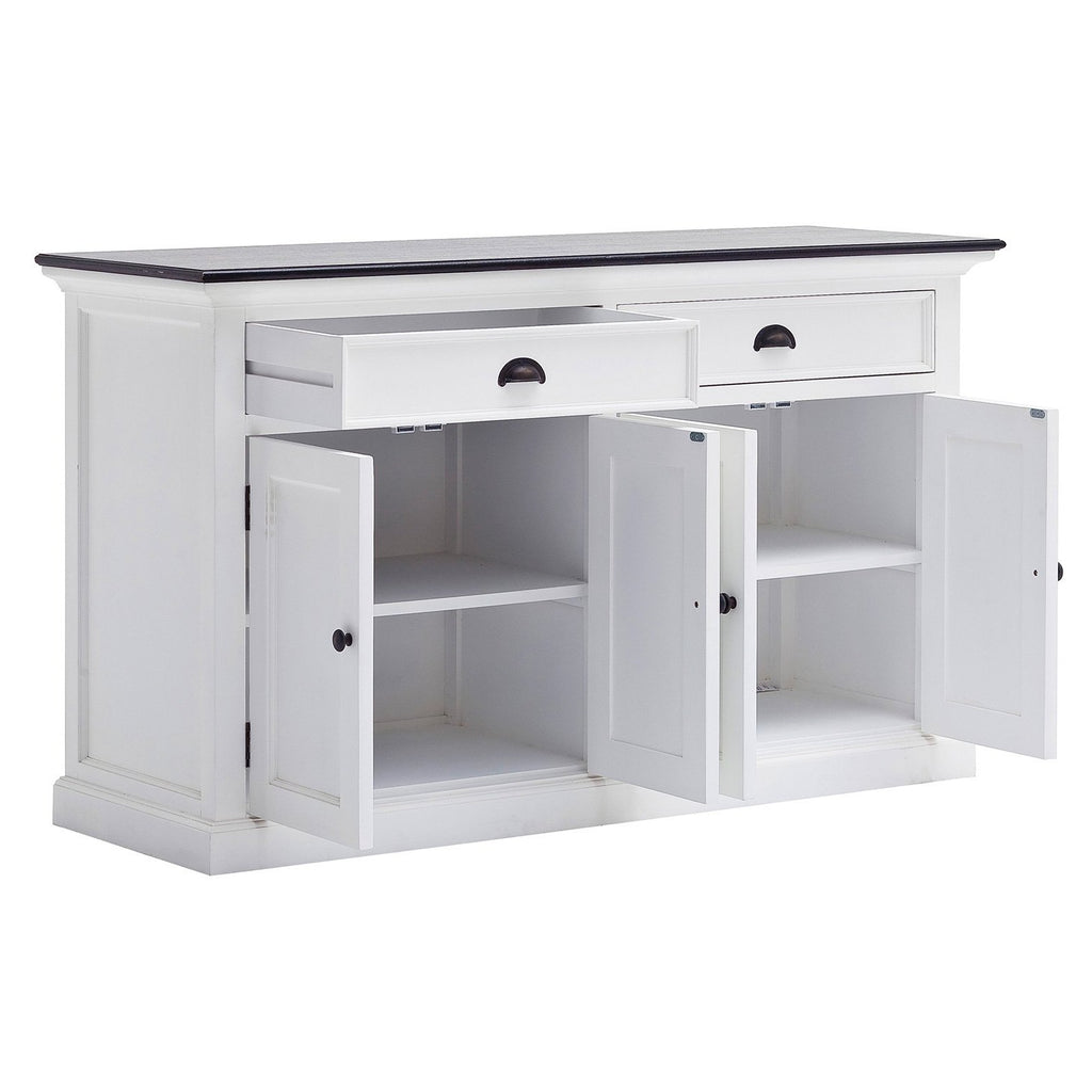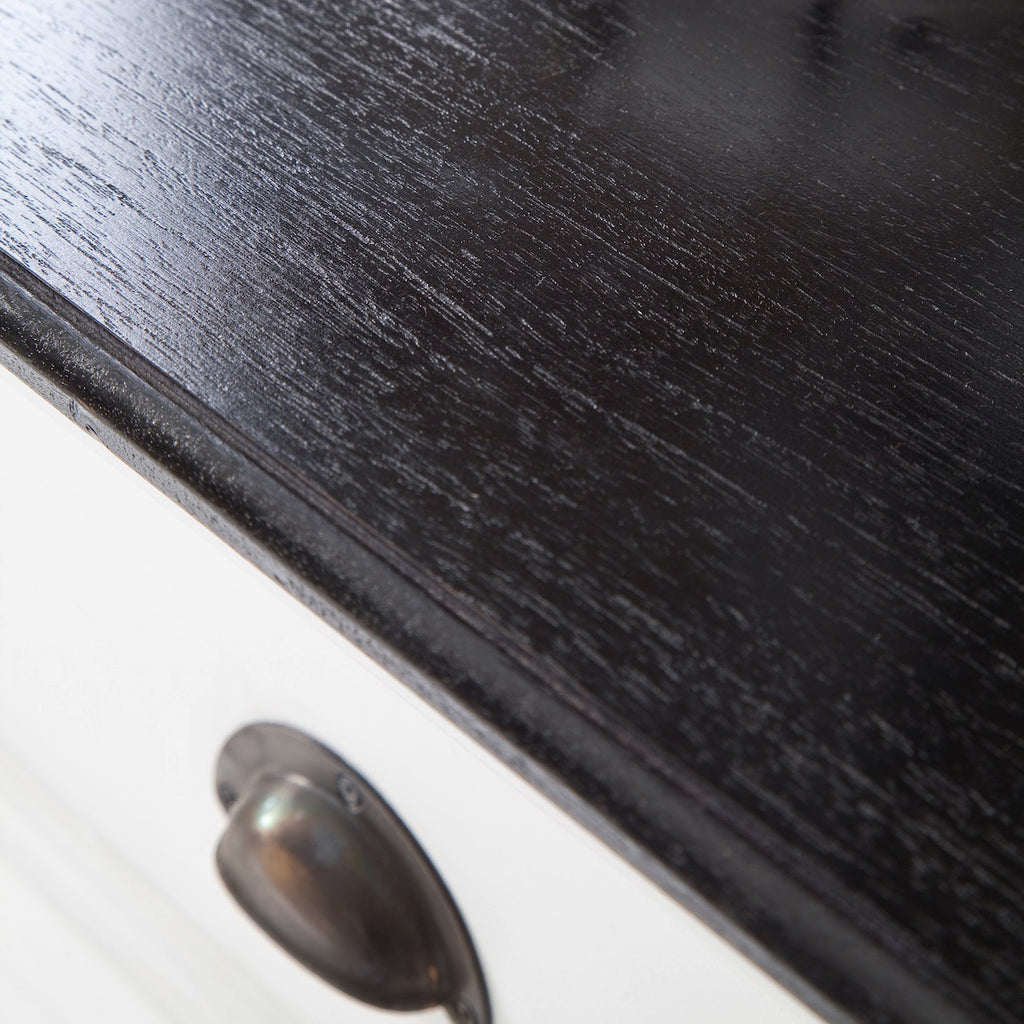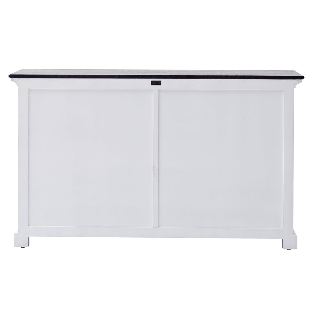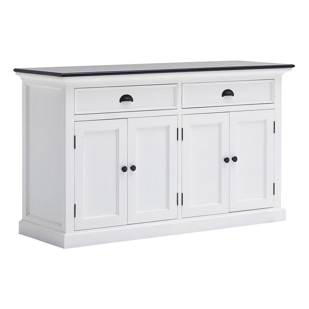 Beckton Contrast introduces a limited selection of the classic white furniture with a black painted top. The contrasting top against its subtle white base gives each piece a new edge and attitude. Two spacious cupboards are what give this piece its true storage potential. Inside is shelving, two layers in fact, so you can make the most of the space. And don’t forget the drawers on top. This buffet is versatile. Every piece within the Beckton Contrast collection has a classic silhouette which features a moulded plinth at its base and flared cornice on top. The antiqued hardware is in the form of traditional cup handle and button knob with exposed bolts to match. And then there’s the period-style panelling and bevelled drawer fronts.