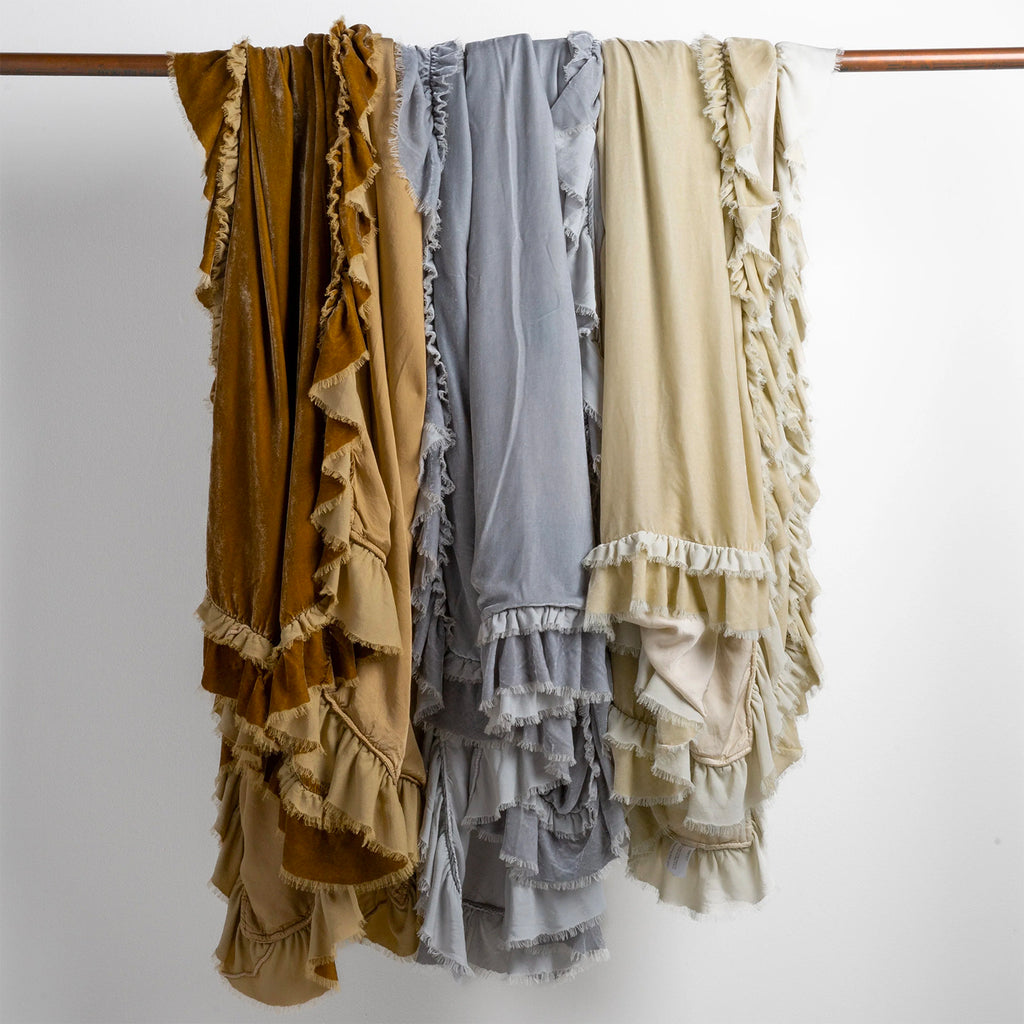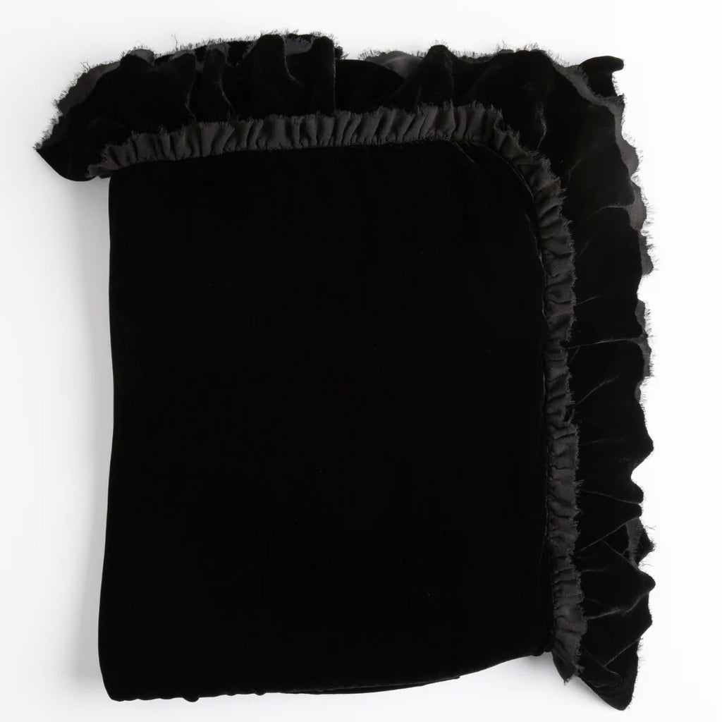 A luxurious 4" silk velvet ruffle and petite ruffle trim adorn four sides of the Bella Notte Loulah Blanket, their raw edges and delicate eyelashes adding a flirty finishing touch to the draping ruffle. Backed in satin, this garment dyed blanket is a rich, glowing addition to your bedroom, living room, or boudoir, as beautiful in our lighter hues as it is in our deeper colors.