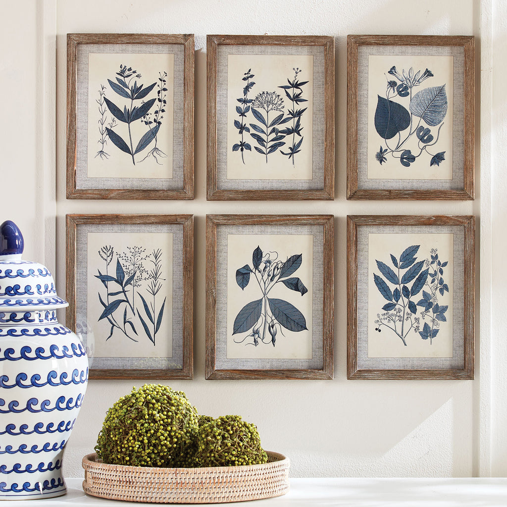 In a muted, on-trend indigo blue, these botanicals are a clean & classic look for the modern home. With a textured mat & simple whitewashed wood frame, a sophisticated way to dress up your walls.