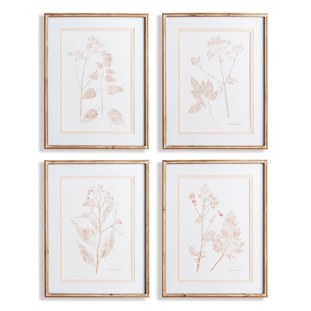 These faintly printed botanicals in soothing sepia tones are a subtle look. Finished with a double mat and natural wash pine wood frame, a beautiful addition to bedroom or study.