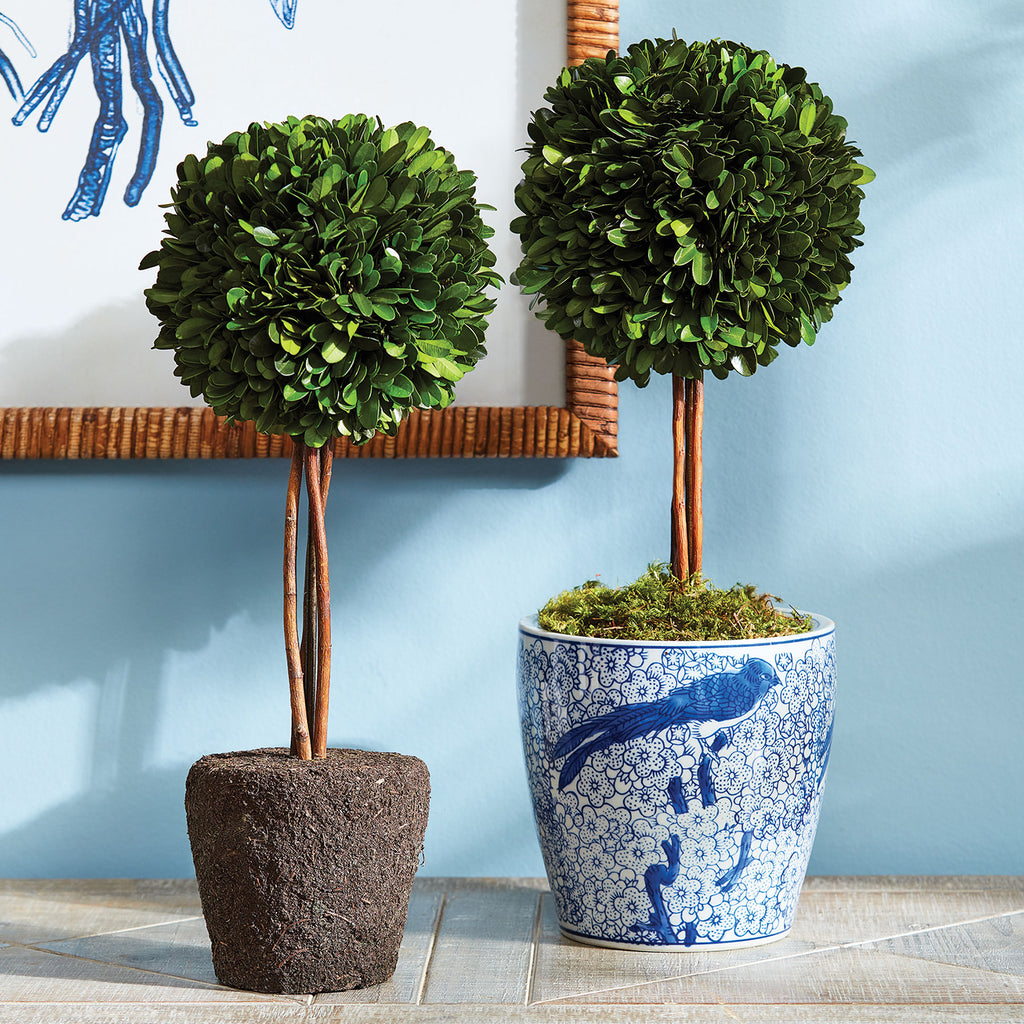 Introducing a novel idea, real English boxwoods with their own standard root ball, ready to drop in to your favorite vessel. It's never been easier. Preserved and painstakingly assembled by our masterful topiary artists, and now customizable to your choice of pot. The possibilities are endless!