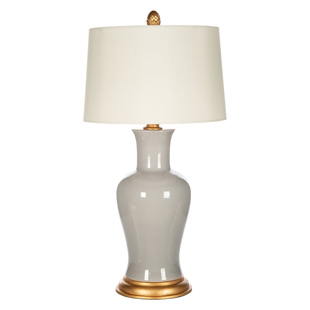 Elegance personified, this Amelie table lamp shows off the graceful curves of a fishtail profile. Its gray finish is accentuated with gold leaf base and finial details that create a warm, luxurious ambiance for a transitional design. An off-white drum shade sits atop and offers soft warmth to your decor.