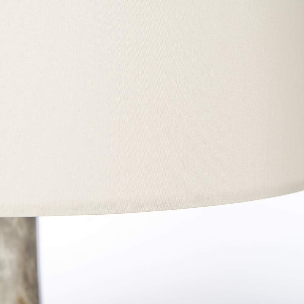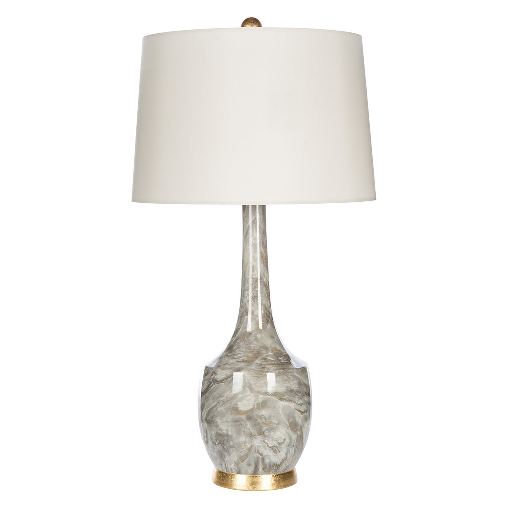 The exquisite look of marble stylized this transitional ceramic table lamp, giving it a truly versatile look that works in a variety of spaces. A beautifully sculpted ceramic base conjures nostalgic retro inspiration and an enticing gray marbled finish. Set atop a warm gold leaf base and crowned with a drum shade, it becomes a primary decor piece in a bedroom, entryway, or main living area.