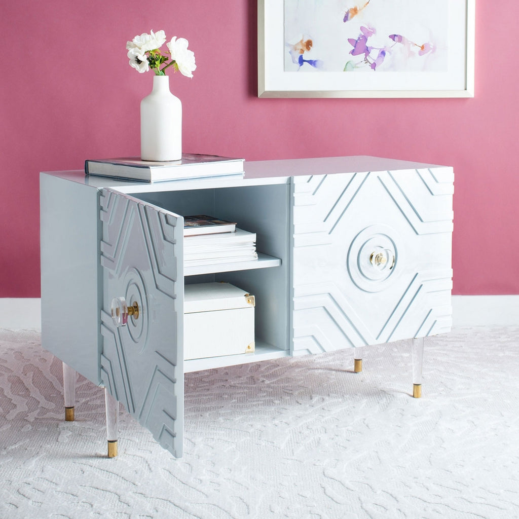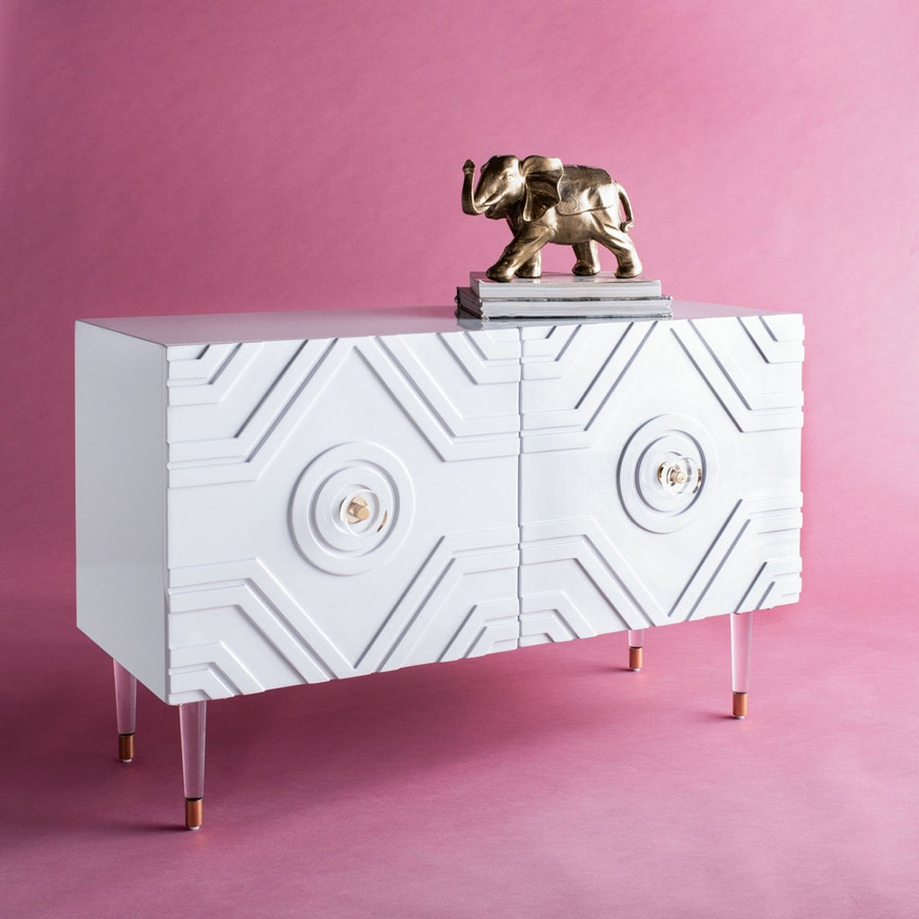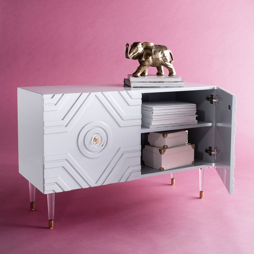 An expression of contemporary glamour, this alluring grey and gold diamond sideboard elevates the style of any dining room. Its deluxe solid wood craftsmanship highlights its exquisite raised diamond pattern, while its brass finish adds grace and warmth.