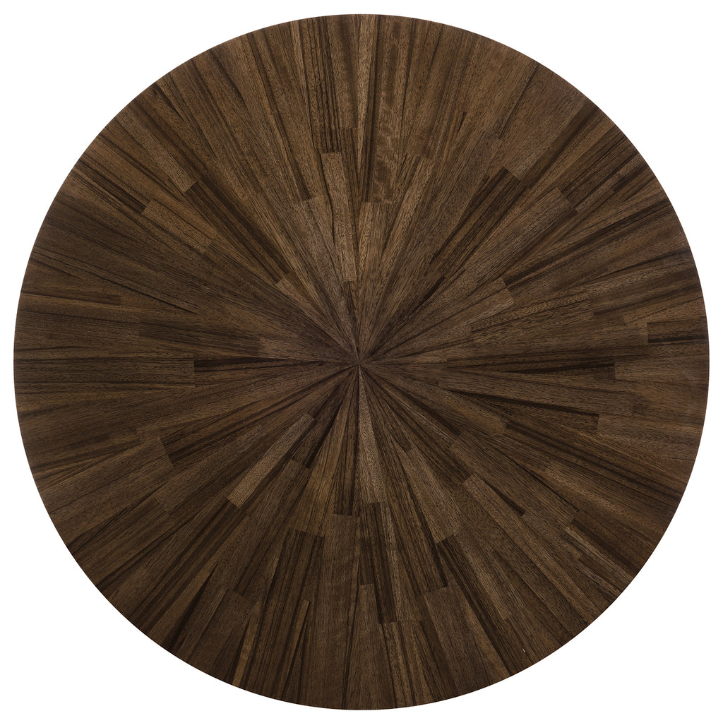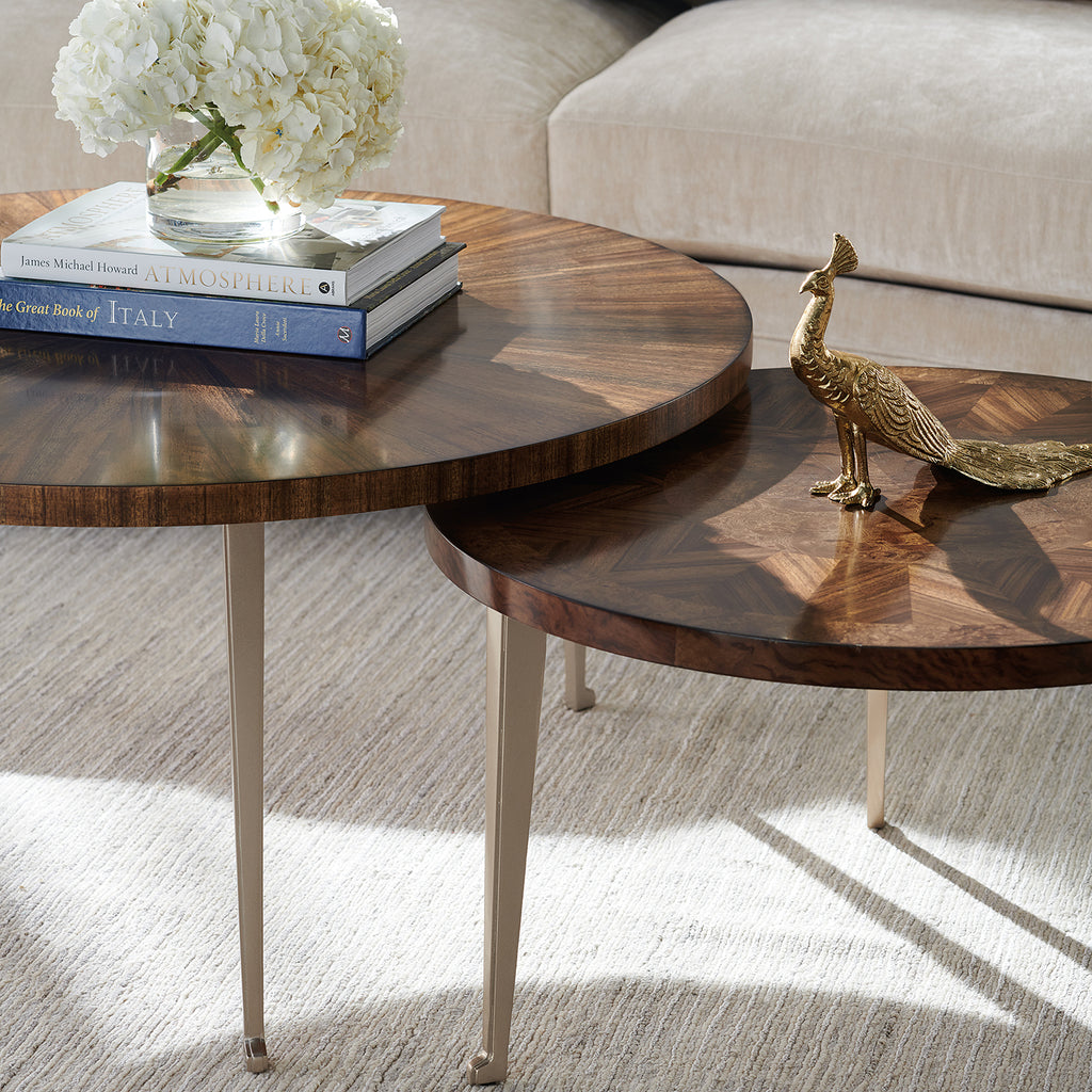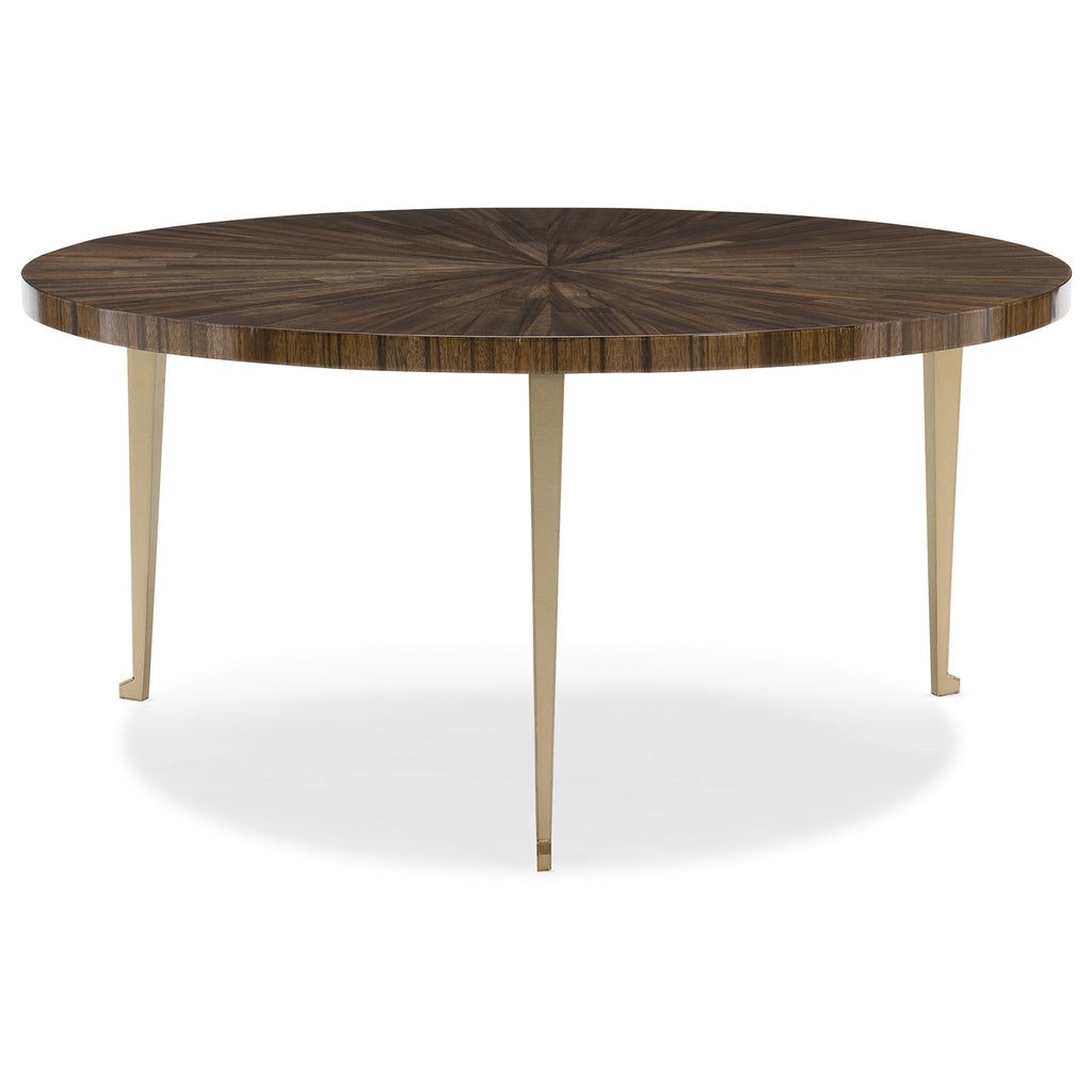 Here's a table you can’t help but love. Its deceptively simple design is as modern yet classic as the Hollywood Regency era. A warm Galway finish adds rich tonal color to its radial matched, quartered Paldao veneers while its three legs are finished in Golden Shimmer. The result is a one-of-a-kind look of refined elegance that adds balance and allure to a space.