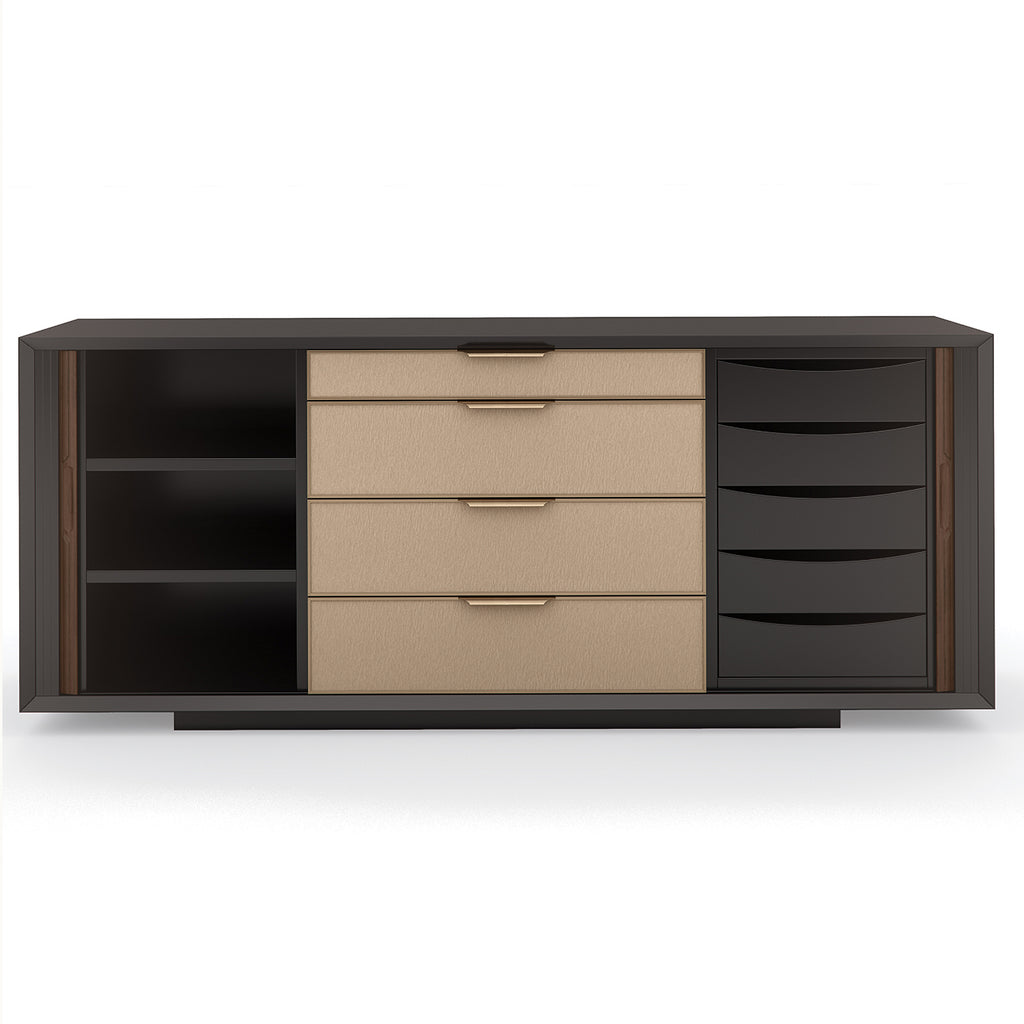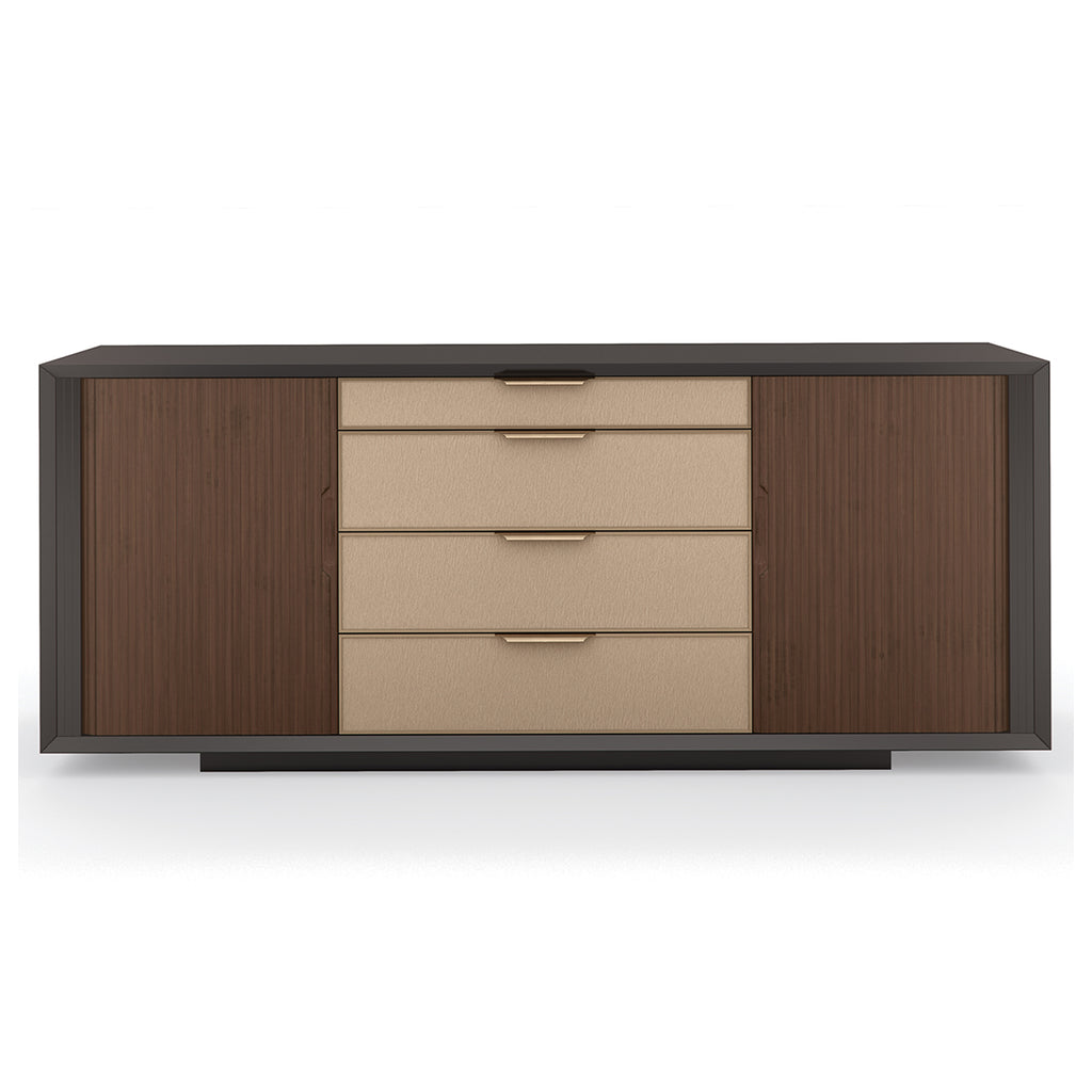 A masterful mix of form and function, this mid-century-inspired console stirs interest with its linear design and host of storage options. Sliding tambour doors in Rich Walnut add texture and contrast to a Dark Chocolate finish. Framed in Champagne Gold, four center drawers feature vinyl fronts, embossed with a pattern reminiscent of rain trickling down a windowpane. Expansive storage offers two fixed shelves on the left, offset by five soft close drawers on the right. Modern and multifunctional, its clean-lined design is well-suited for living, dining, and bedroom interiors.