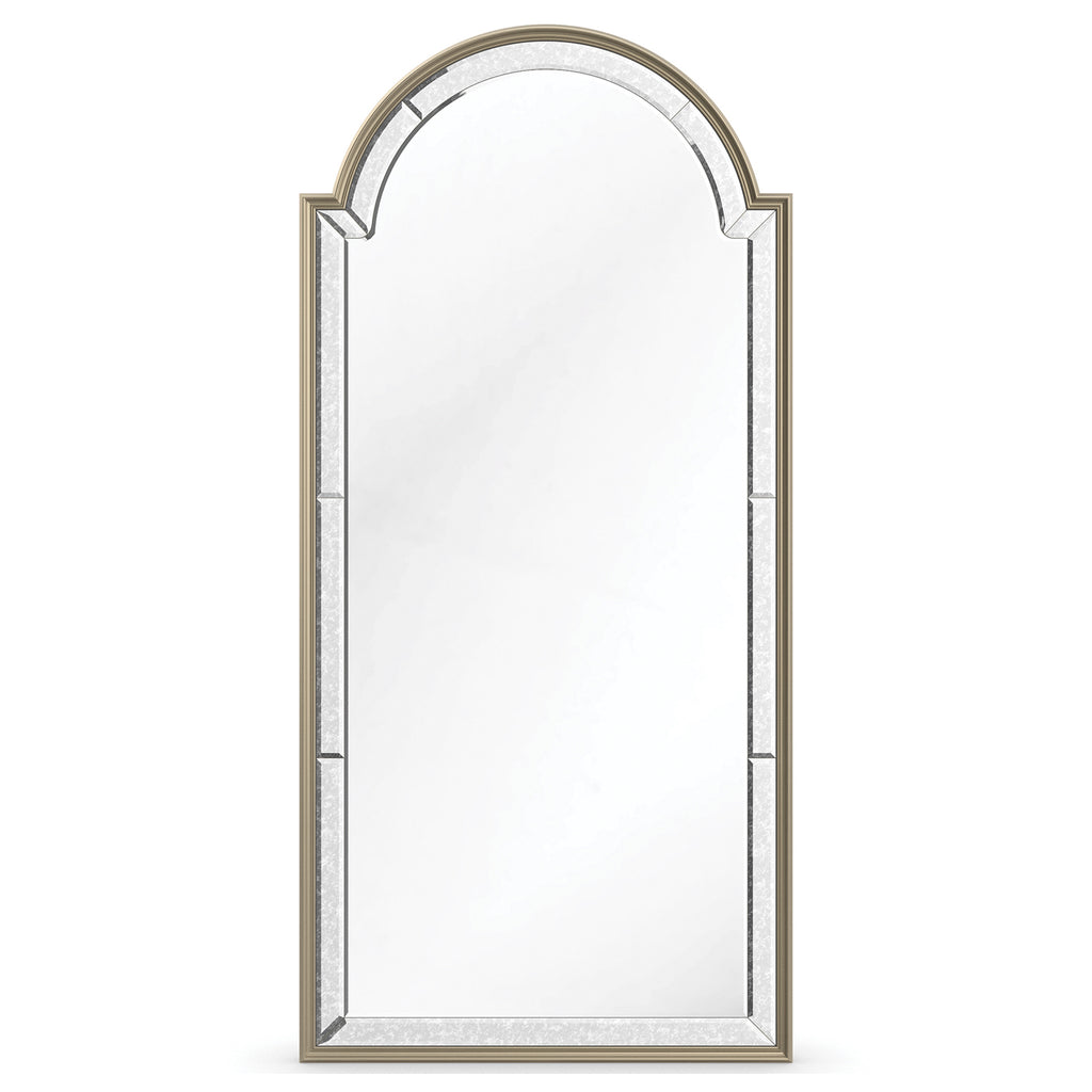 At nearly seven foot tall, this lavish floor mirror makes a grand statement, mixing casual glamour with the romance of a treasured antique. Designed to lean, rather than be hung, its classic Arabic window shape is framed in a Silver Shadow finish with an antique mirror border for a vintage aesthetic. Brightens a room and creates a sense of space; perfect for the boudoir, living or dining room.