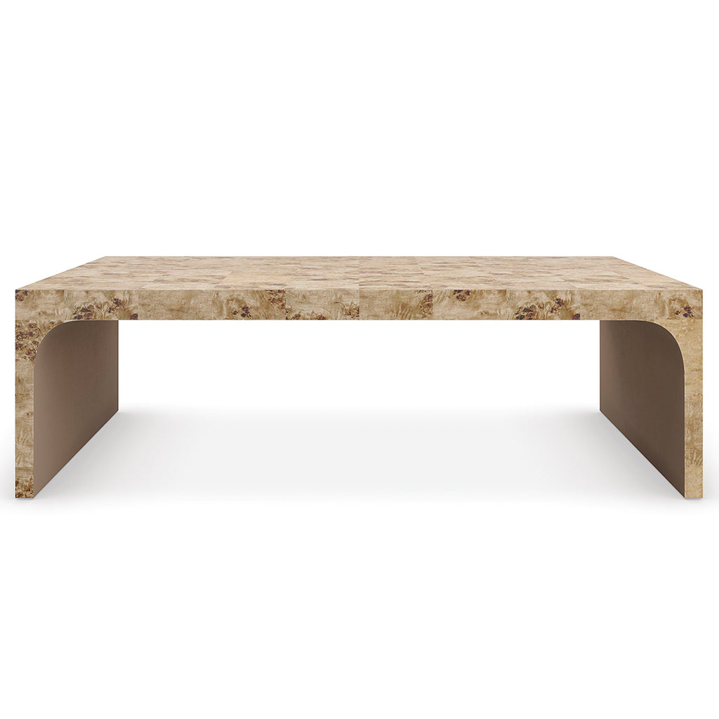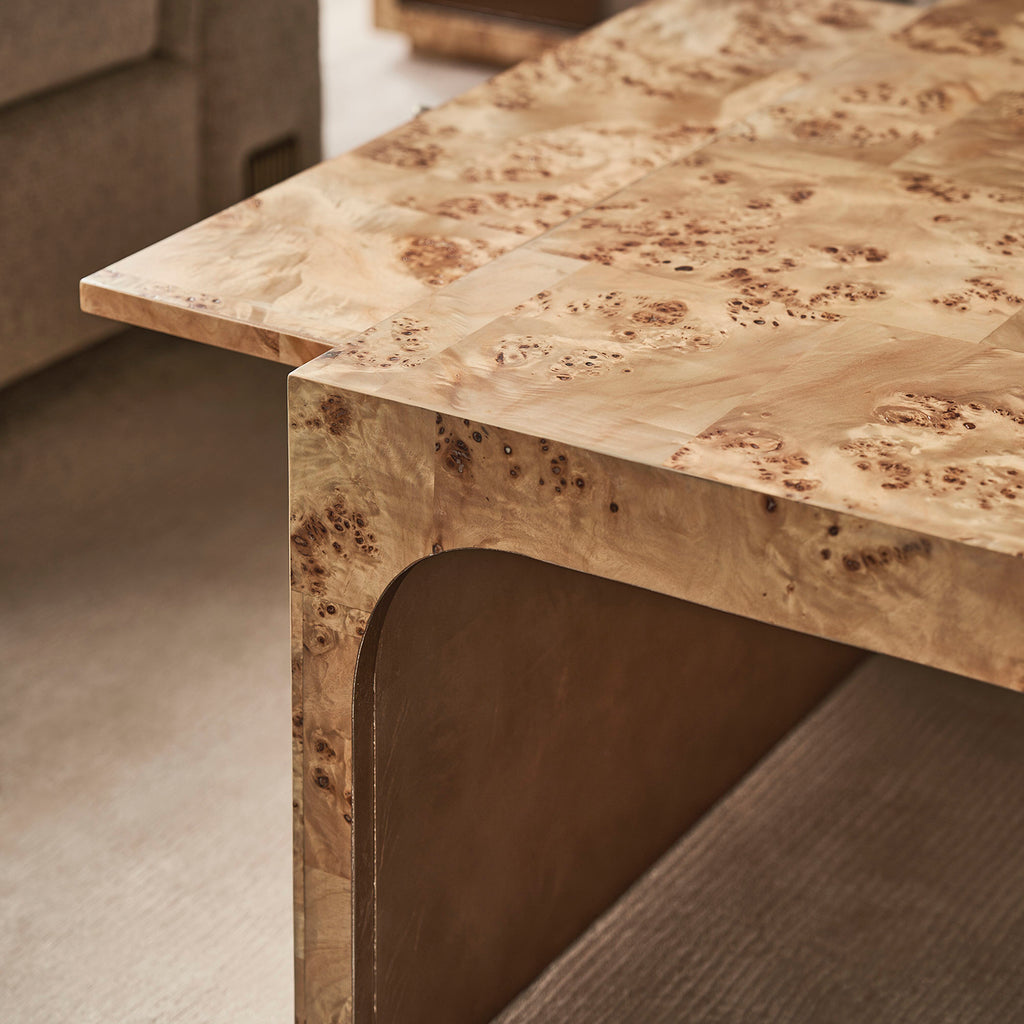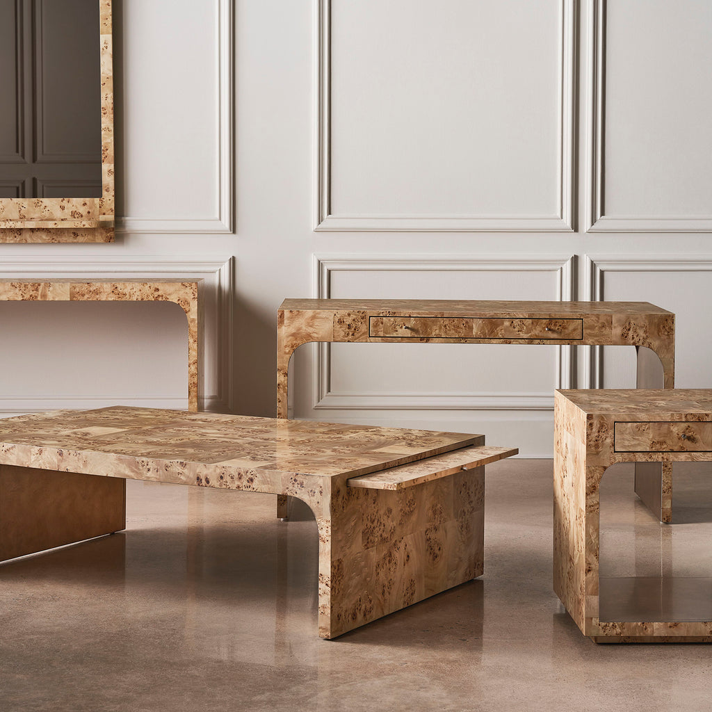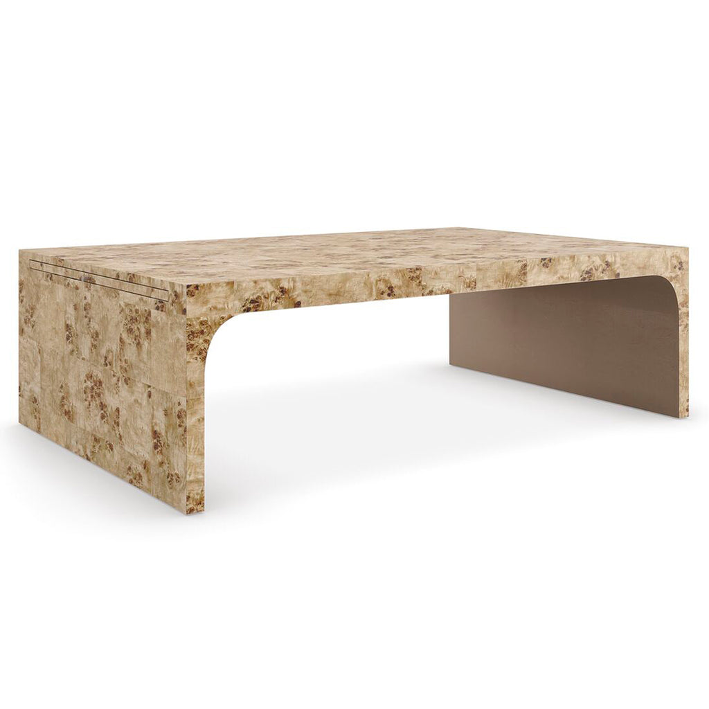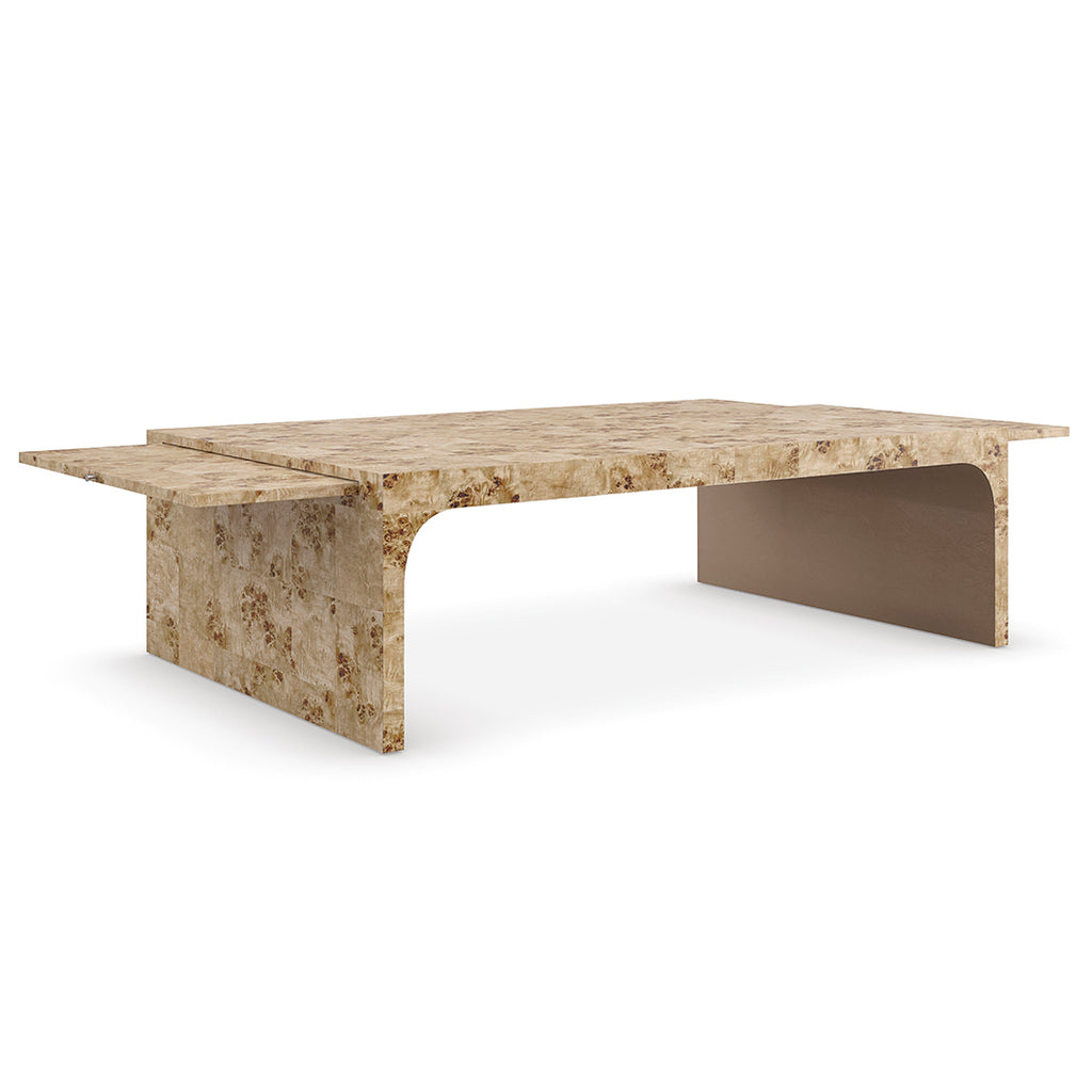 Classic in form and material, this multifunctional cocktail table makes an organic yet glamorous statement. Crafted from exotic mappa burl veneers, intricately pieced to showcase its highly figured, swirling grain. A Brazen bronze leaf finish underneath adds warm contrast and a soft glow. Features two pull-out trays on either end to extend the top surface when entertaining guests.