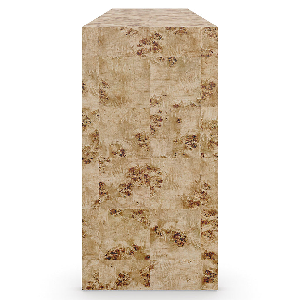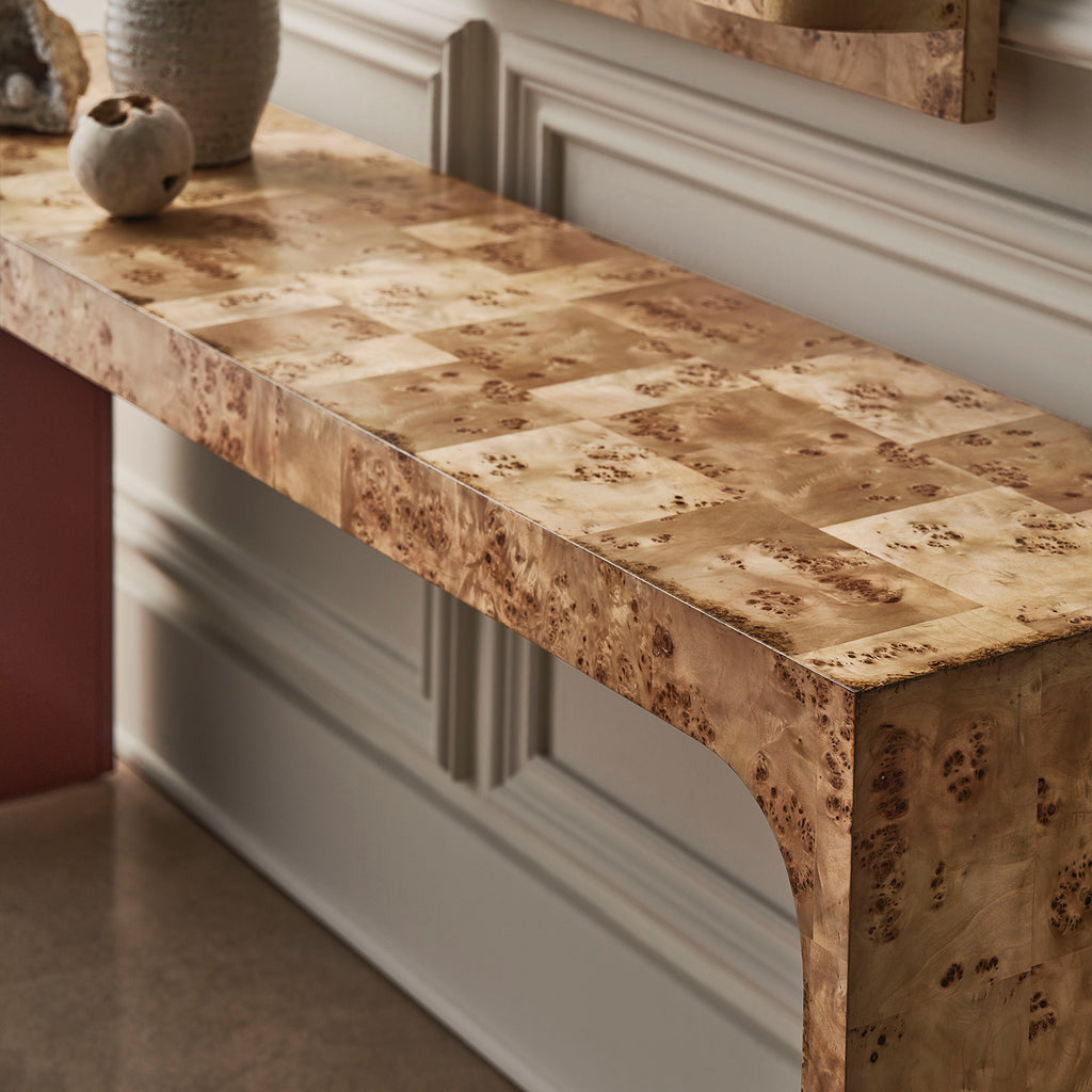 Make an unforgettable entrance with this striking console table, finished in exotic mappa burl veneers that have been intricately pieced to showcase the interplay of light and dark tones. A Rouge-painted interior adds a playful pop of color. Pair with our Burlesque mirror to create an eye-catching entry that exudes warmth and a natural elegance.
