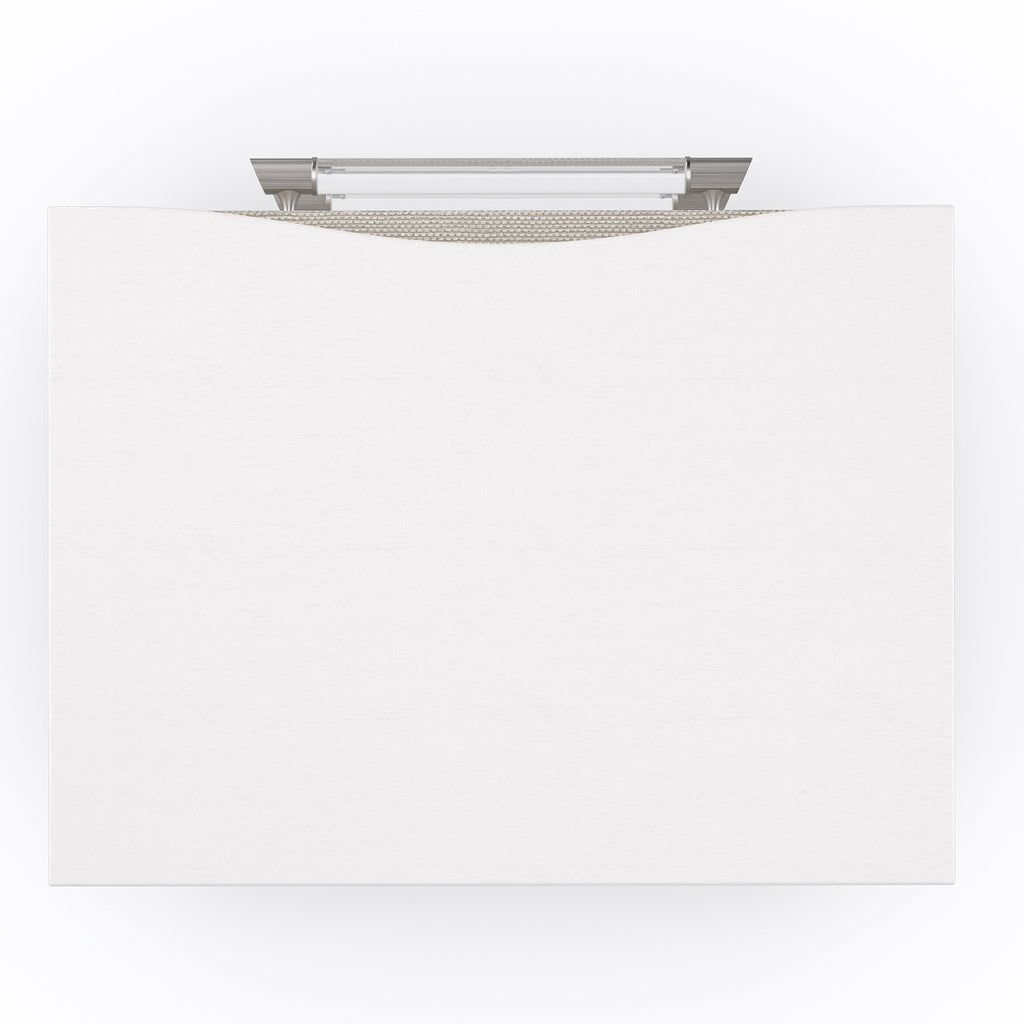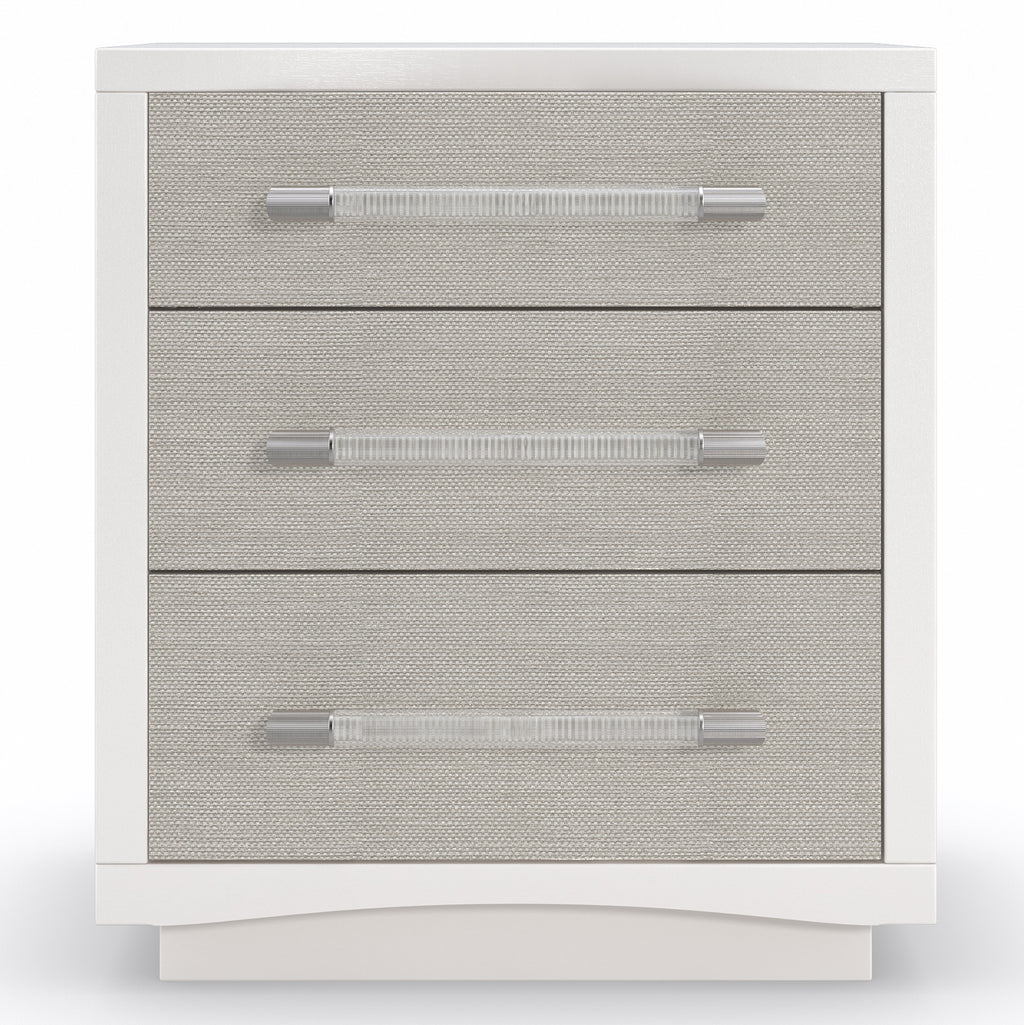 This elegant bedside table introduces a softly textured, metallic element with inherent organic character. Woven raffia drawer fronts are reimagined in Sun-kissed Silver, complemented by ash veneers in a Pearly White finish. For a distinctive finishing touch: clear acrylic drawer handles are capped in ribbed stainless steel. Features a USB port on the back for convenient charging and cutouts for wire management.