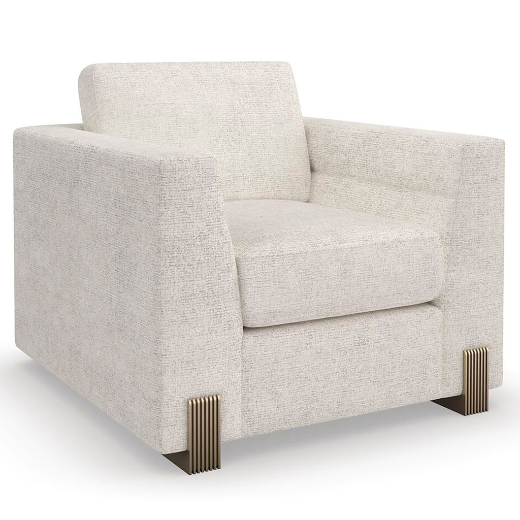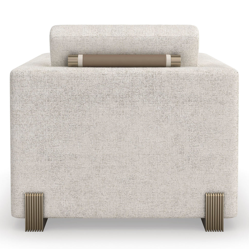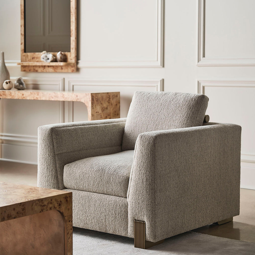 A perfect alignment of texture, material and design intention lends a soft-lined yet sophisticated style to seating areas. Dressed in an oatmeal melange woven fabric with subtle rust threading, its comfortable design features channel-tufted arms and a loose back cushion, propped by a faux-leather-wrapped, counter balance capped in Champagne Gold. Reeded cast legs add tactile appeal and a note of distinction.