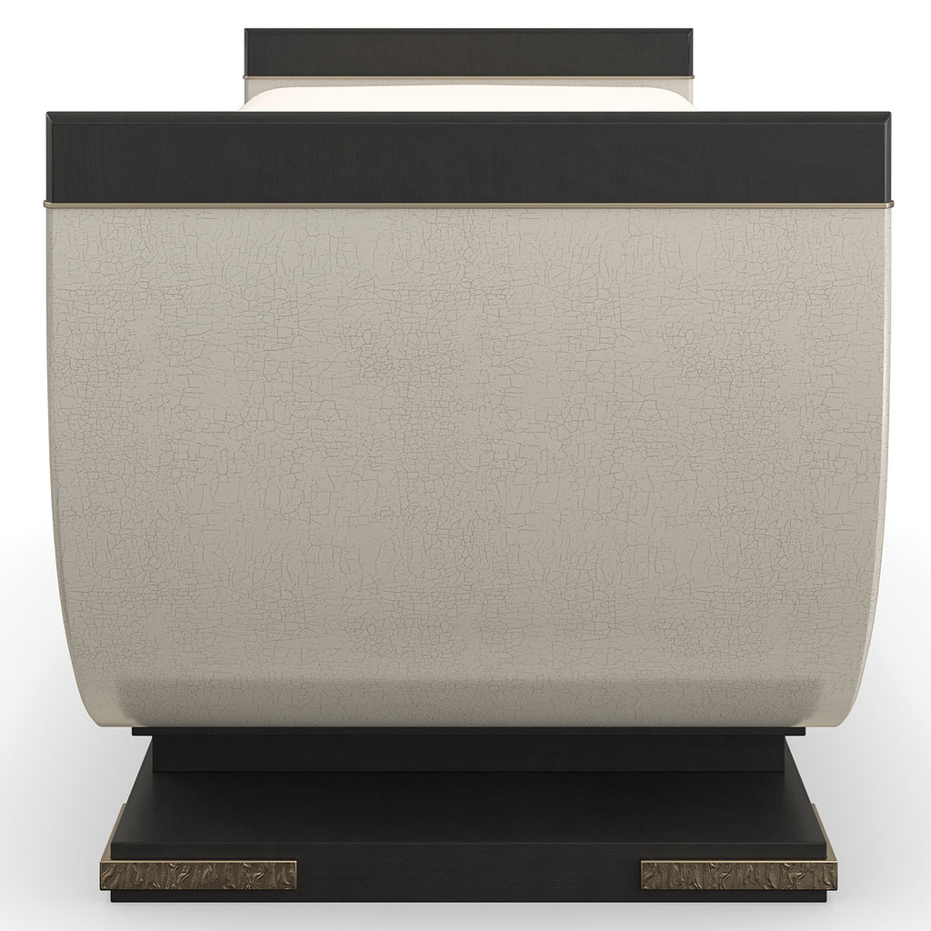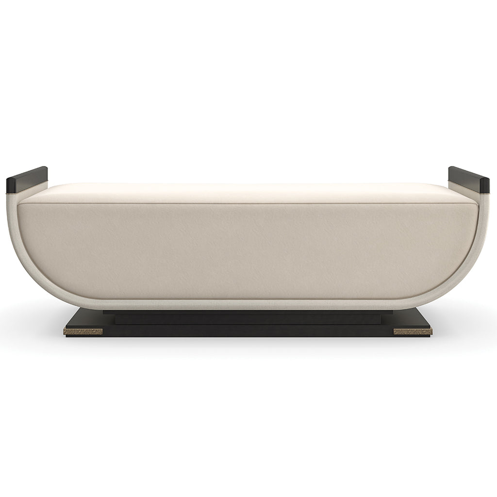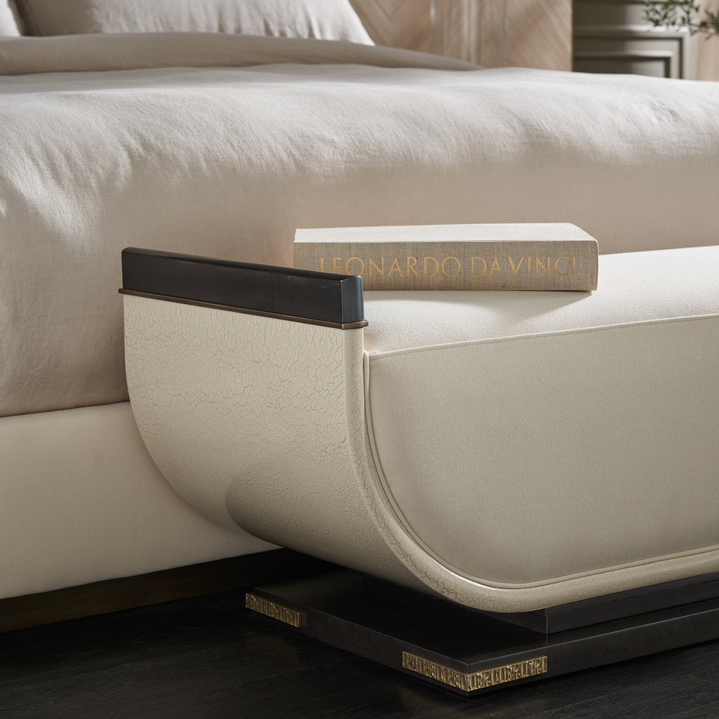 With a classic form inspired by an ancient Greek ceremonial vessel, this end of bed bench brings an exquisite mix of detail and materiality. Features a plush upholstered front and seat, embraced by a curved poplar frame in an Ivory Craze crackle finish. A Charred Bark finish on the cap rails and base adds depth and rich contrast, accentuated by a wood bead detail and tactile Brushed Gold brackets. Makes a luxe landing for bedrooms and dressing areas, or style in an entryway to make an unforgettable first impression.