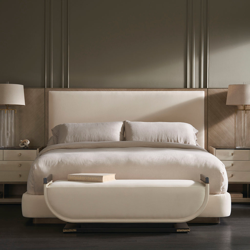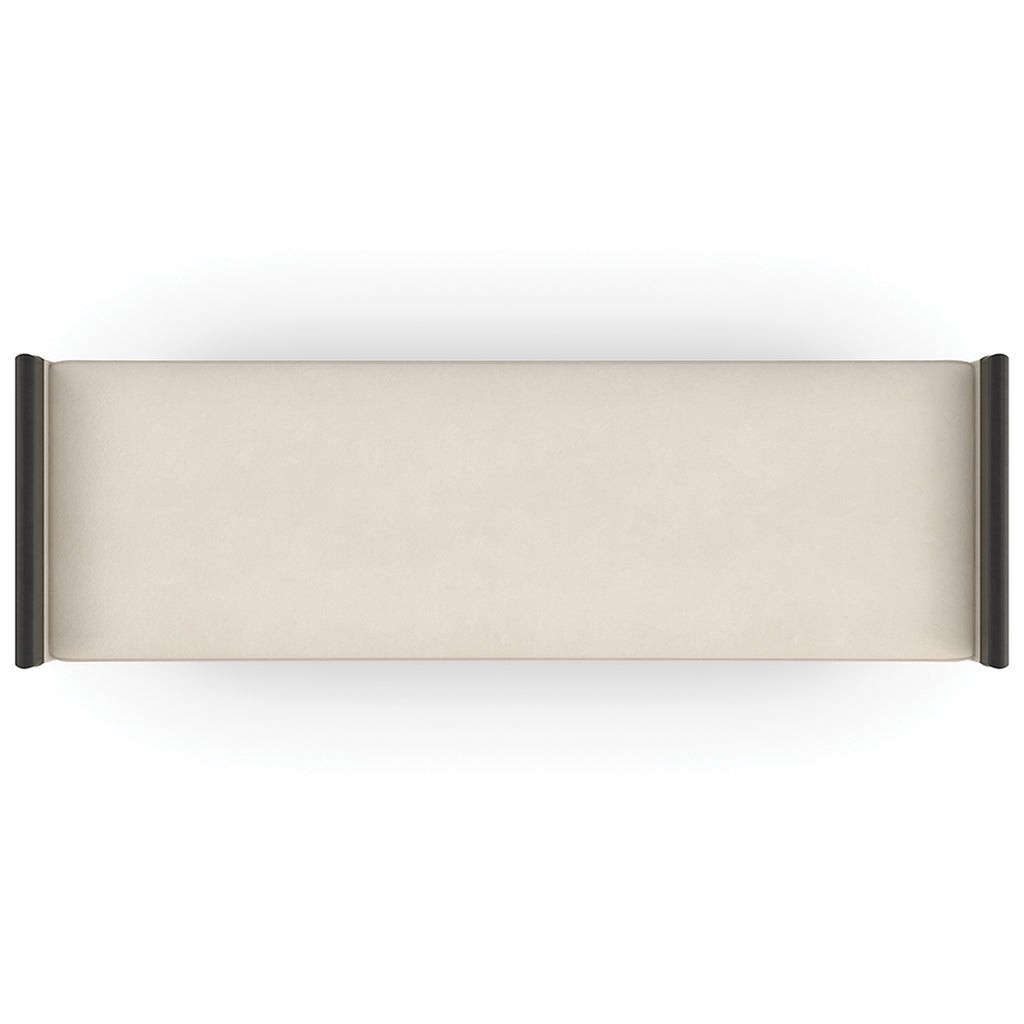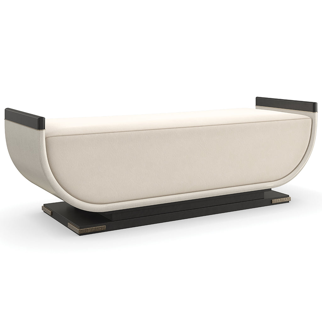 With a classic form inspired by an ancient Greek ceremonial vessel, this end of bed bench brings an exquisite mix of detail and materiality. Features a plush upholstered front and seat, embraced by a curved poplar frame in an Ivory Craze crackle finish. A Charred Bark finish on the cap rails and base adds depth and rich contrast, accentuated by a wood bead detail and tactile Brushed Gold brackets. Makes a luxe landing for bedrooms and dressing areas, or style in an entryway to make an unforgettable first impression.