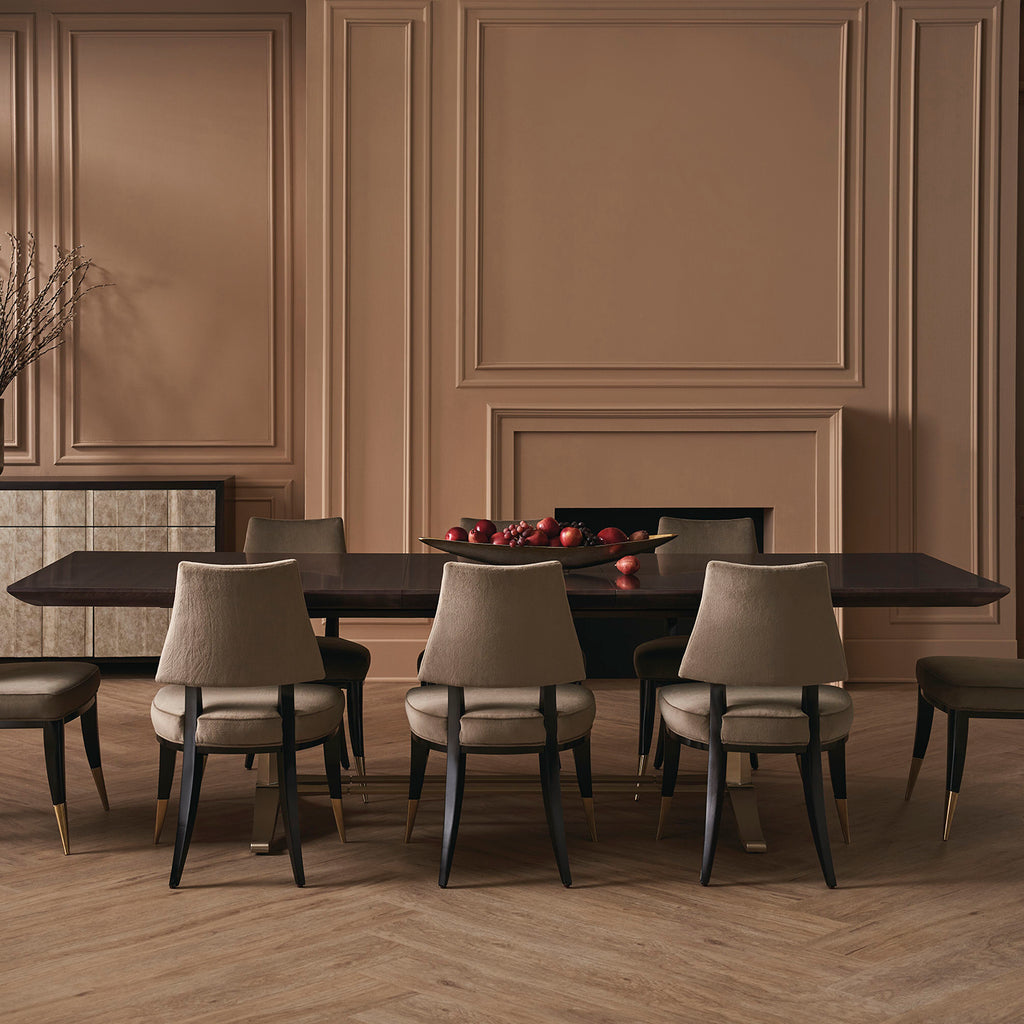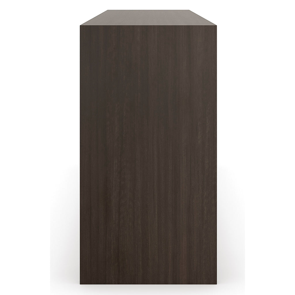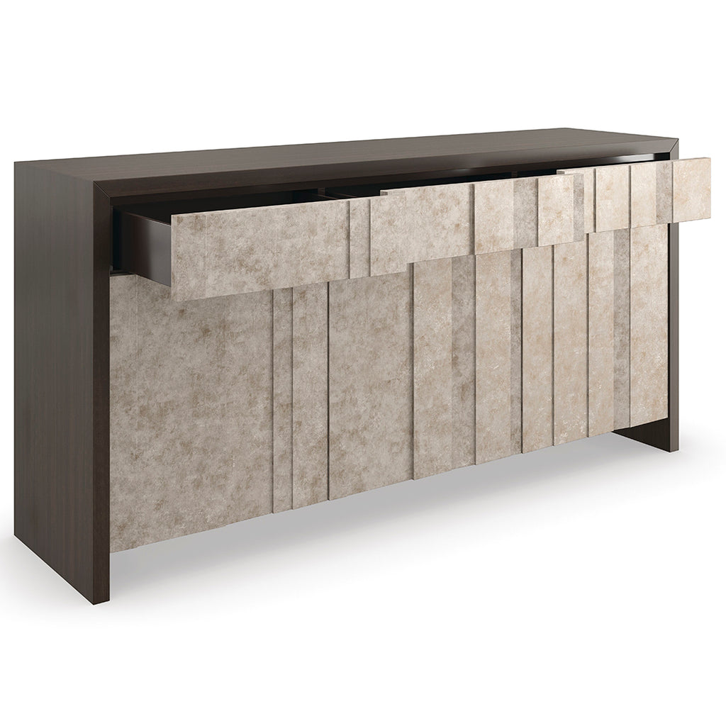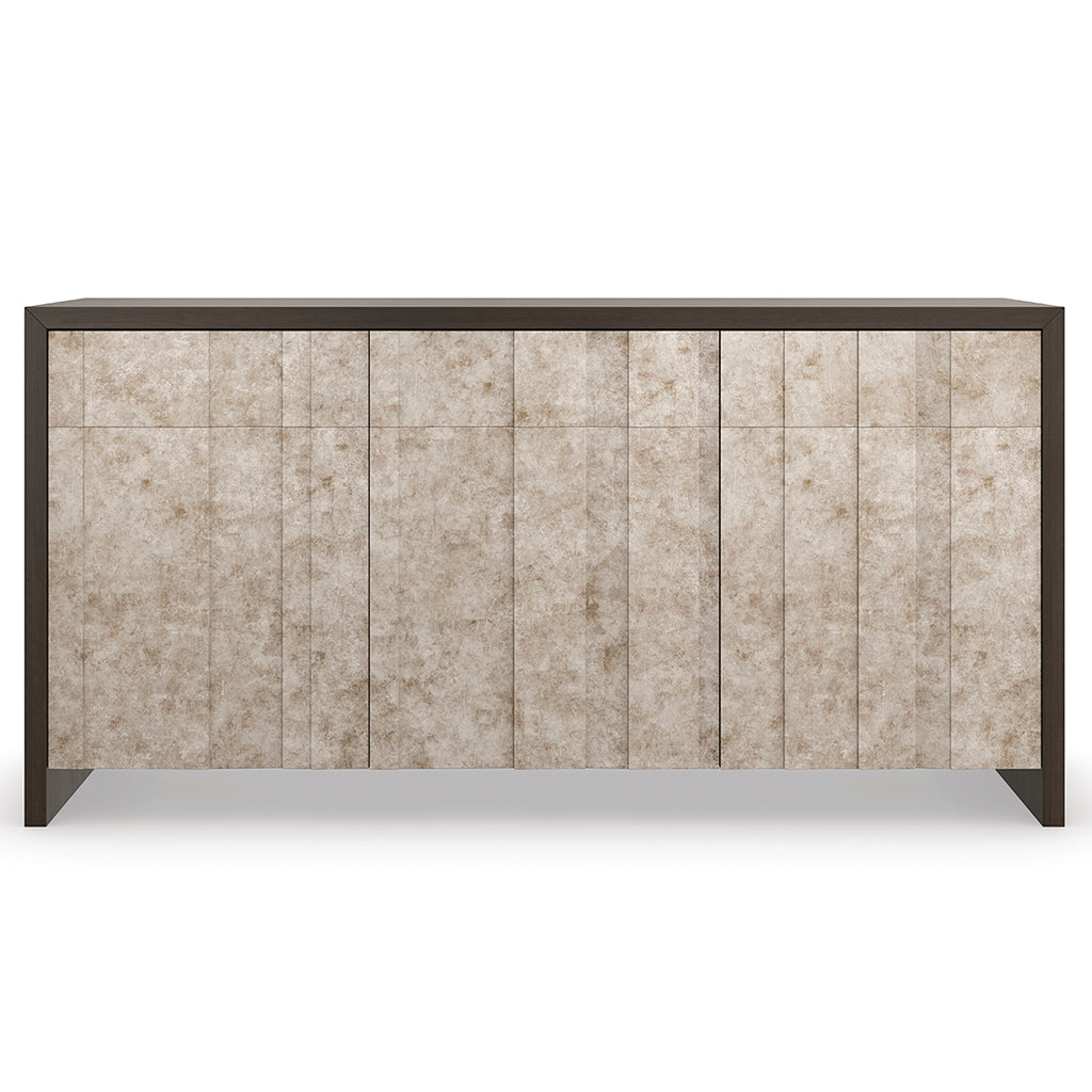 With a warm shimmer reminiscent of mica minerals, this multifaceted sideboard introduces an interplay of light and shadow. Applied by hand, Intricately pieced silverleaf wraps touch-latch doors and drawers of varying dimensions for added depth and reflection. Its Dark Chocolate-painted interior features adjustable shelves behind each door for streamlined storage, intentionally styled to make a statement in any interior.