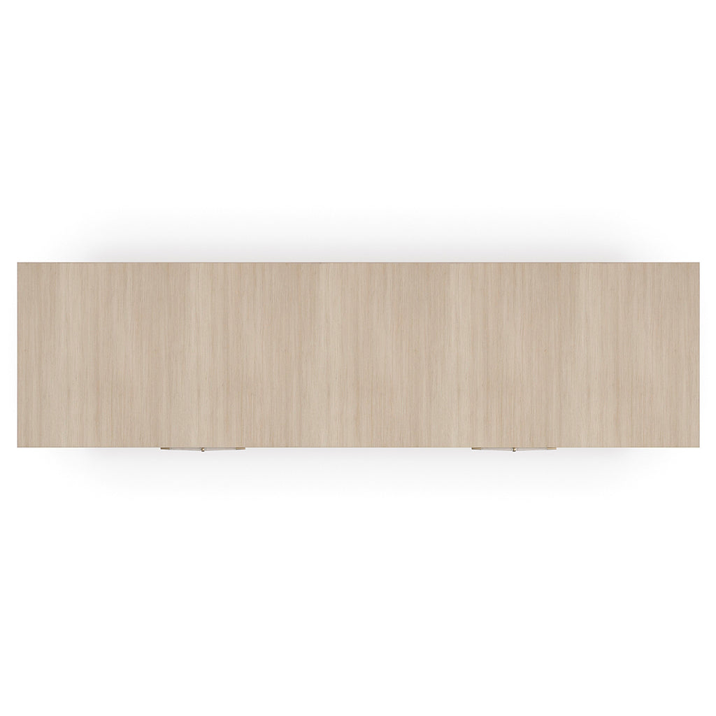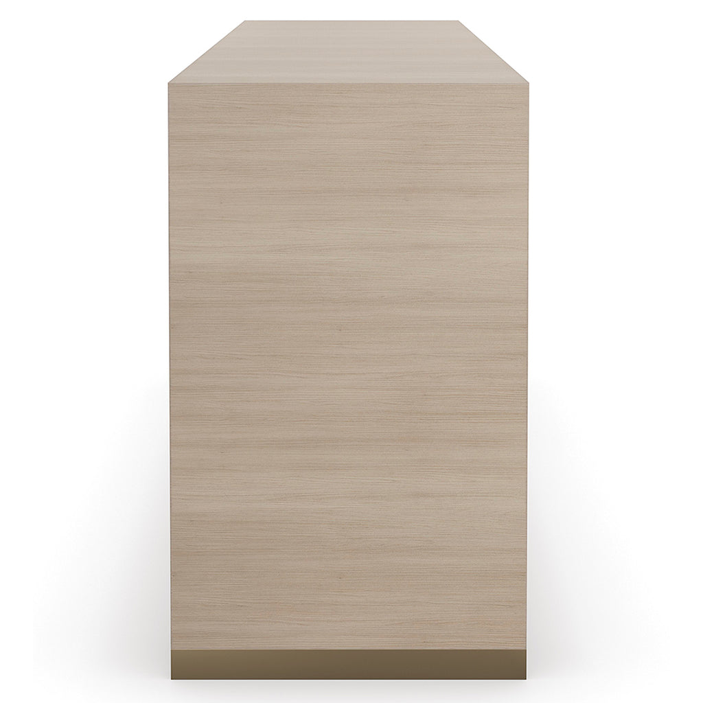 A refined assemblage of materials, the Caracole Hang Up dresser melds the beauty of wood with the allure of metal. Drawing the eye: drawer fronts in an ambiguous broken metallic leaf that takes on the shimmer of a frost-covered, candle lit window. A recessed metal frame adds depth and dimension, complemented by tapered pulls, wrapped in hand-stitched faux leather and accented by brushed gold and nickel. Features linen-painted interiors with top drawer dividers and a removable jewelry tray.