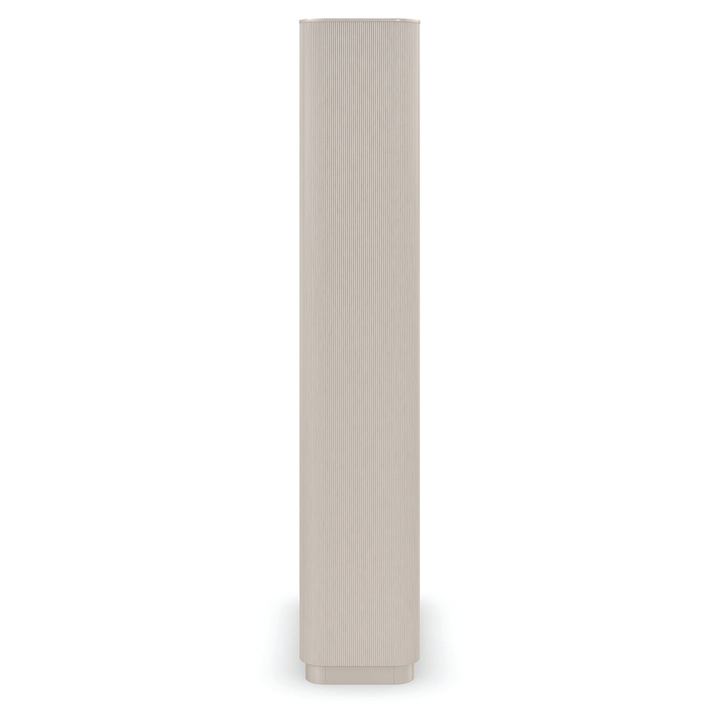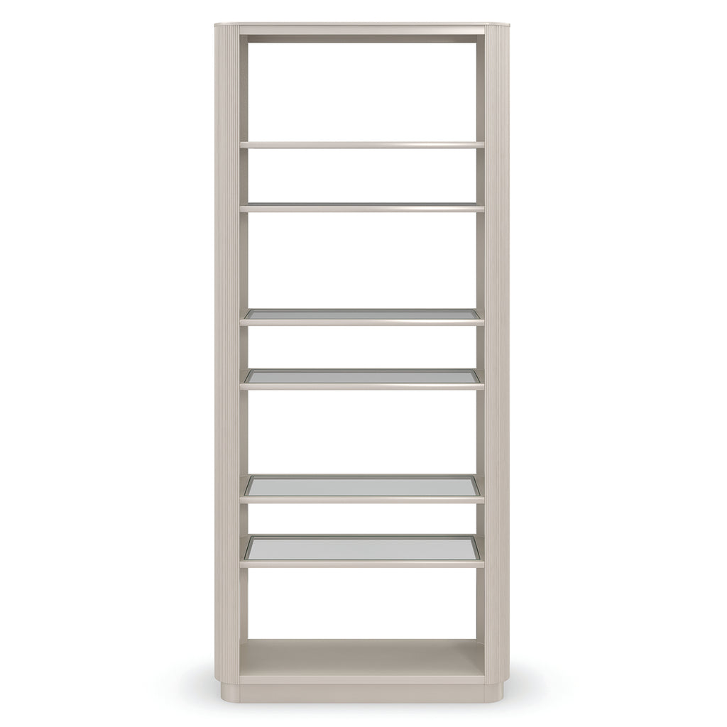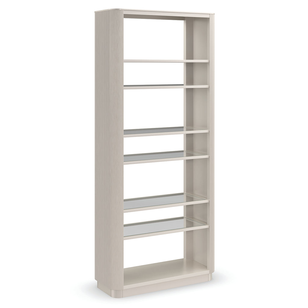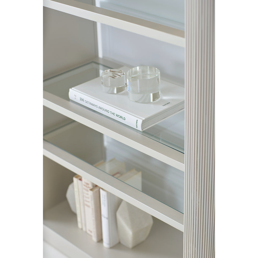 Elevate display for curated books and collectibles with this tall bookcase, crafted in Birch and Maple veneers in a Matte Pearl finish. Narrow reeding and softly rounded edges create a tactile frame for wood-rimmed glass shelves that allow for light and reflection. Style one or more against a wall to make an impact, or float away from the wall to divide an open space.