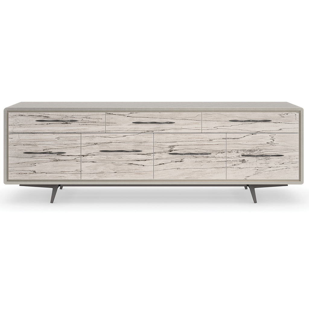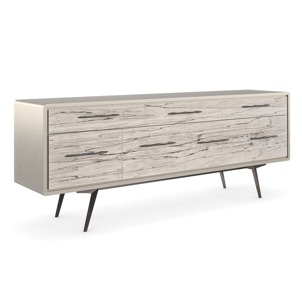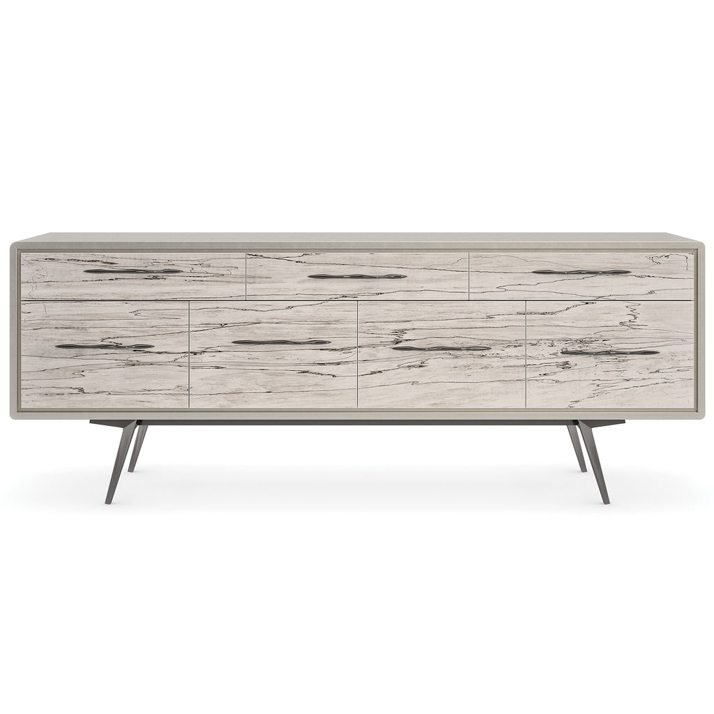 An artful interpretation of found beauty in the natural world, this clean-lined credenza brings a look of casual luxury to living interiors. Masterfully crafted with top drawer fronts and bottom doors in Snowcap Organic–our exclusive, bleached white printed spalted maple veneer–and encased in a Matte Pearl finish for a hint of shimmer. Custom hardware adds interest and emulates the marble-like veining of spalted maple. Features cutouts in the back for wire management, and adjustable metal legs that allow you to raise the height for a more traditional console, or lower it to accommodate media.