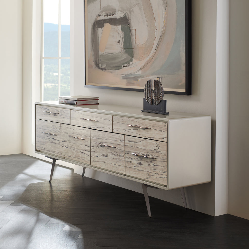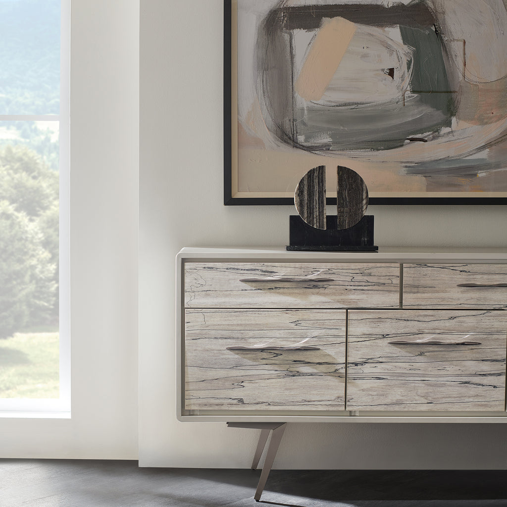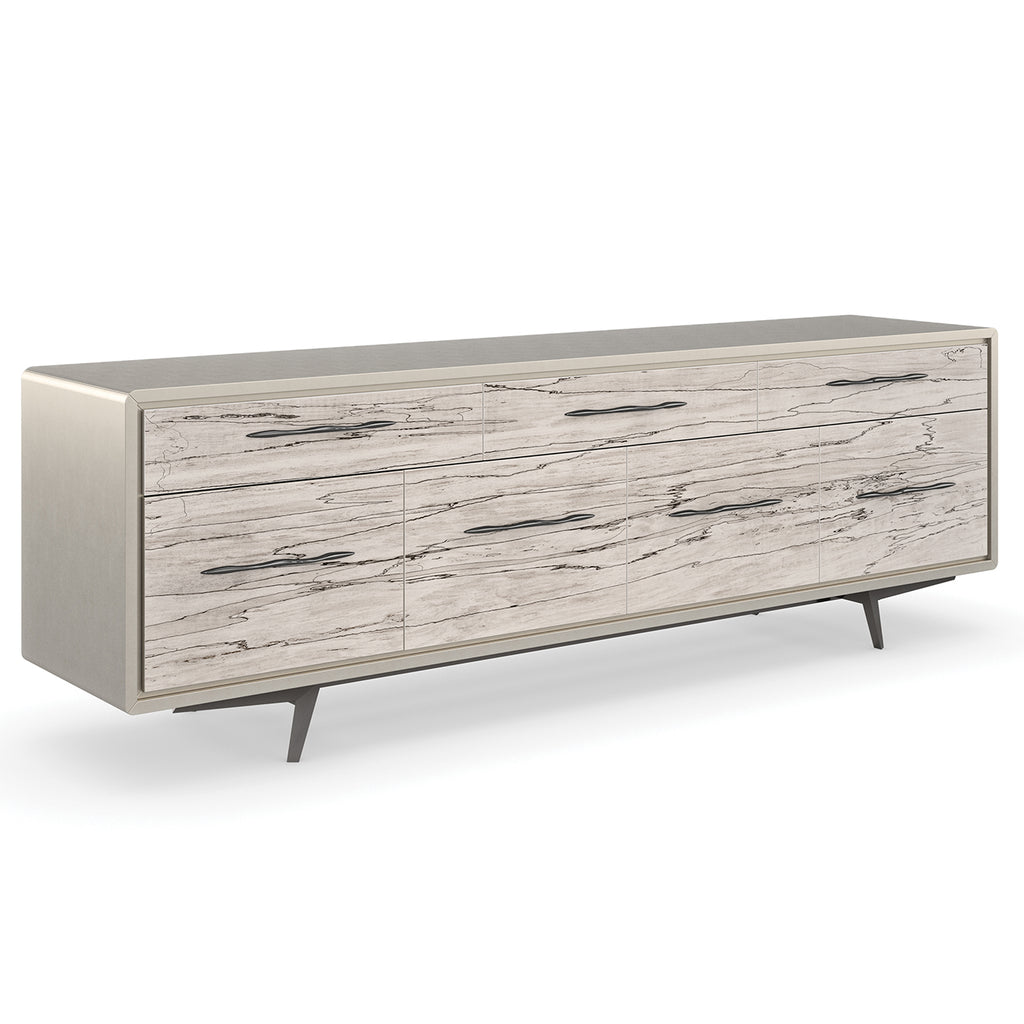 An artful interpretation of found beauty in the natural world, this clean-lined credenza brings a look of casual luxury to living interiors. Masterfully crafted with top drawer fronts and bottom doors in Snowcap Organic–our exclusive, bleached white printed spalted maple veneer–and encased in a Matte Pearl finish for a hint of shimmer. Custom hardware adds interest and emulates the marble-like veining of spalted maple. Features cutouts in the back for wire management, and adjustable metal legs that allow you to raise the height for a more traditional console, or lower it to accommodate media.